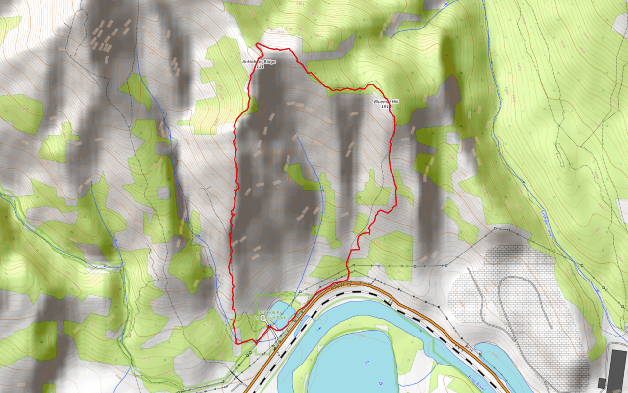 View back, from the other side of the dip. Note how the ridge doesn't follow a straight line from Anklebiter to Bluemat...so be careful not to stray too far from the crest and end up down a slope leading who-knows-where!