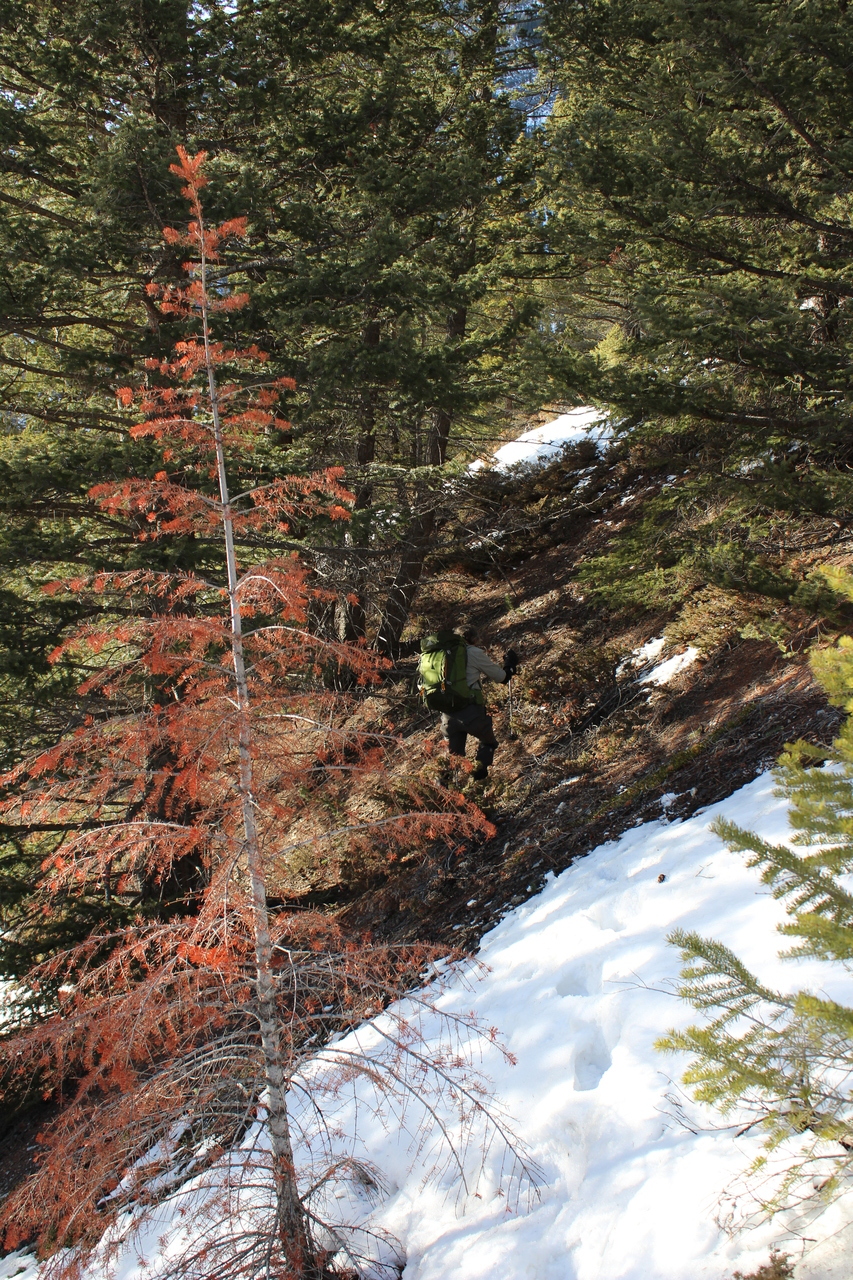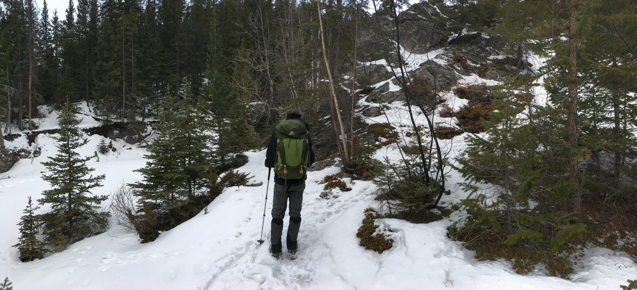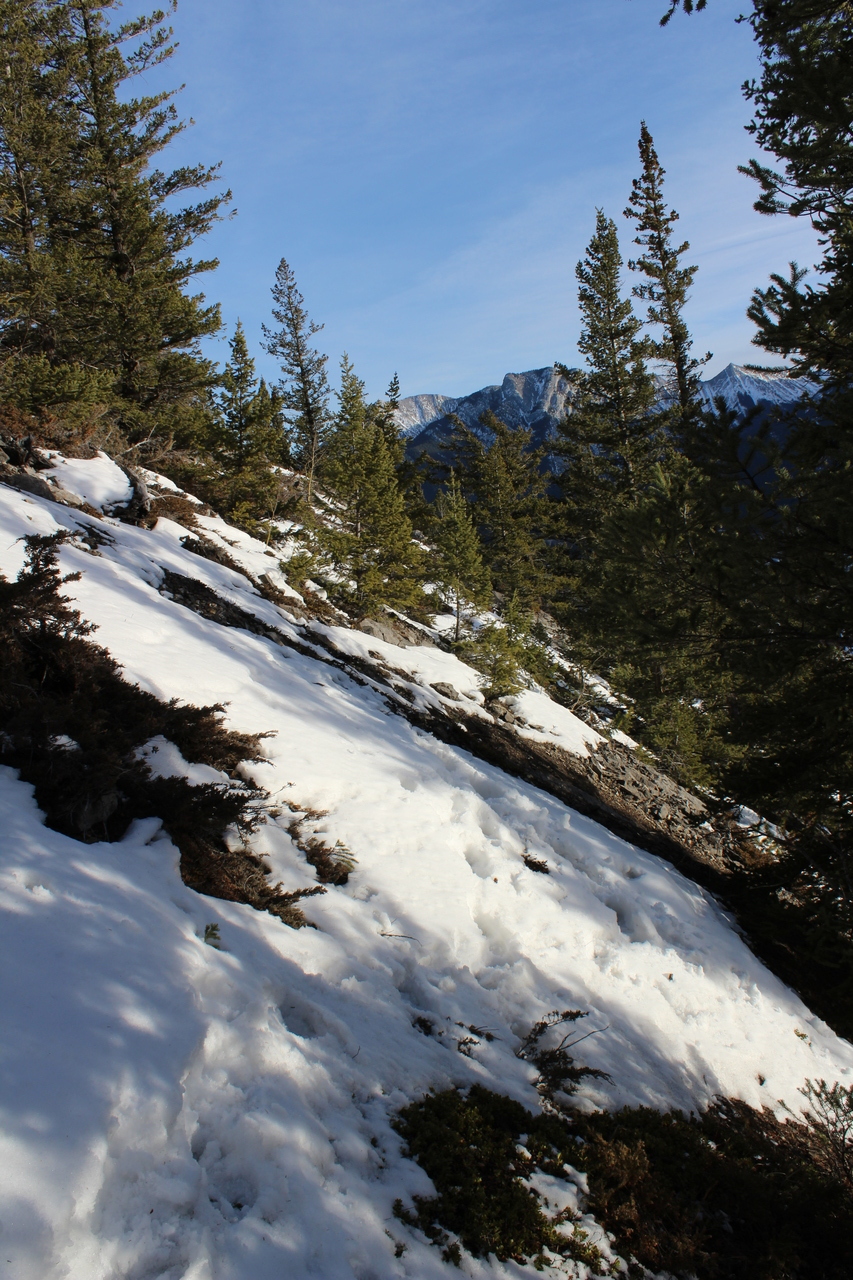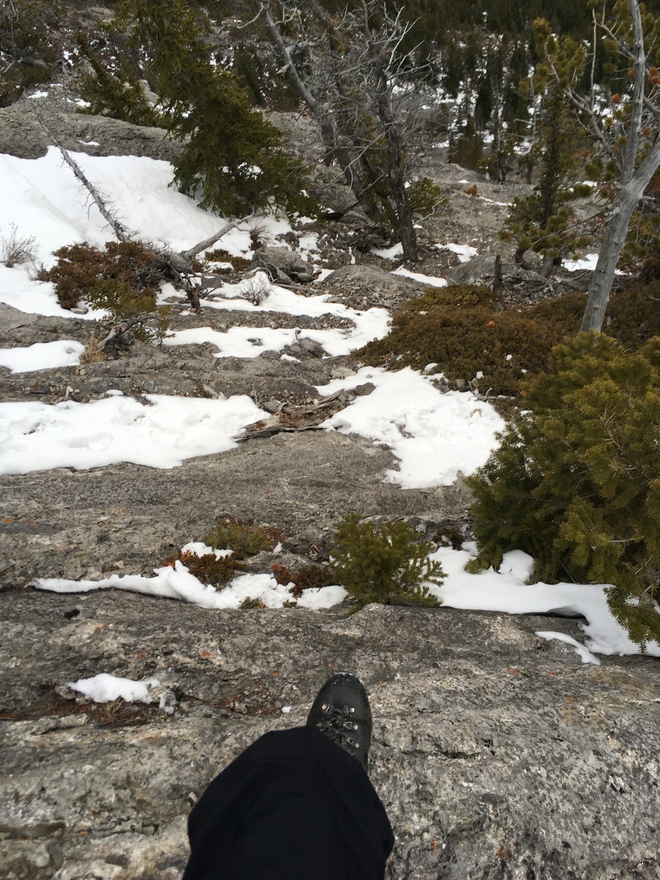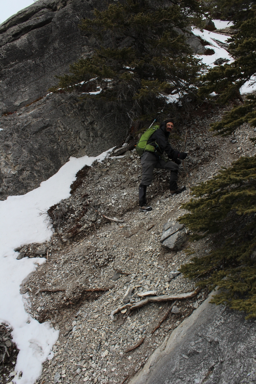 Looking back at the traverse. Although the sun was beating down, and this south facing slope was heating up quickly, the ground was still frozen and quite slick in hiking boots...Needless to say, we would soon be putting microspikes on!