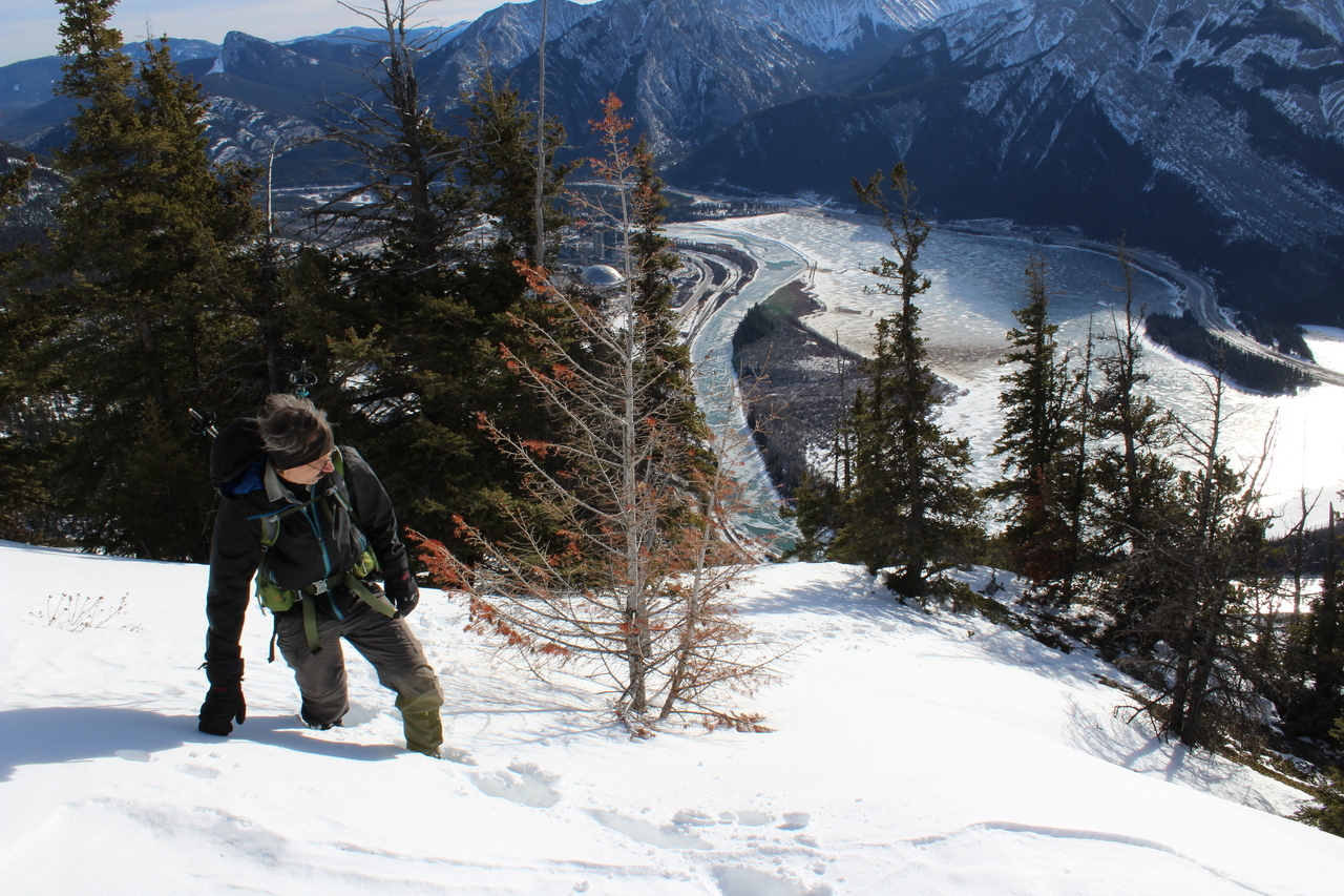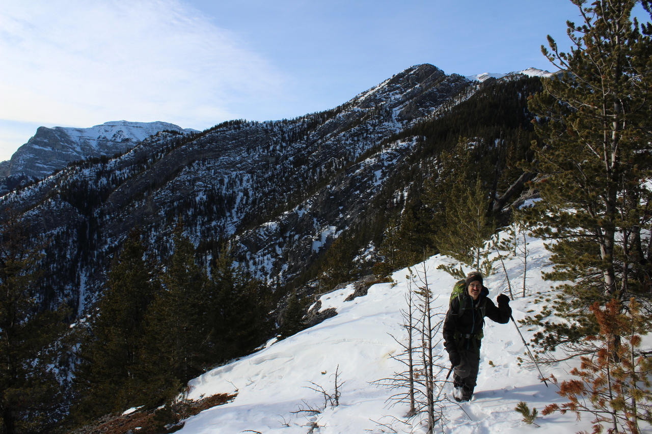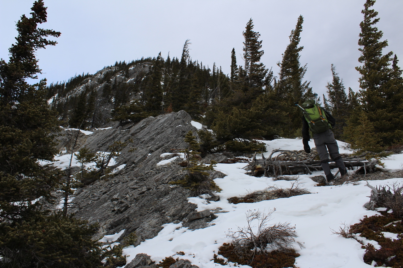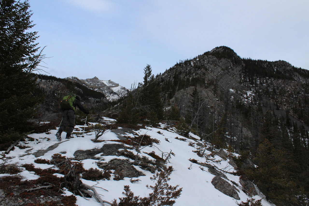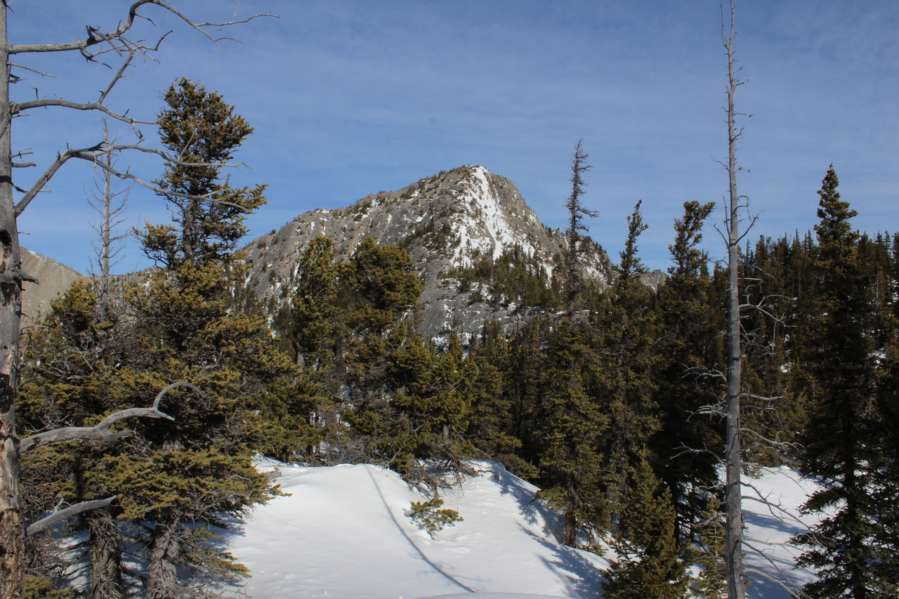 Looking across Grotto Pond, to the first highpoint of Anklebiter Ridge...the summit is still a ways beyond. Although the wind was quite taxing at times, it allows for this loop to make for a good off-season objective, offering unique views across Lac des Arcs and an uninterrupted view of Mount Fable! Just make sure you do the loop clockwise (Anklebiter first), so you're descending most of the deep snow on the sheltered traverse to Bluemat, not struggling up it (much easier when gravity helps do the work for you ;) )!