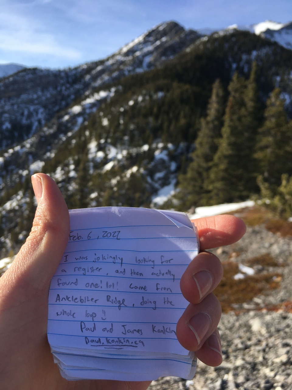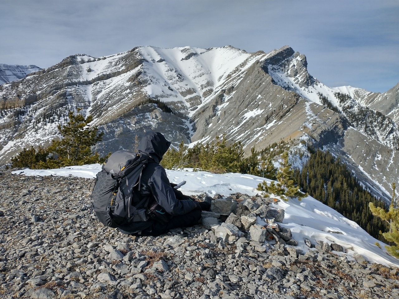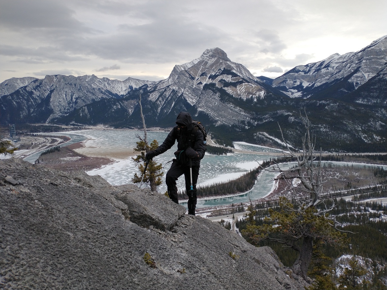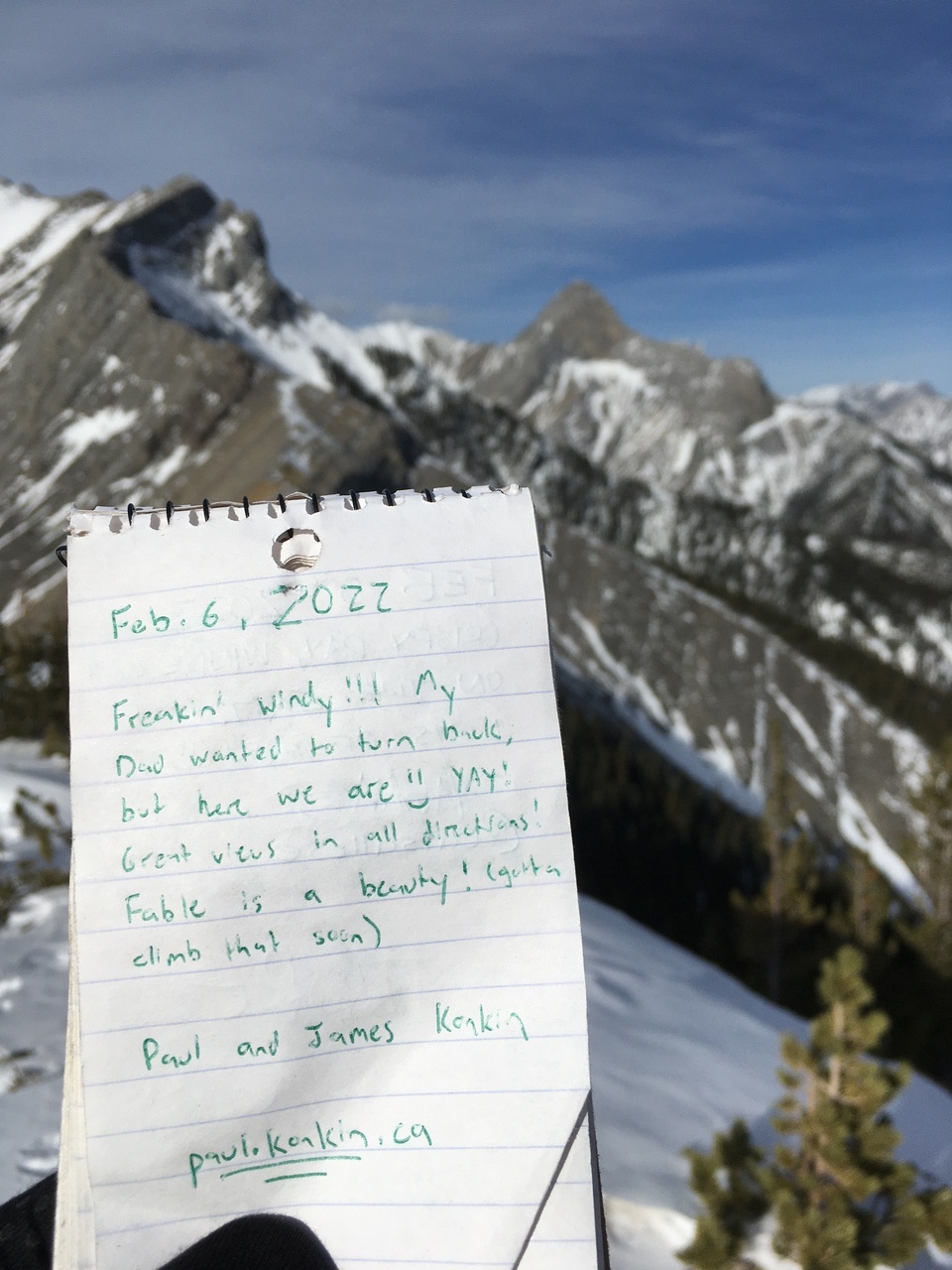 Looking across Grotto Pond, to the first highpoint of Anklebiter Ridge...the summit is still a ways beyond. Although the wind was quite taxing at times, it allows for this loop to make for a good off-season objective, offering unique views across Lac des Arcs and an uninterrupted view of Mount Fable! Just make sure you do the loop clockwise (Anklebiter first), so you're descending most of the deep snow on the sheltered traverse to Bluemat, not struggling up it (much easier when gravity helps do the work for you ;) )!