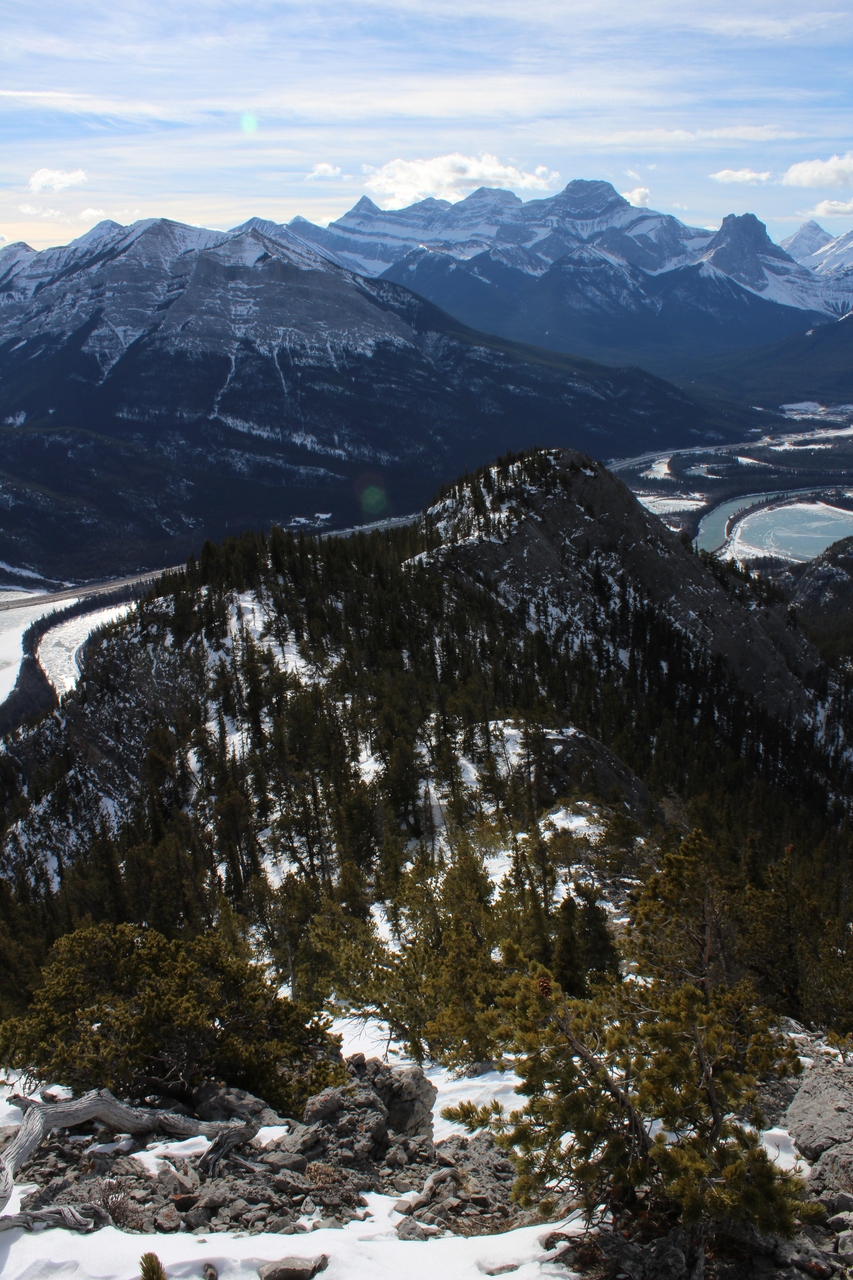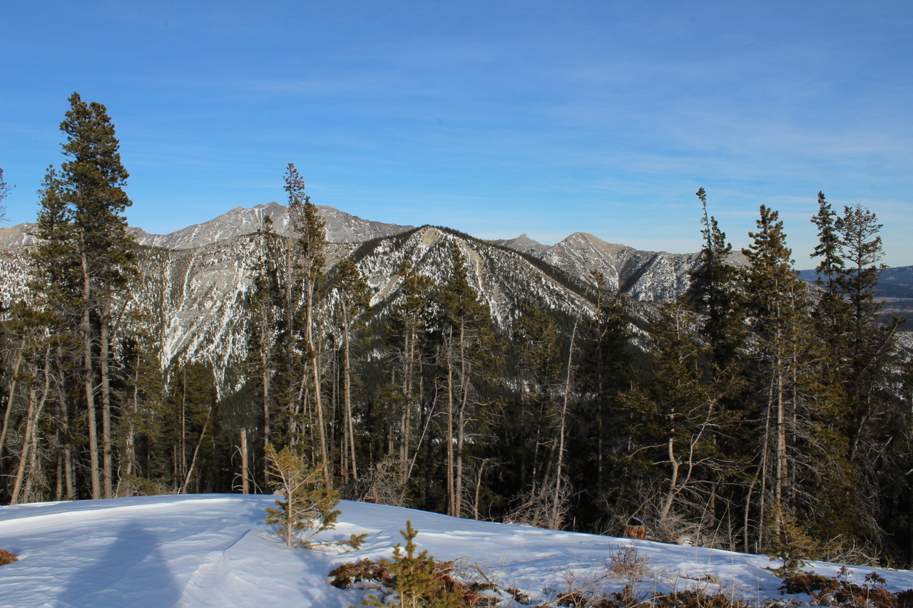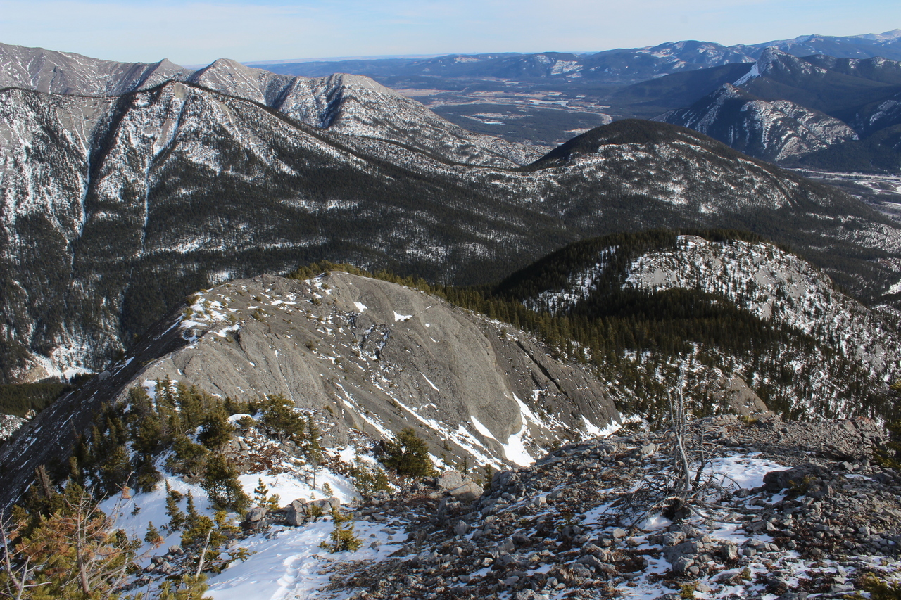 Looking down the ridge to Bluemat Hill (center-right), as we continue the traverse. Exshaw Mountain is the treed bump beyond.