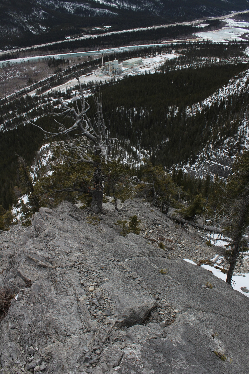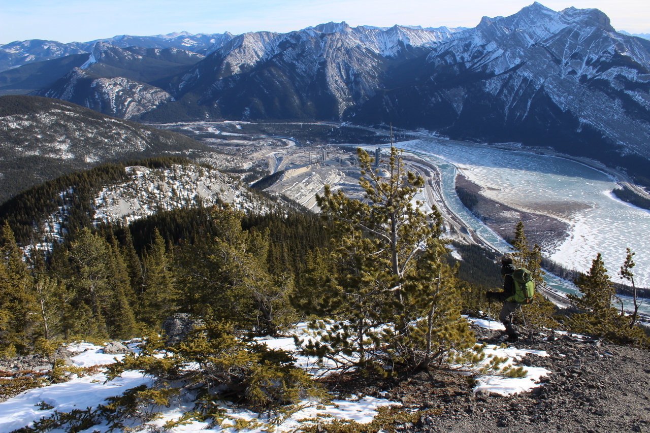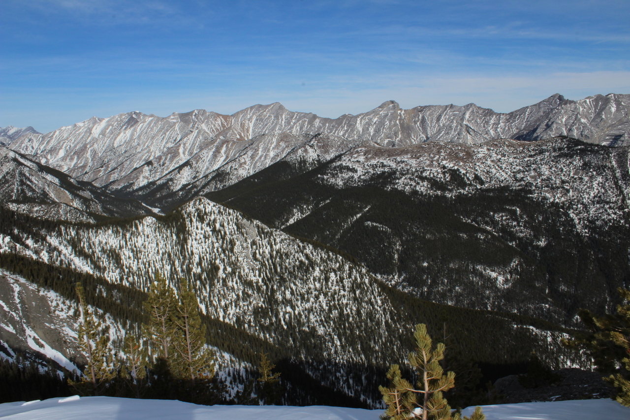 Looking down the ridge to Bluemat Hill (center-right), as we continue the traverse. Exshaw Mountain is the treed bump beyond.