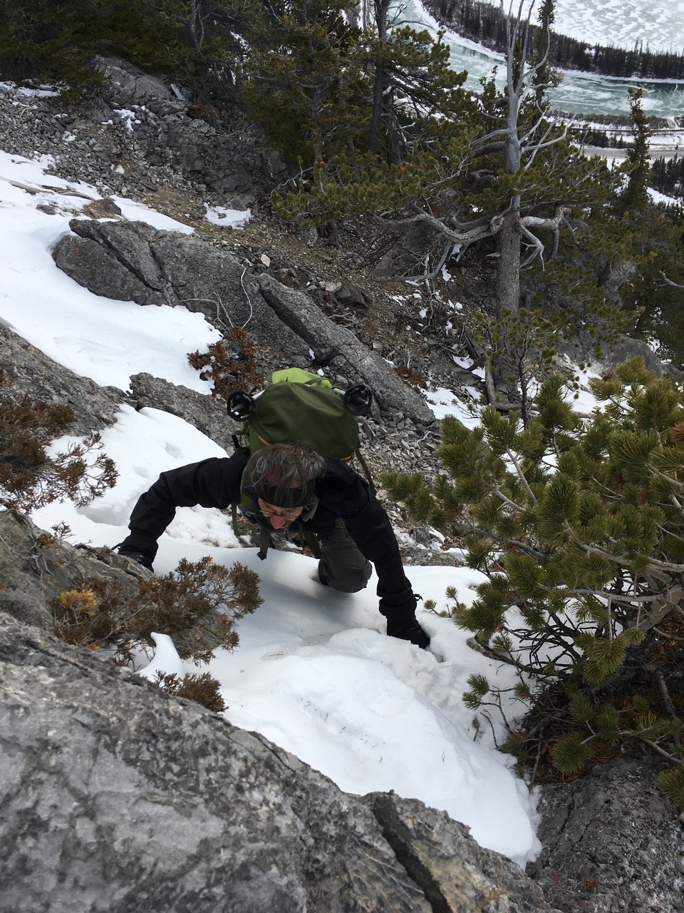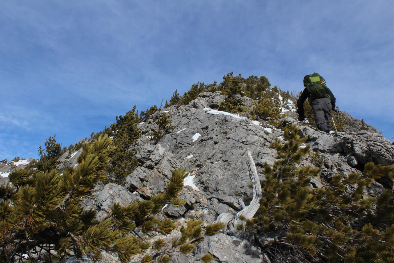 Although just a short moderate step on a good day, the wind that so kindly cleared the snow for us, also had it's mind set on clearing us from the mountain! With the gusting winds throwing us off balance (even while on the safety of two feet), my dad opted to take an easier route, ascending a scree ledge on climber's left of the ridge crest.
