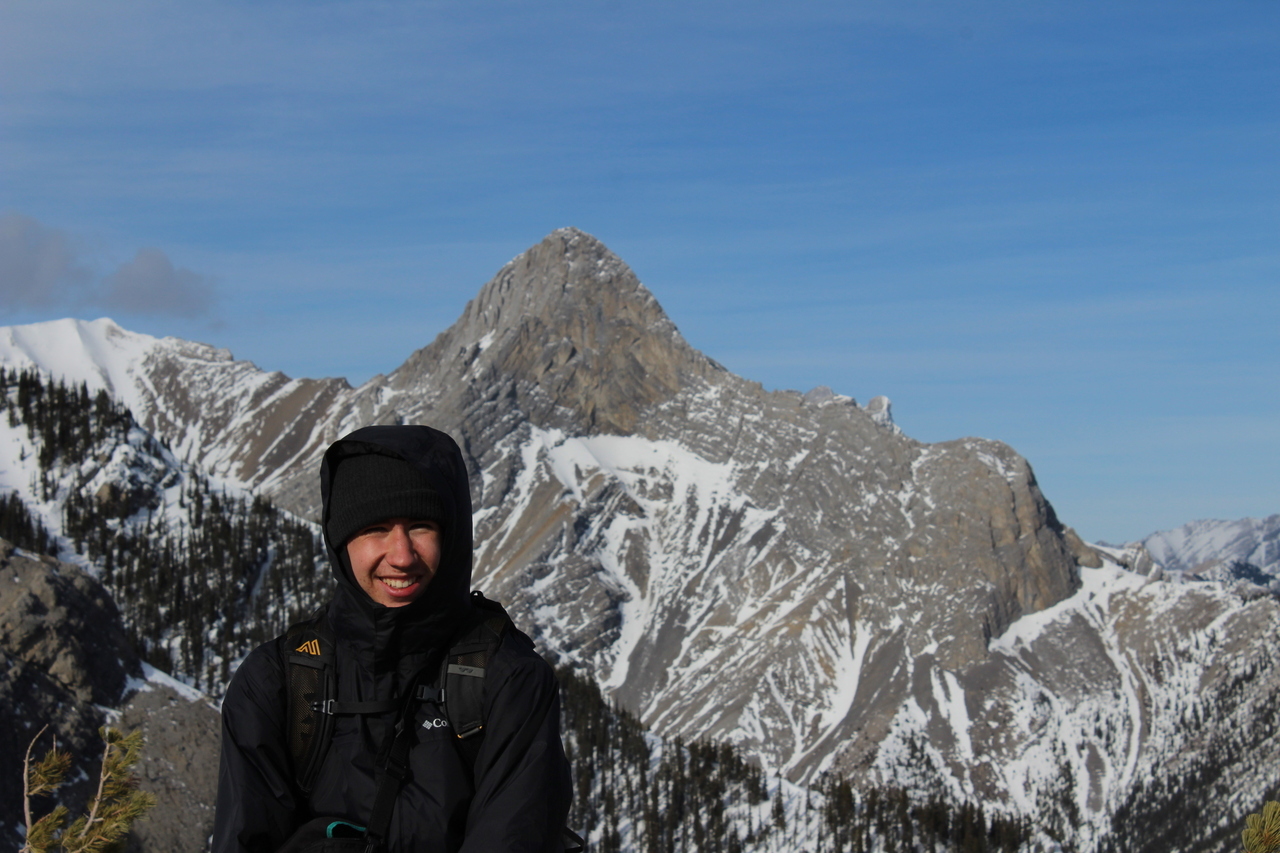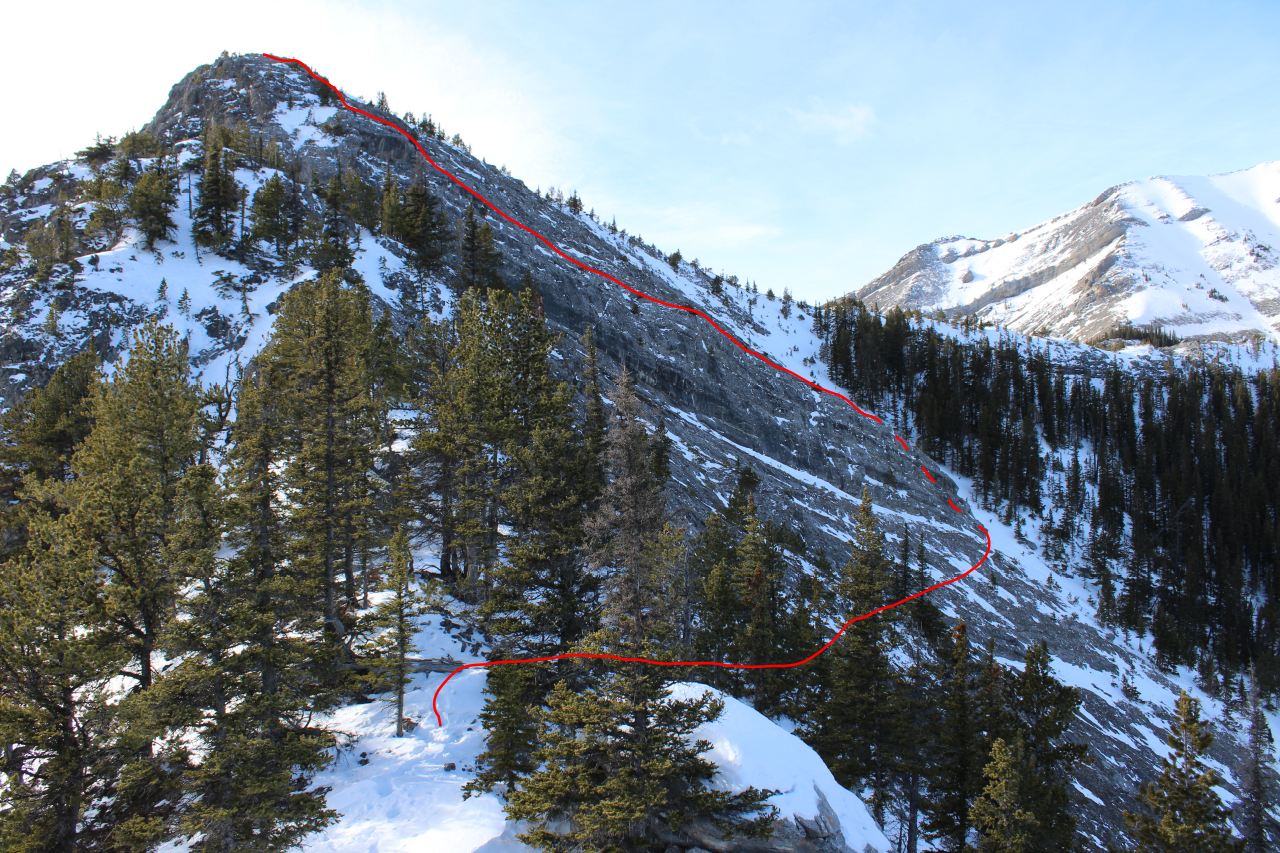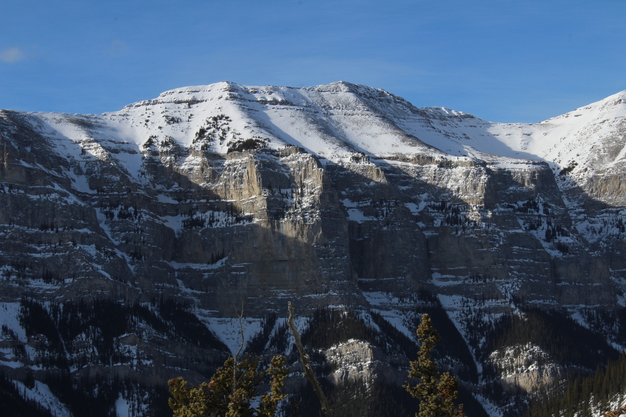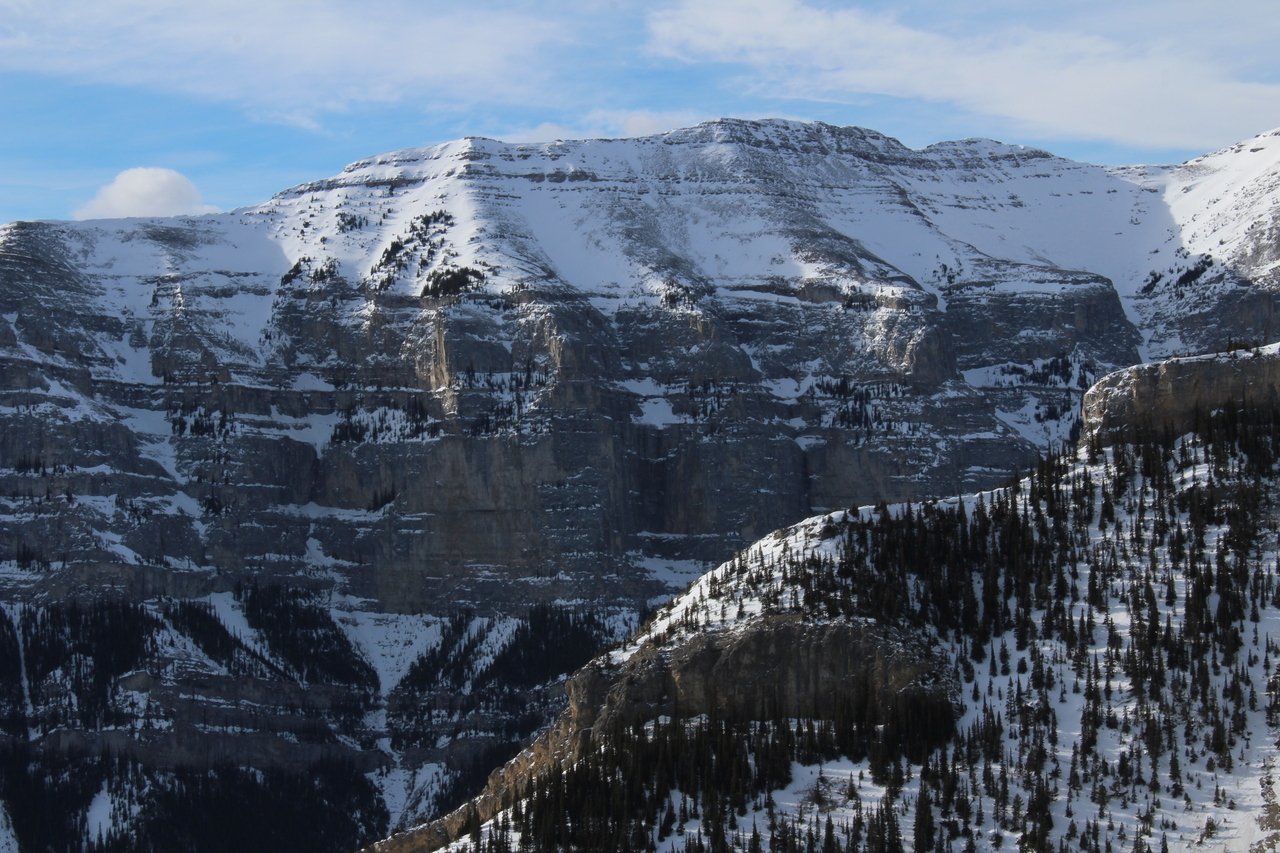 Wind Ridge sits quietly below Rimwall's sheer east face, with The Orphan to the right! Mount Nestor and Old Goat Mountain tower in the distance, all the way on the west side of Spray Lakes (to the left)!