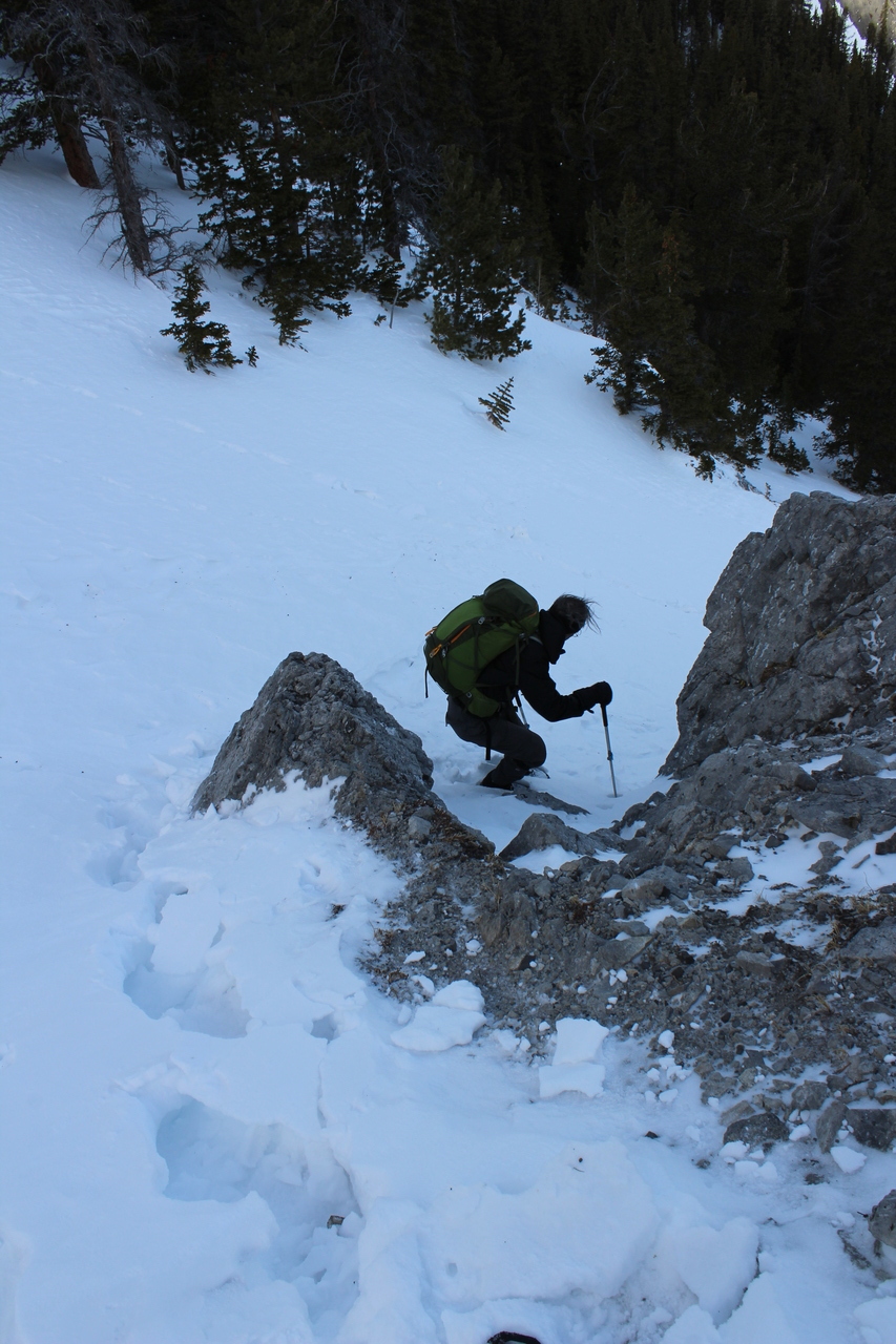 For some reason, I was led to believe that once on the summit of Anklebiter, we could simply follow the ridge down to Bluemat without difficulties. But that doesn't happen to be the case...We began down the ridge, but almost immediately found ourselves staring down a significant drop...Although it may be scramble-able in summer, this downclimb had quite a bit of snow on it, and we did not feel comfortable trying to descend it. The only other option was traversing scree slopes to skier's left, and hope that we'd eventually find a weakness through the cliff band...