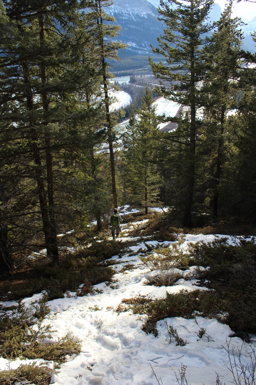 After a short traverse, we gave up looking for a trail, and simply continued down, through the open forest, often following patches of snow that offered relief from the hard-packed, frozen dirt.