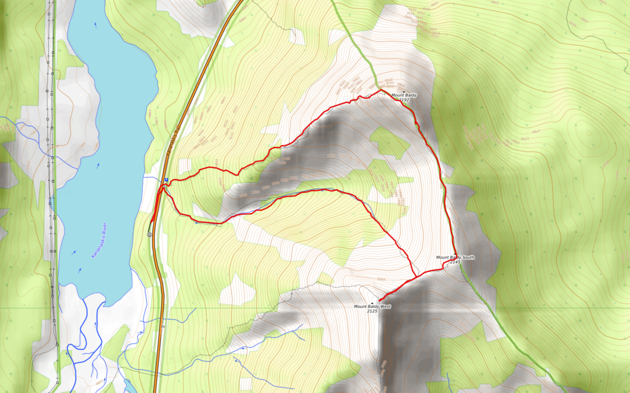 The narrow trail winds its way through dense forest for about 1.5km, before the drainage widens, now surrounded by Baldy's three summits. The West of which is pictured here.