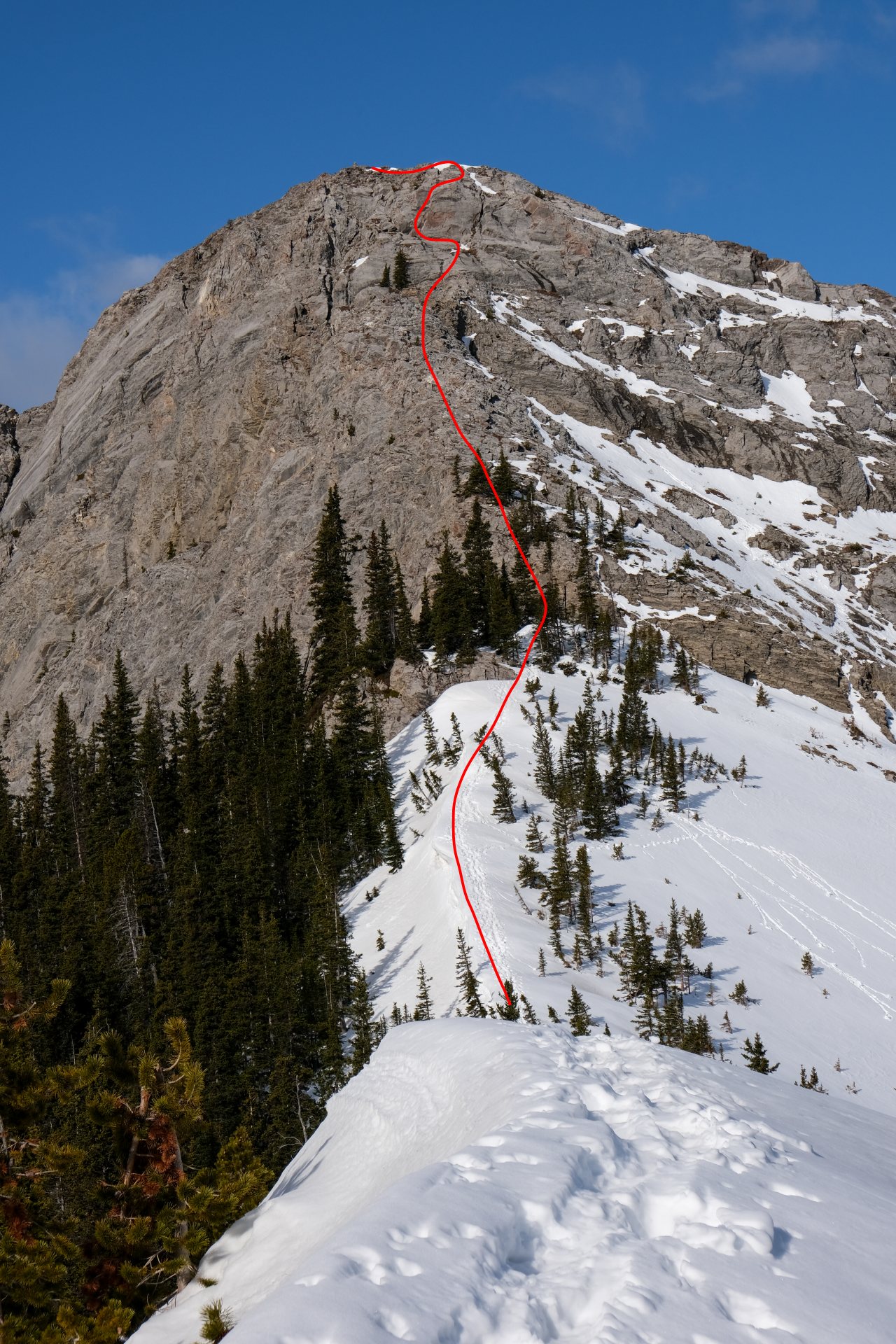 Options continue to present themselves on Baldy's west ridge: easier options exist by traversing below the crest on skier's left (yellow), while some hands-on scrambling can be found directly along the ridge (red).