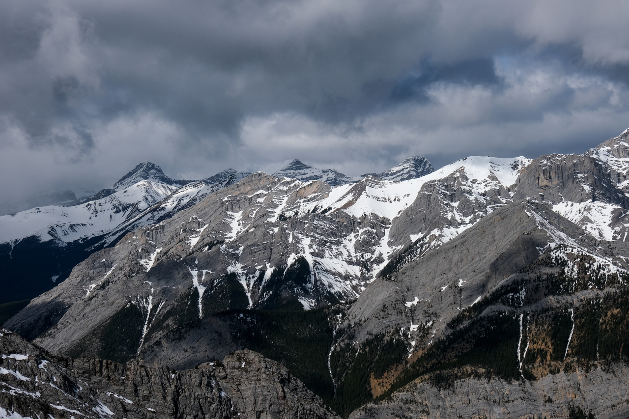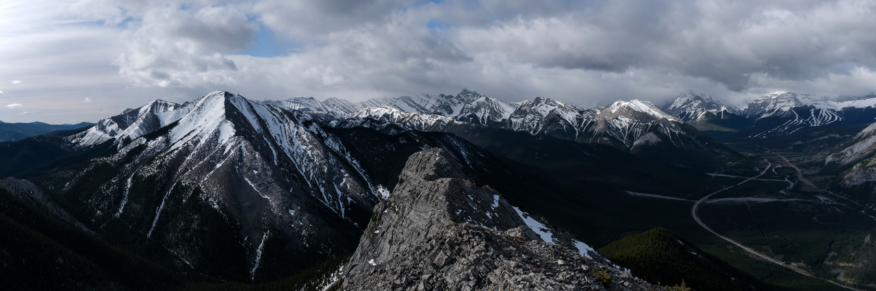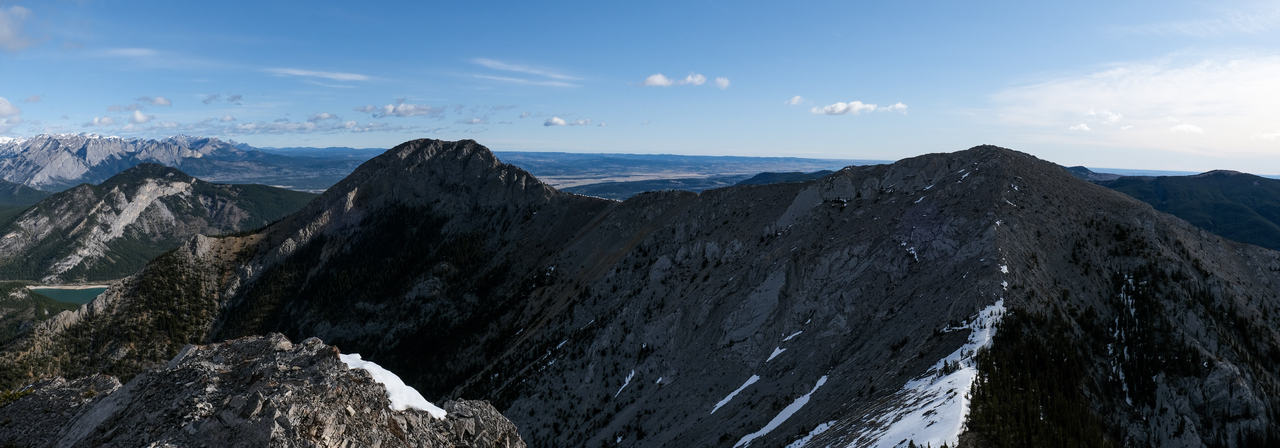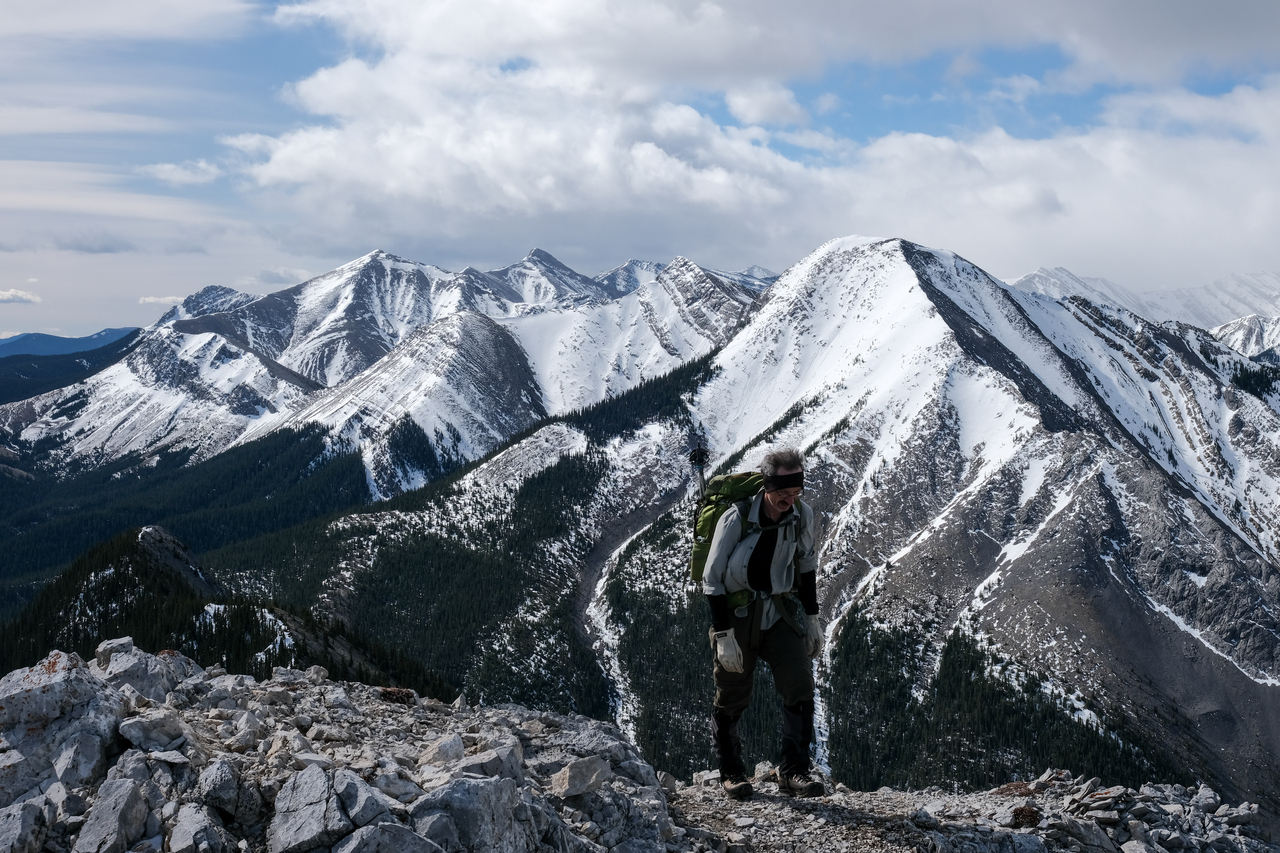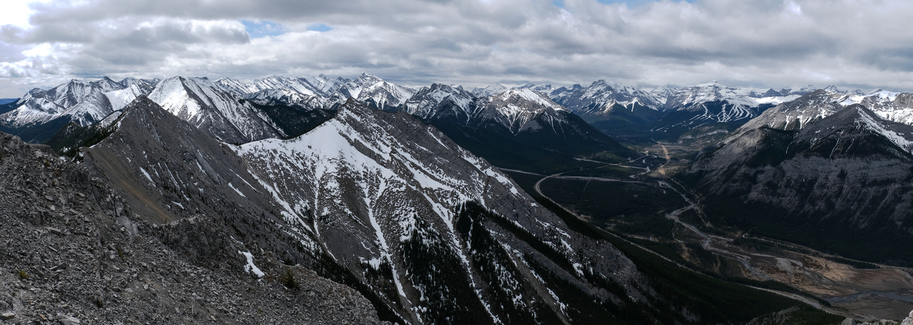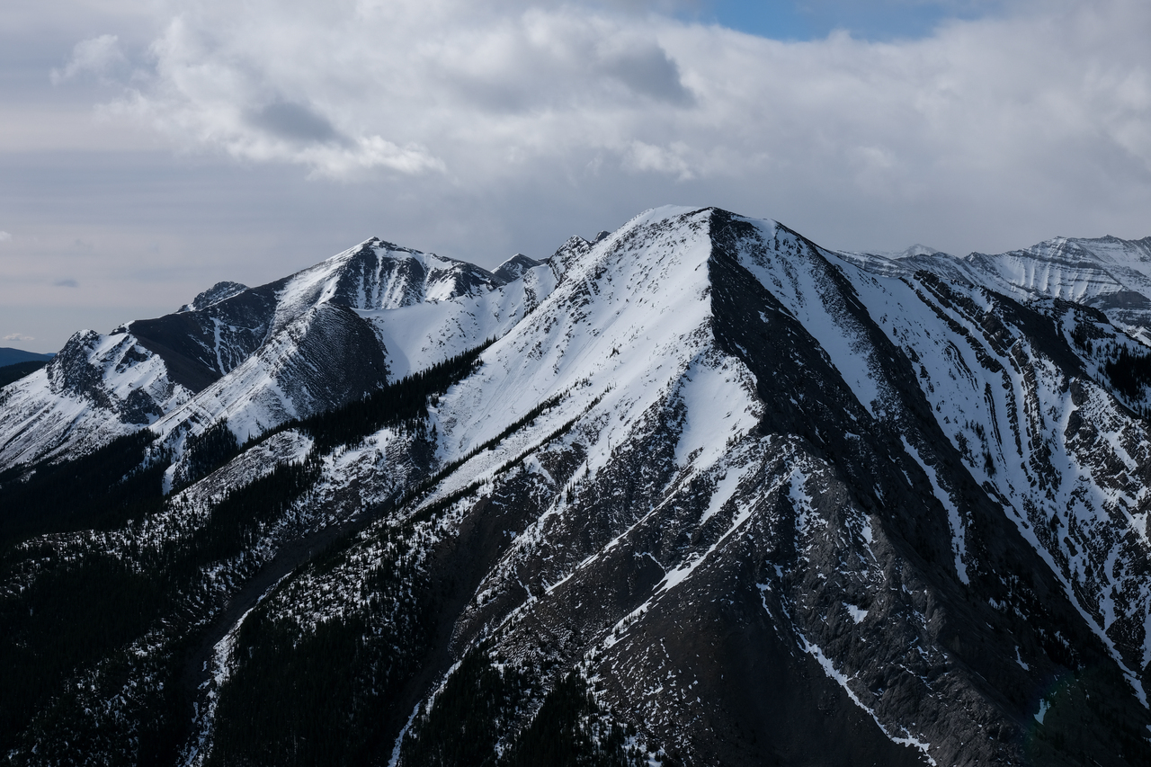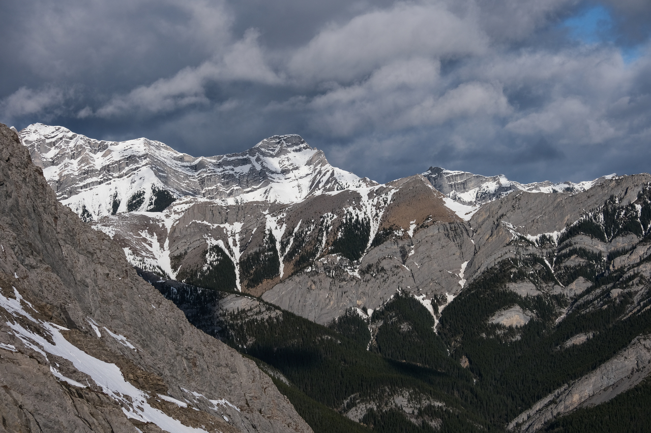 The Kananaskis Range is finally able to shake the low clouds for our final peak of the day! Newly revealed peaks on the distant skyline include: Inflexible, James Walker, Fortress, Kidd, Tower, Bogart, and finally Sparrowhawk!