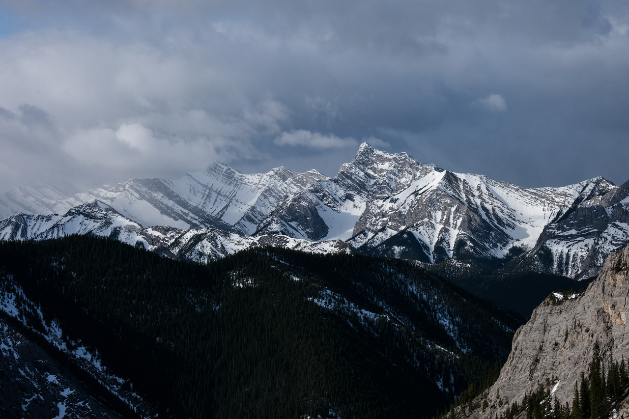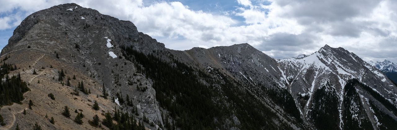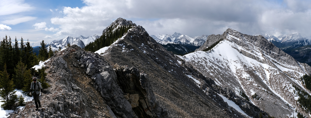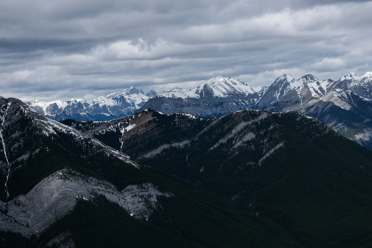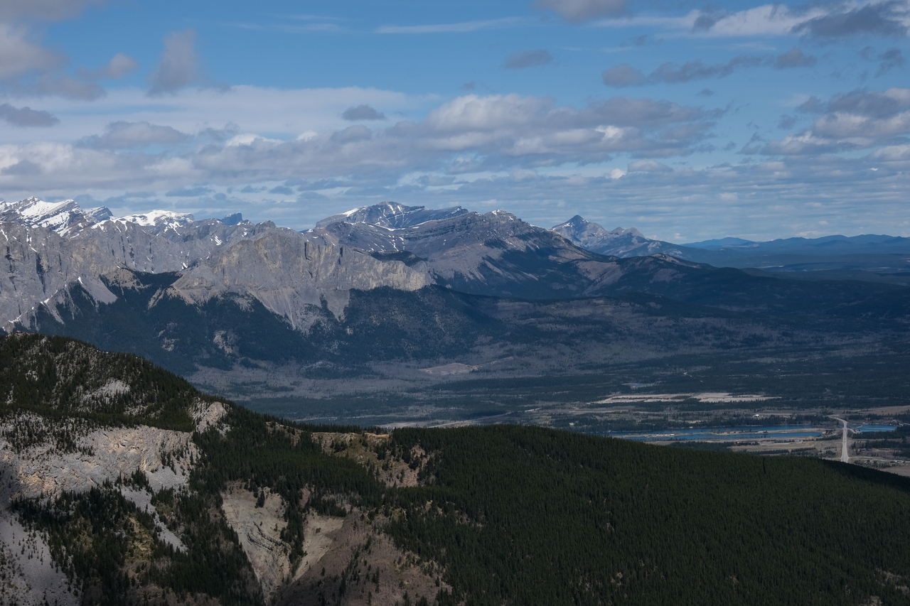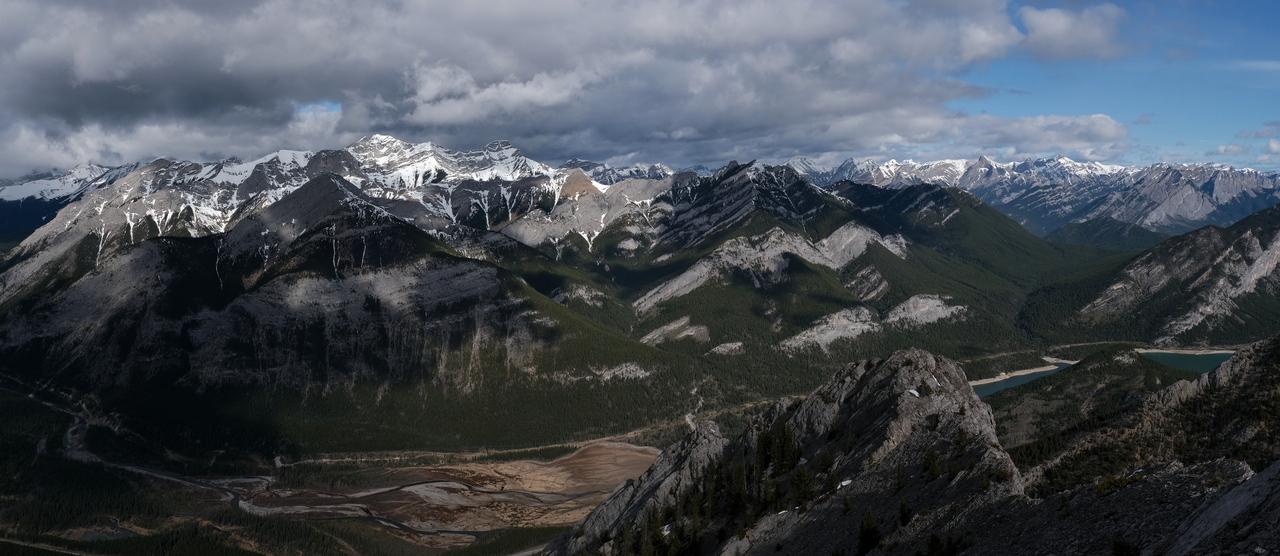The Kananaskis Range is finally able to shake the low clouds for our final peak of the day! Newly revealed peaks on the distant skyline include: Inflexible, James Walker, Fortress, Kidd, Tower, Bogart, and finally Sparrowhawk!