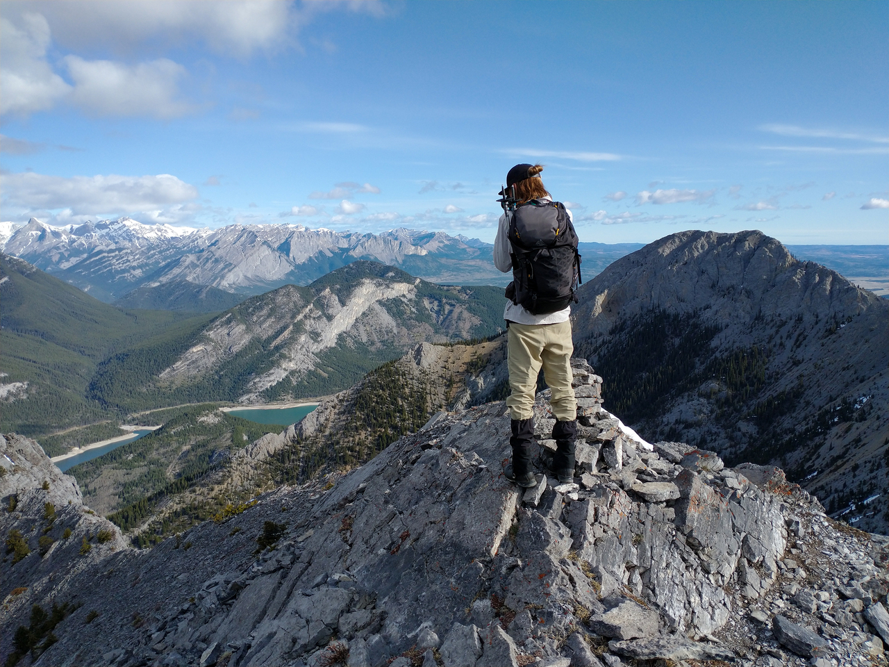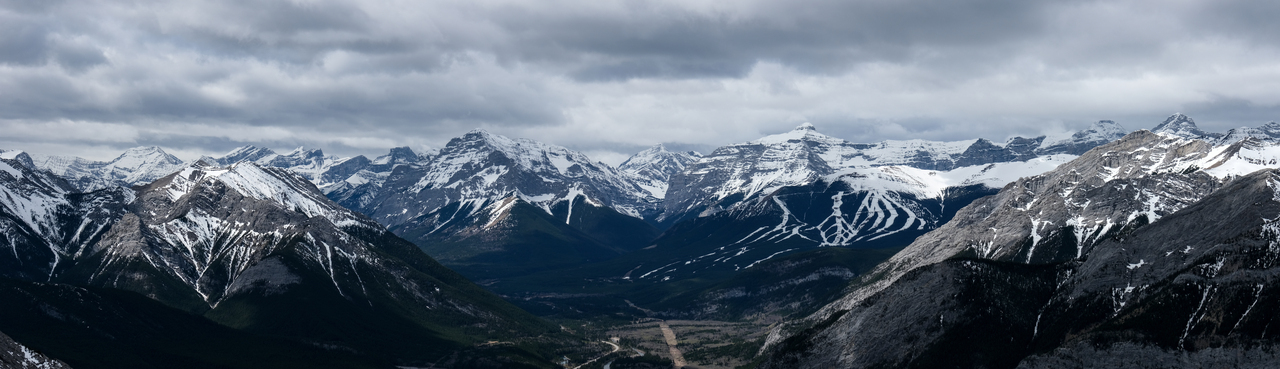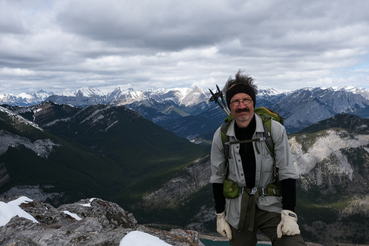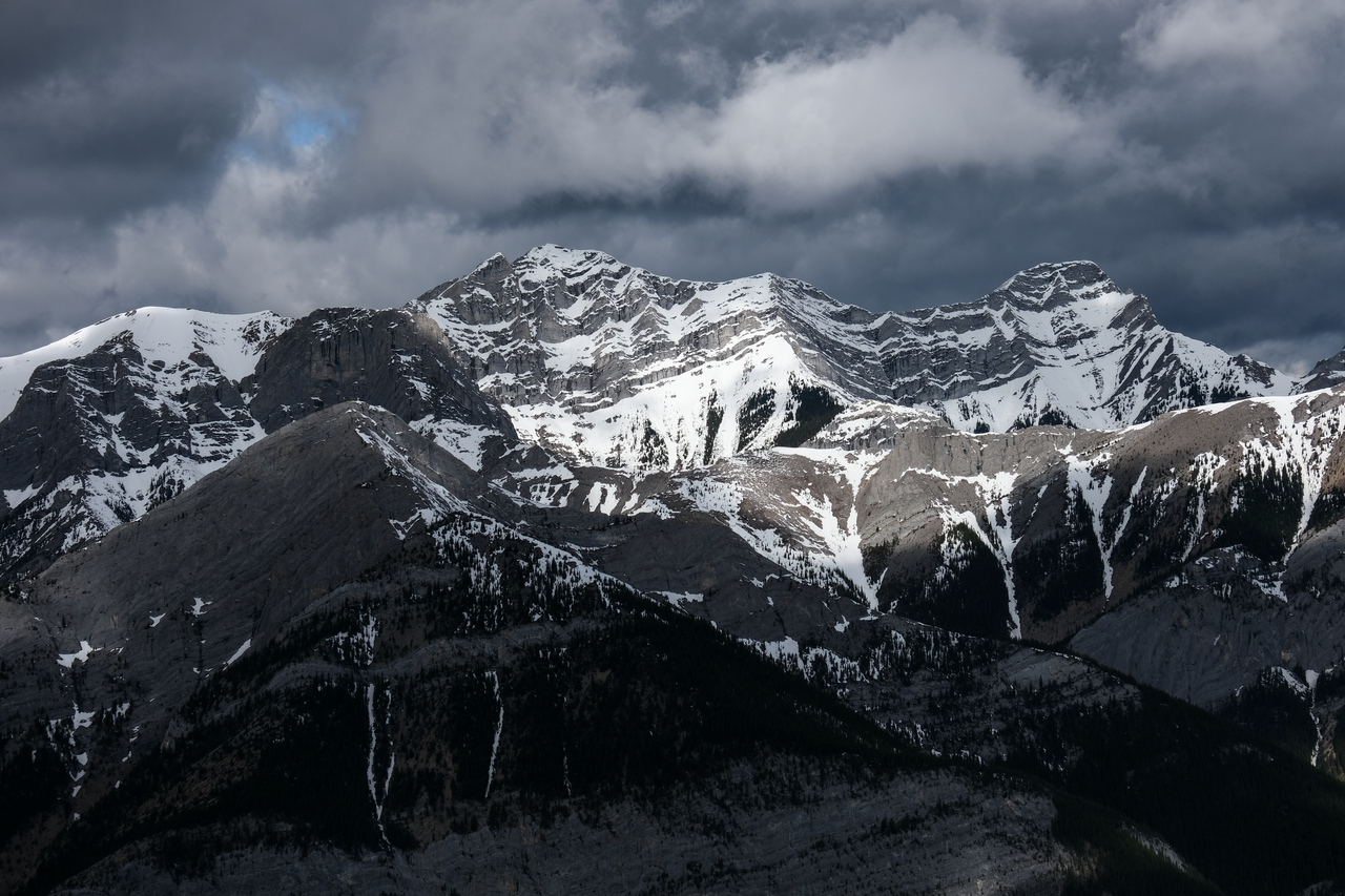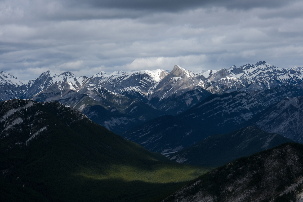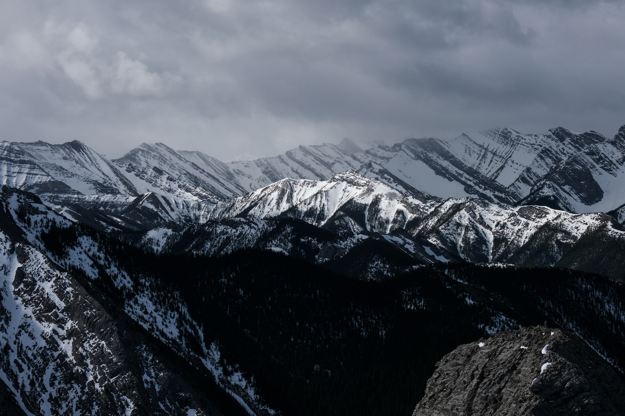 The Kananaskis Range is finally able to shake the low clouds for our final peak of the day! Newly revealed peaks on the distant skyline include: Inflexible, James Walker, Fortress, Kidd, Tower, Bogart, and finally Sparrowhawk!