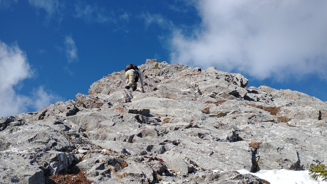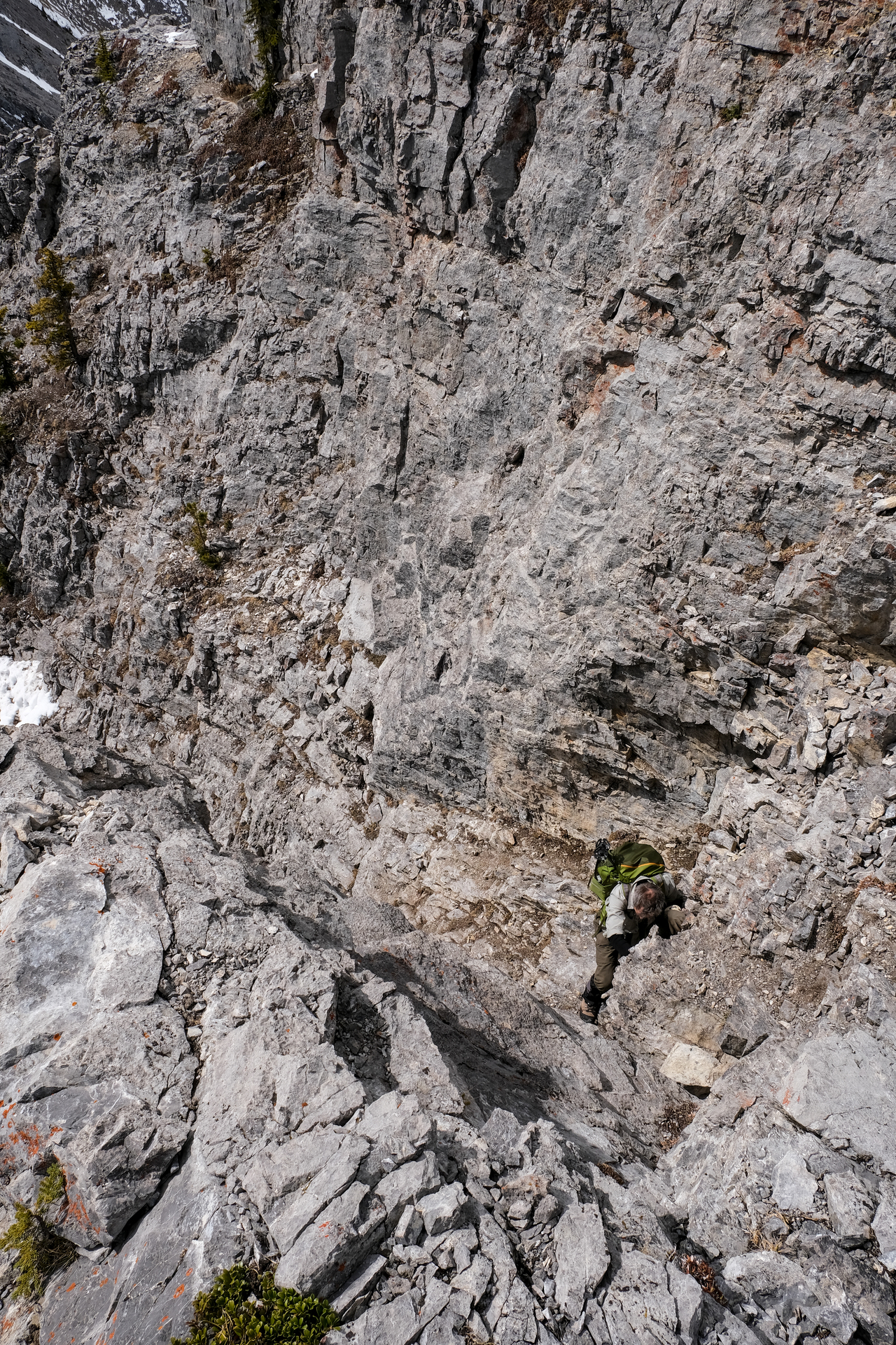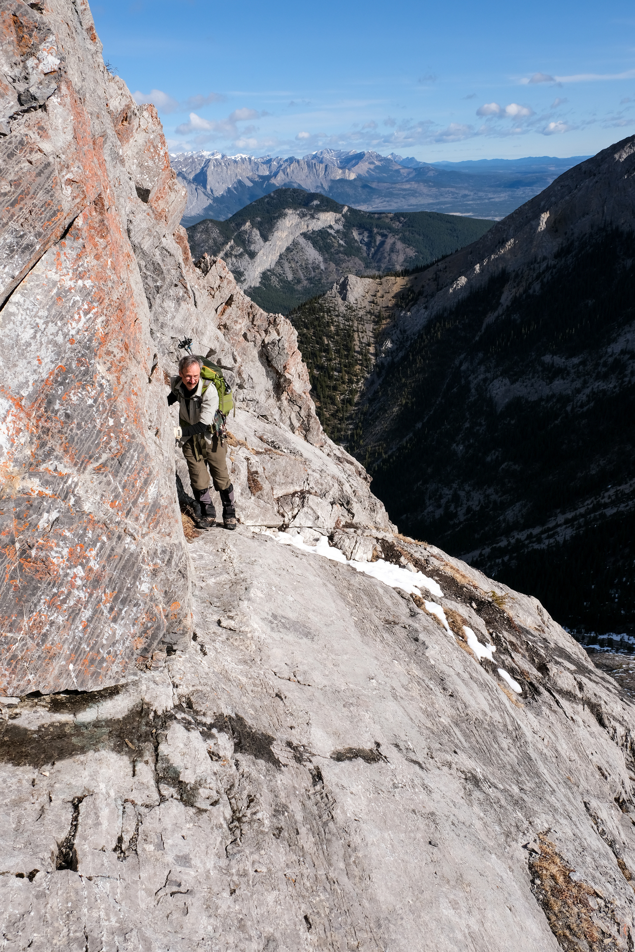 Upon reaching the base of the summit block, we turned right, and traversed a narrow ledge to gain access to a gully.