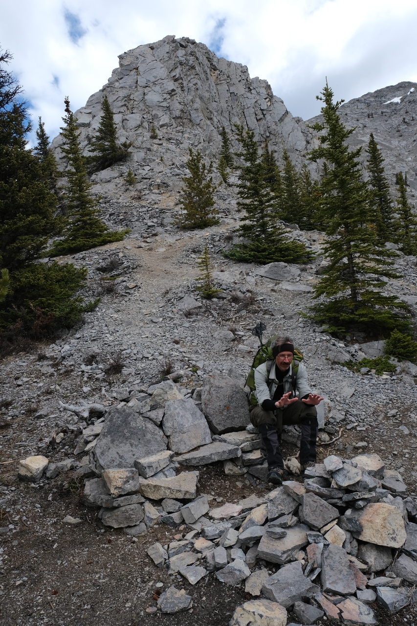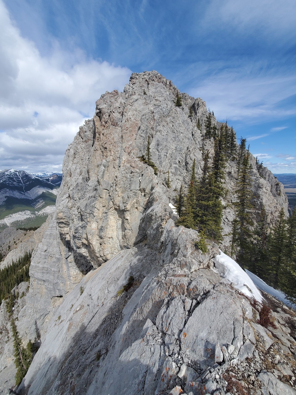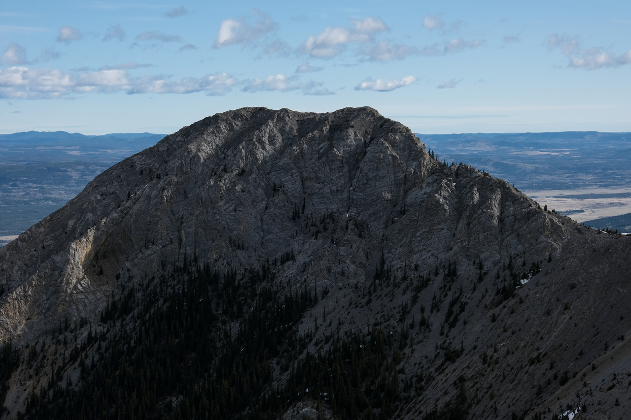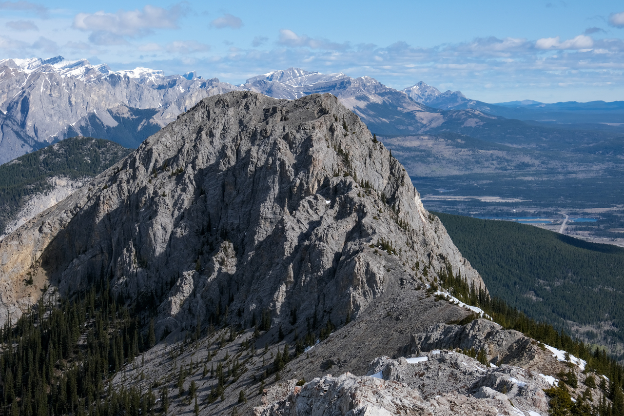 This is the biggest Grotto has ever looked to me (center)...Its height really stands out from its surroundings from this angle! Rundle rises to the left, and >Grant MacEwan Peak sits below in the foreground.