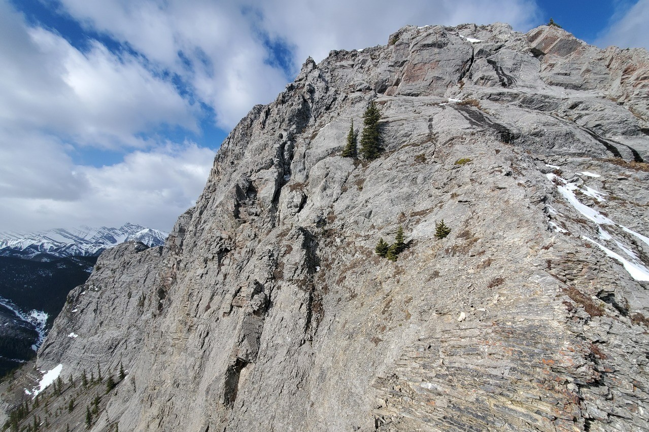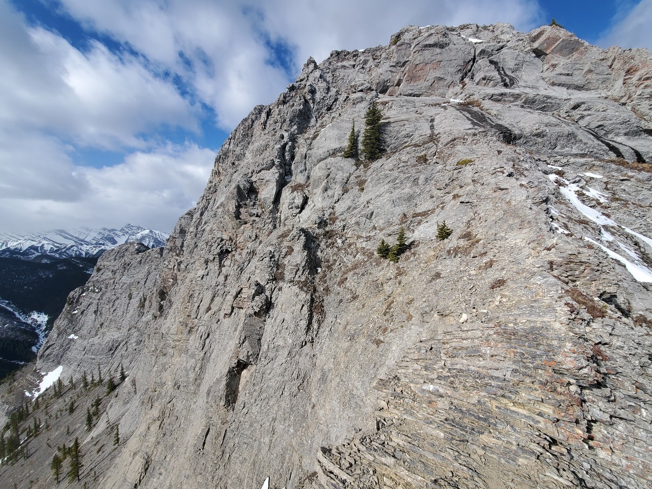 Looking back to the impressive terrain on the upper half of Baldy West. Note the exposure below the slab traverse.