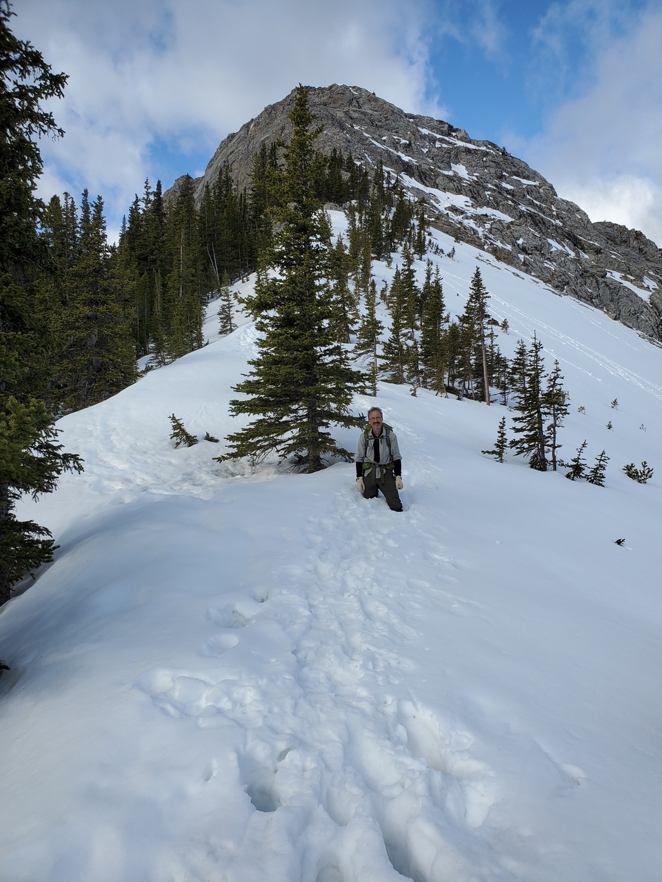 Even though it was only around 9:30am, something told us it was heating up...We carefully negotiated the "minefield", unexpectantly plunging through the snowpack on multiple occasions...