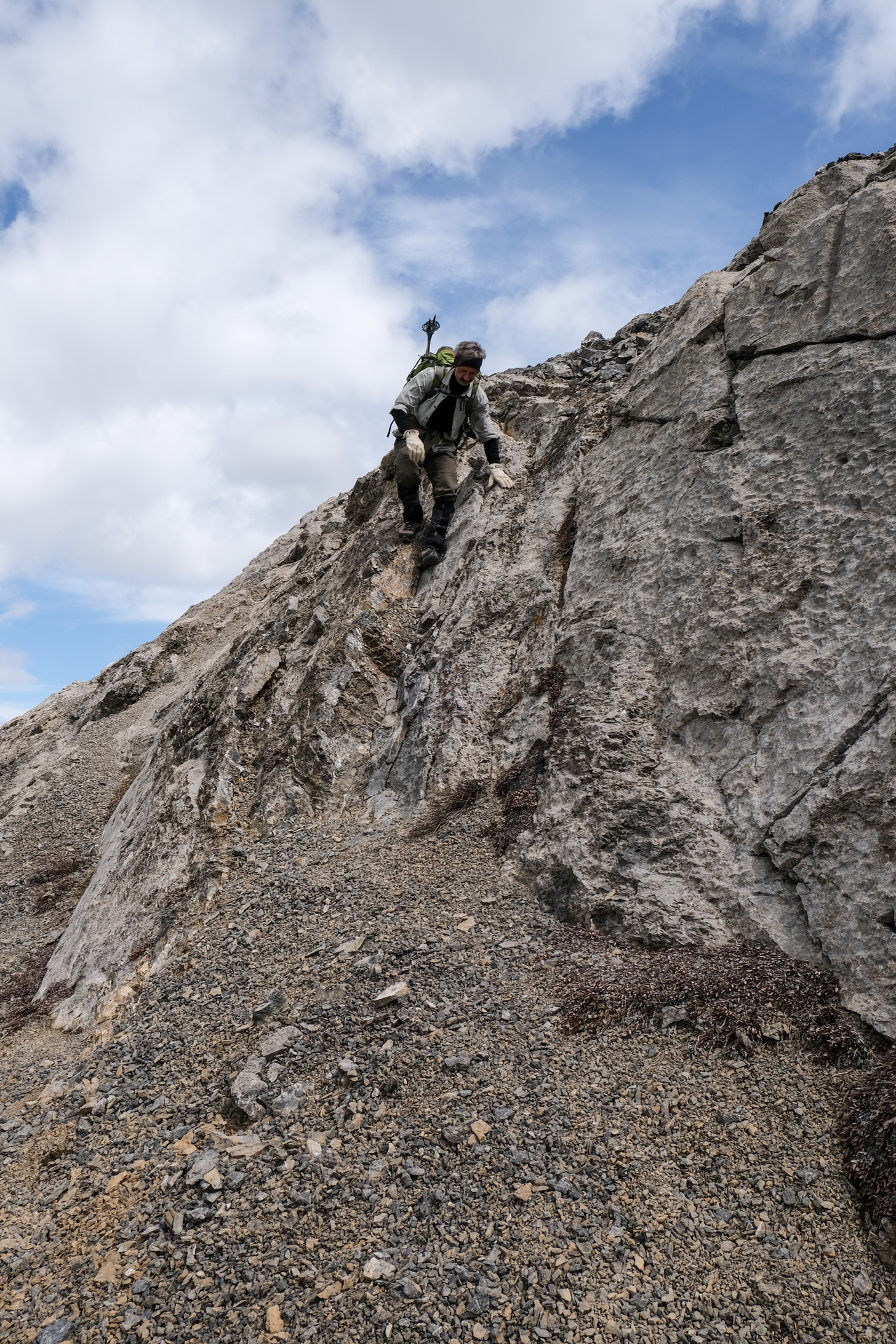 The upper section can be easily descended via a winding scree trail, but we opted to tackle some of the slabs head on.