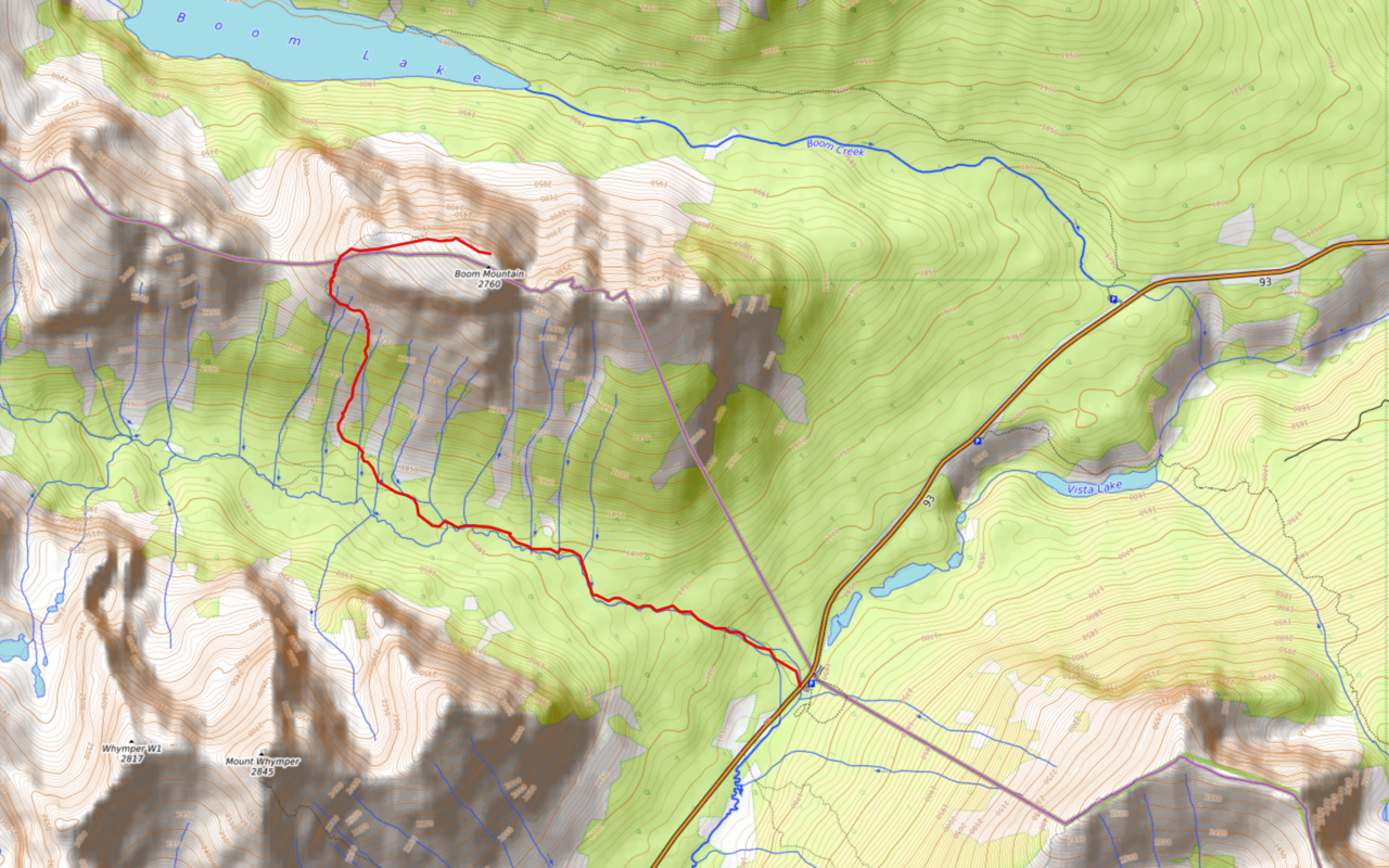 Having climbed Vermilion Peak and Mount Haffner the day prior, we decided to head back to the same area and give Boom a try! I gotta say, I wasn't completely sure what we were getting into. I'd heard there would be some bushwhacking, but that bits of animal trails would lead the way...It turns out that there are practically no signs of previous human life (aside from a few ribbons at the start), but there was something special about that. Sure, the trudge through thick low bush and over fallen trees was starting to feel endless some 3km in, but it was cool to break new trail and explore an area that felt "untouched" by civilization.