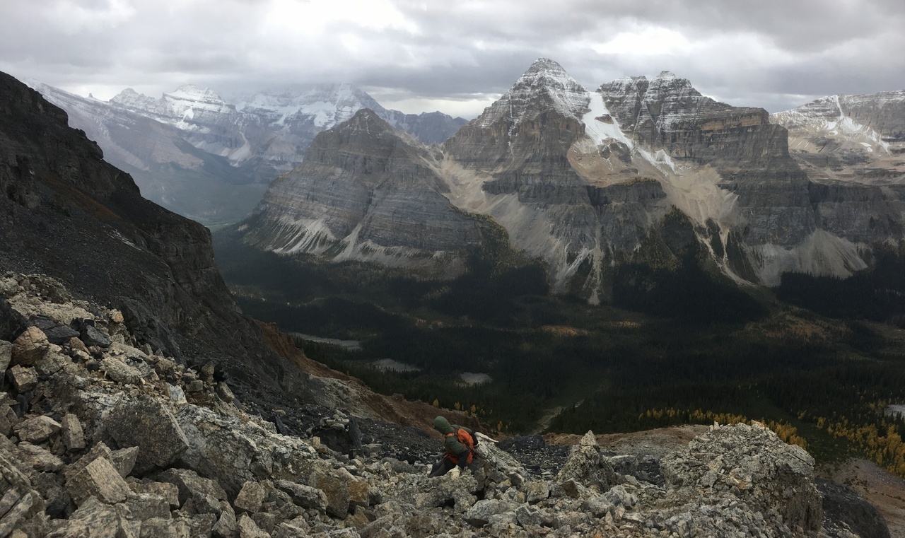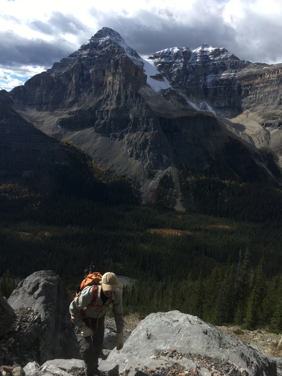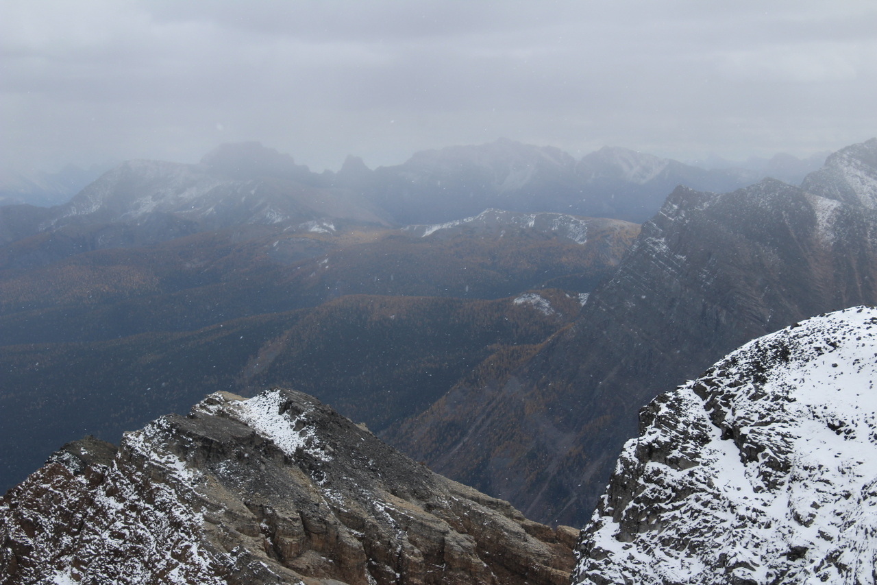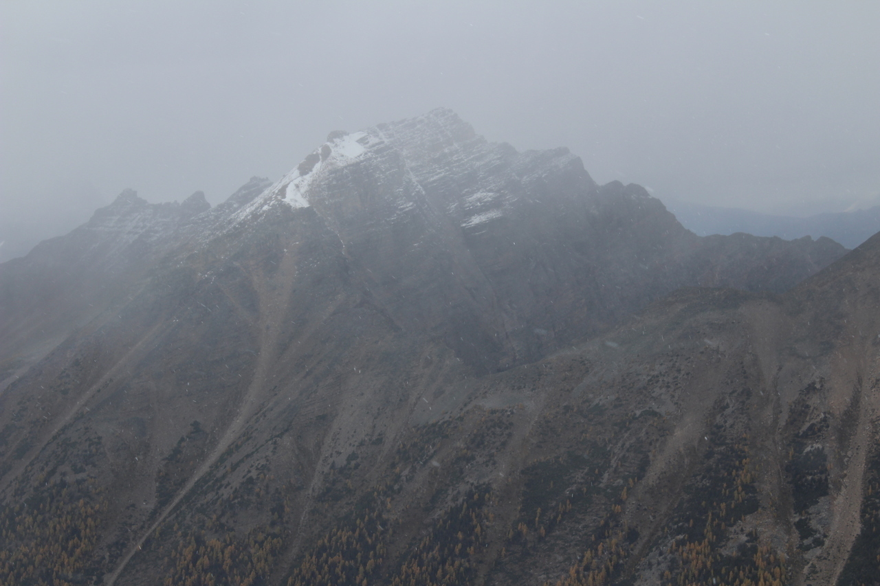 The larches below Storm brighten up the view! Copper, Pilot, and Brett (from left to right) are barely visible in the background.
