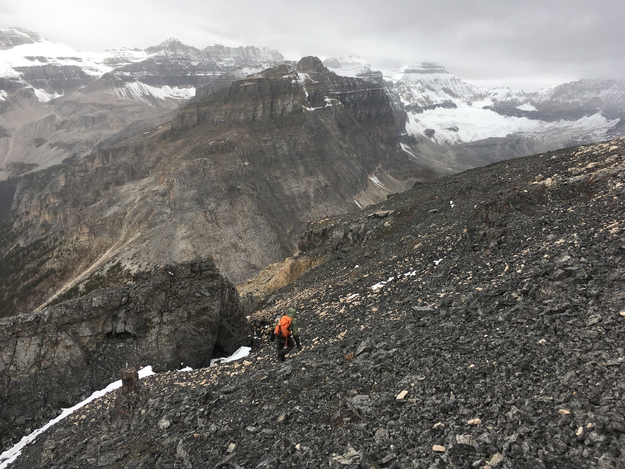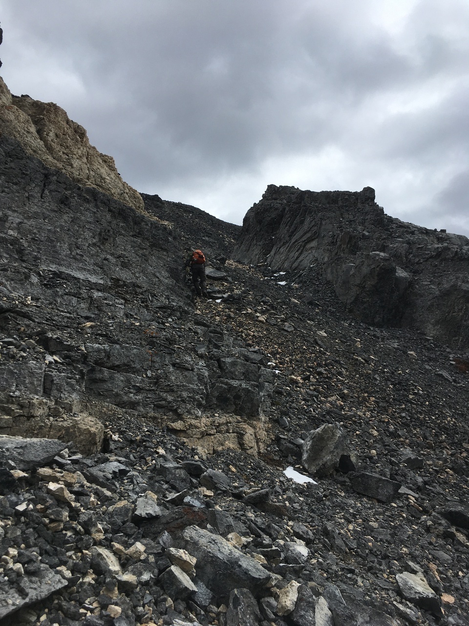 On to the scree! We stayed mostly center-left in the gully until the last bit, where we angled left to hopefully cut off some traversing later...wouldn't recommend! As we found out on our way down, a goat trail goes straight across the gully higher up and allows for a much more pleasant traverse. By angling like we did, you might decrease distance, but the terrain is far more tiresome.