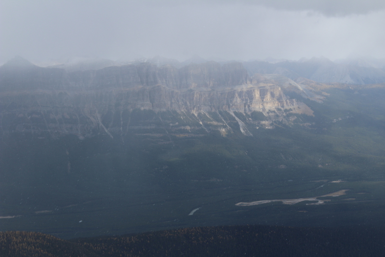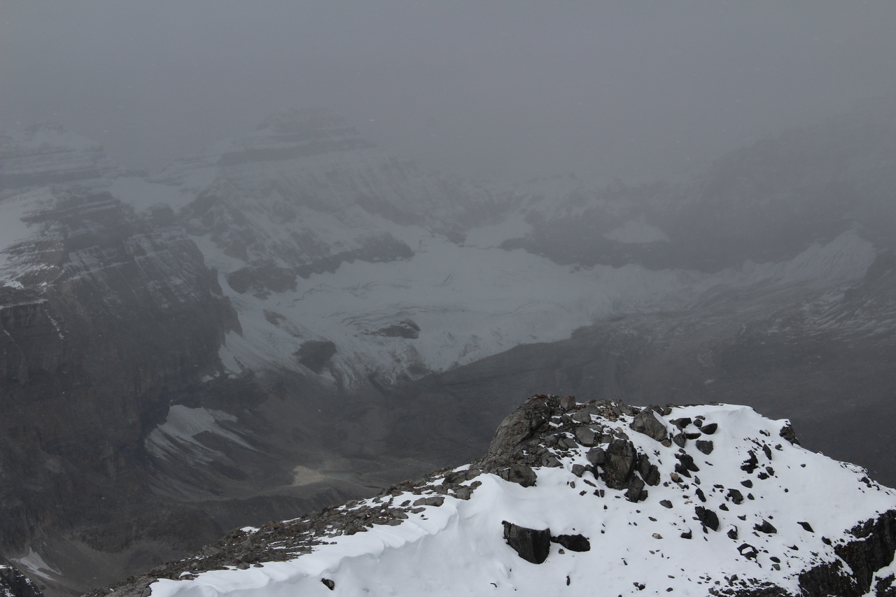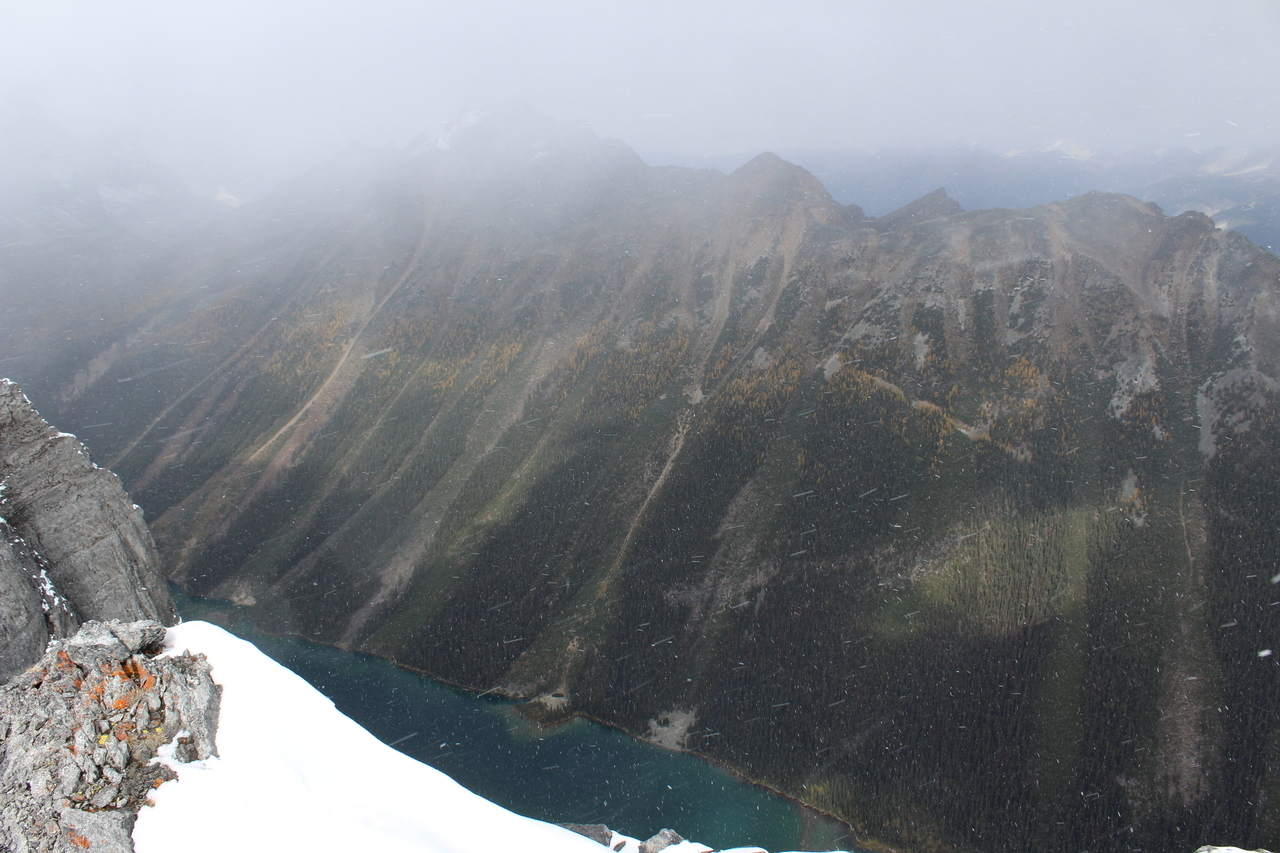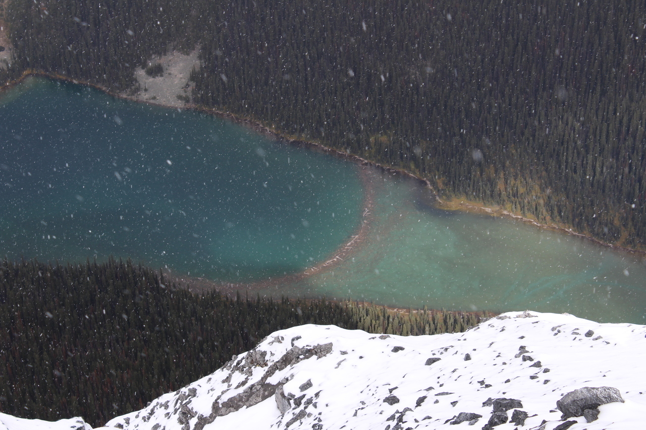 Far far below, the log boom for which Boom Lake is named! I tried asking the weather to chill, but I think it interpreted "chill" in the literal sense...Wait, stop snowing! That's not what I meant!!
