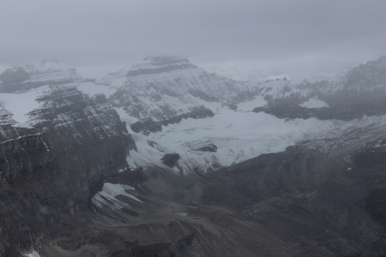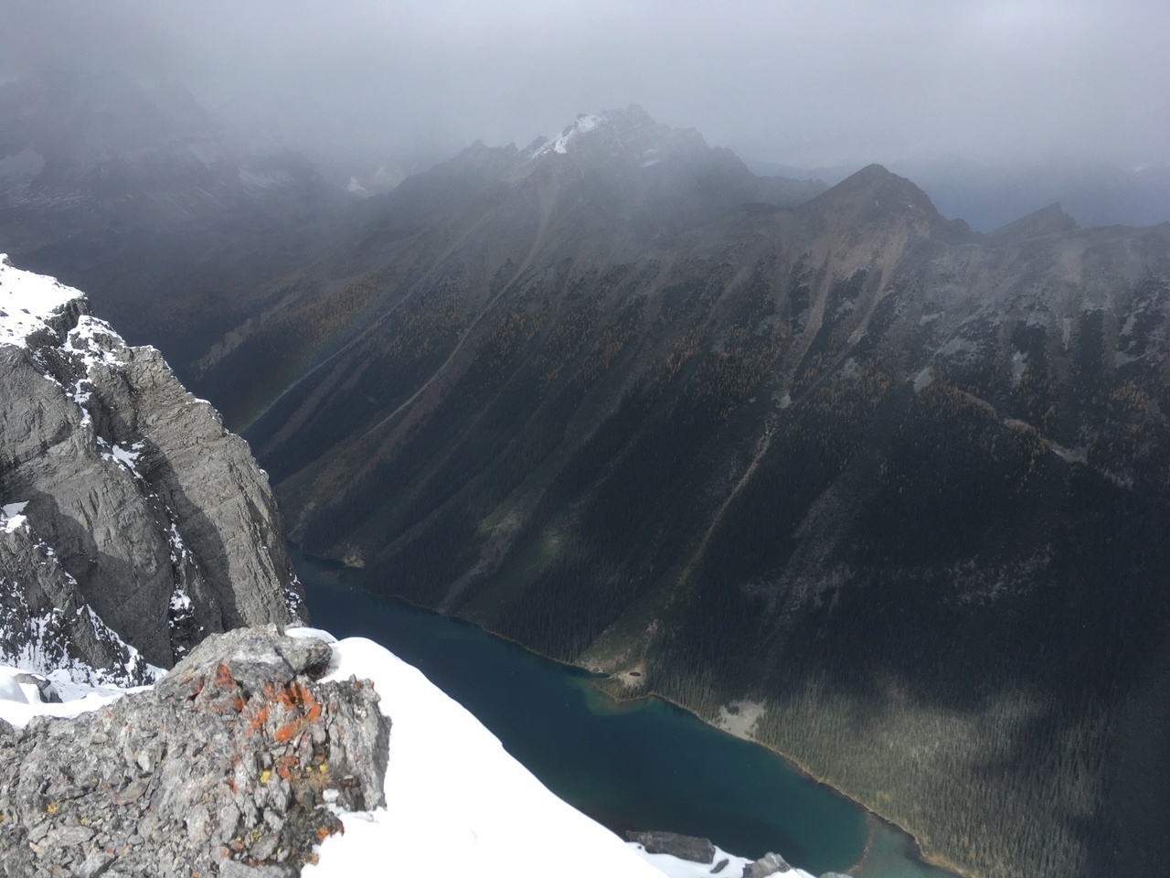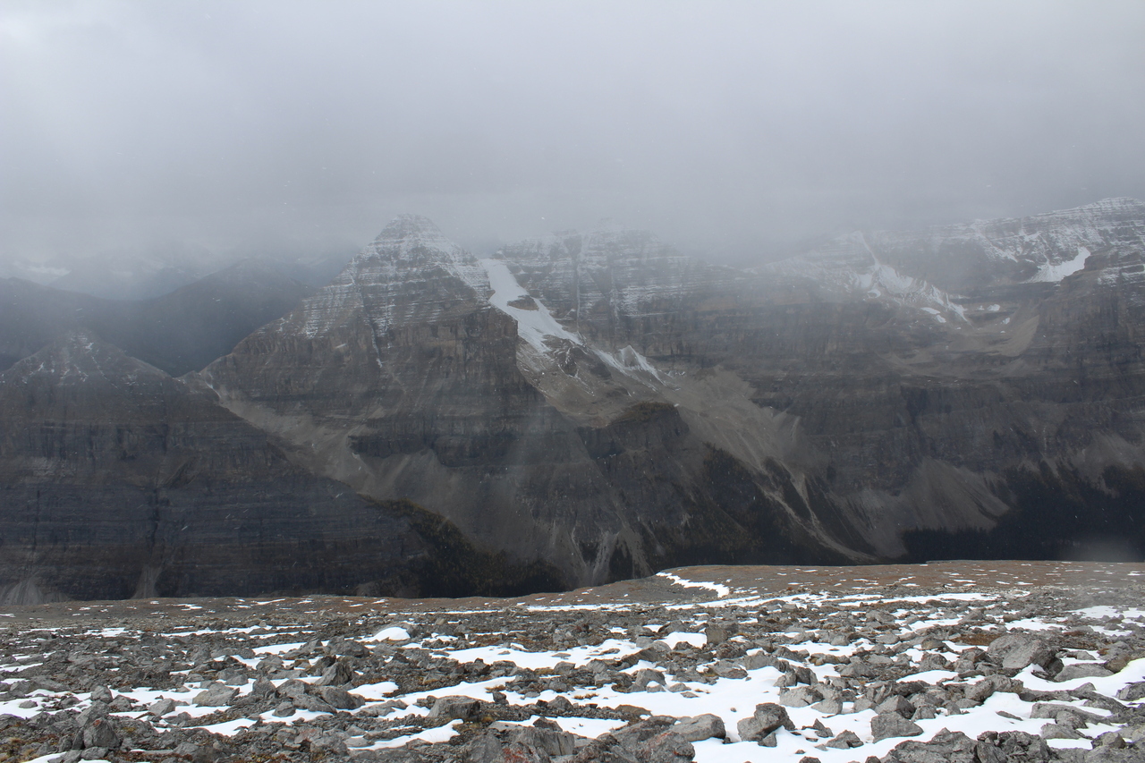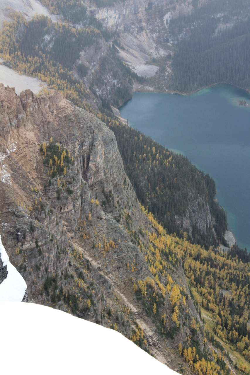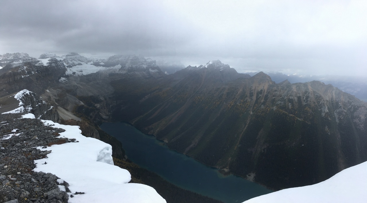 Far far below, the log boom for which Boom Lake is named! I tried asking the weather to chill, but I think it interpreted "chill" in the literal sense...Wait, stop snowing! That's not what I meant!!