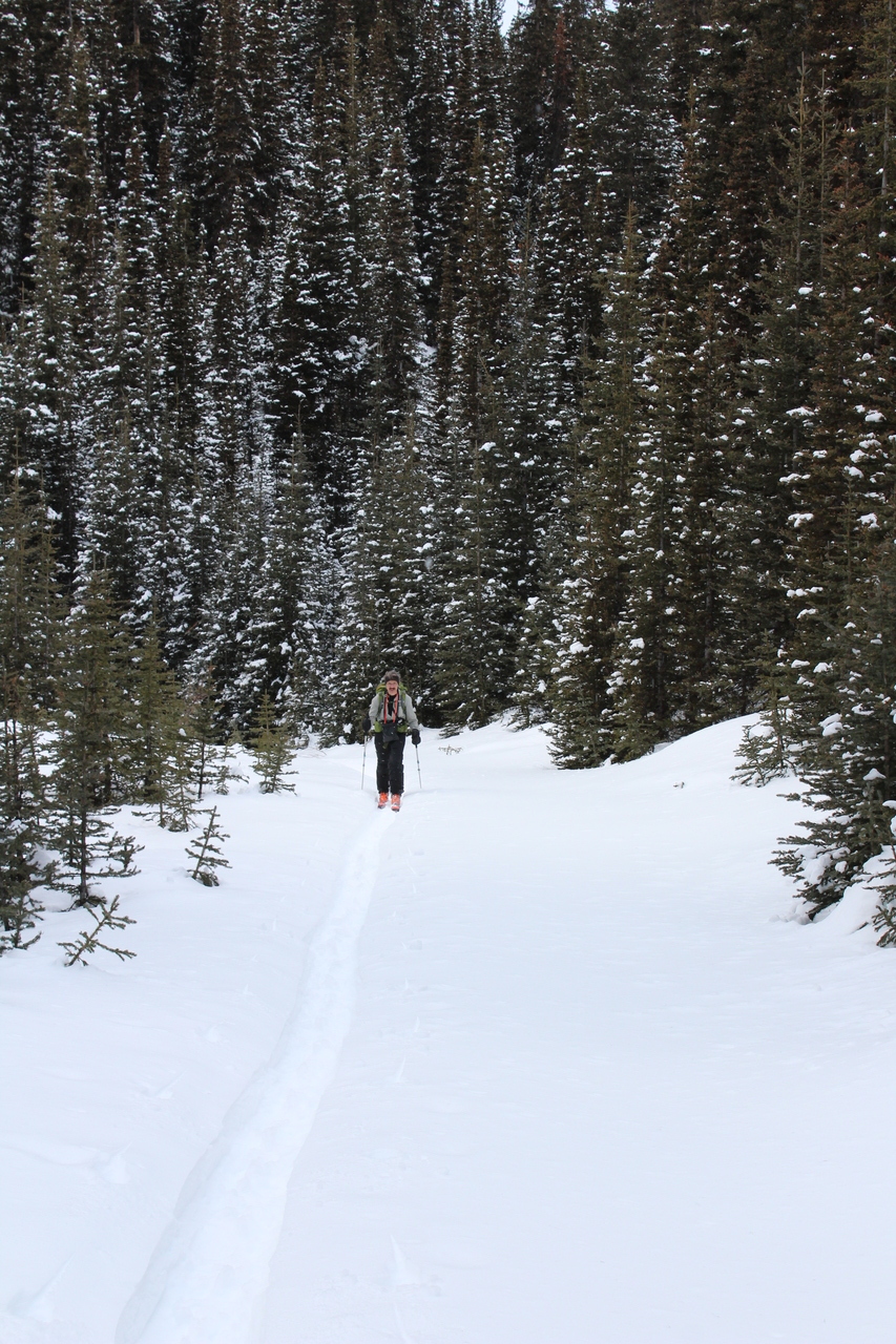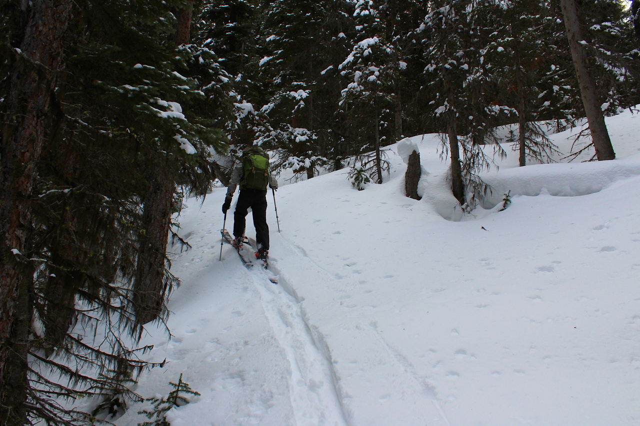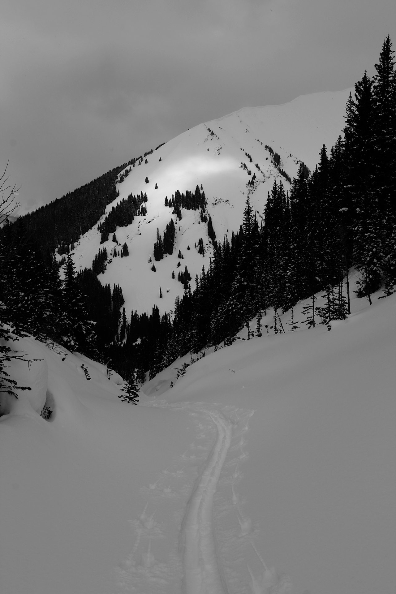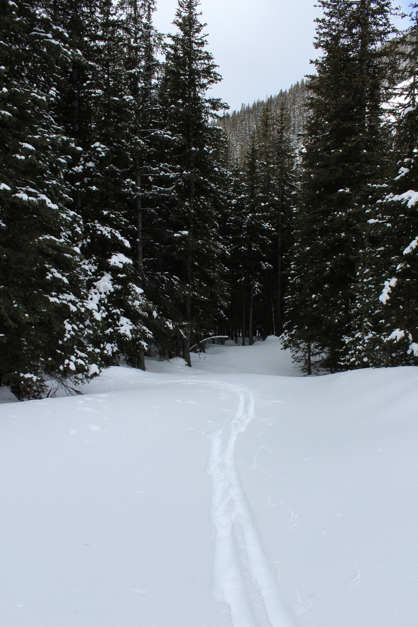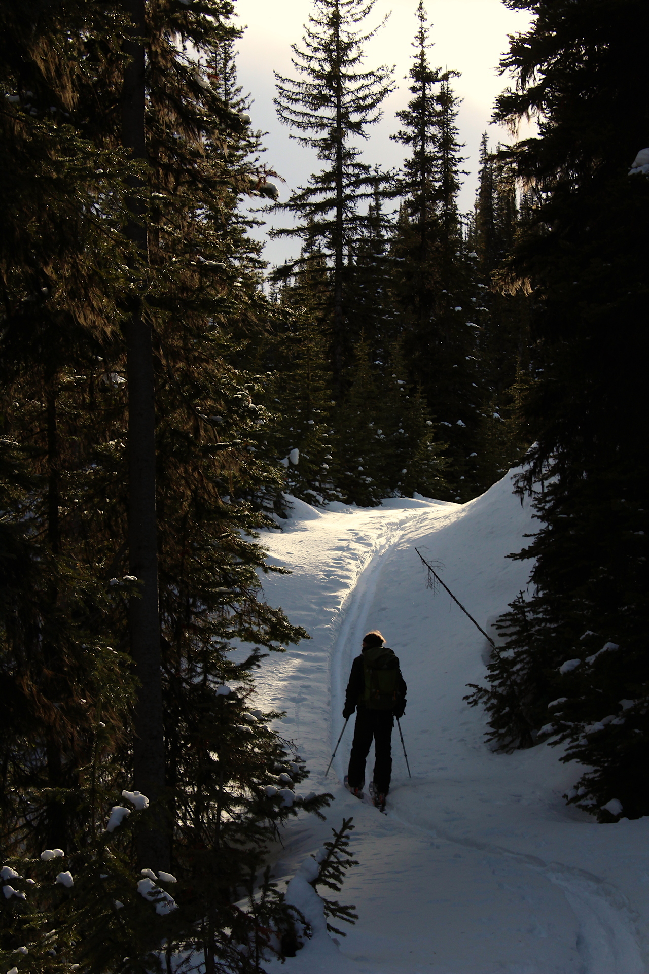 Beautiful lighting as we follow our skin track back down the Snowdrift Trail.