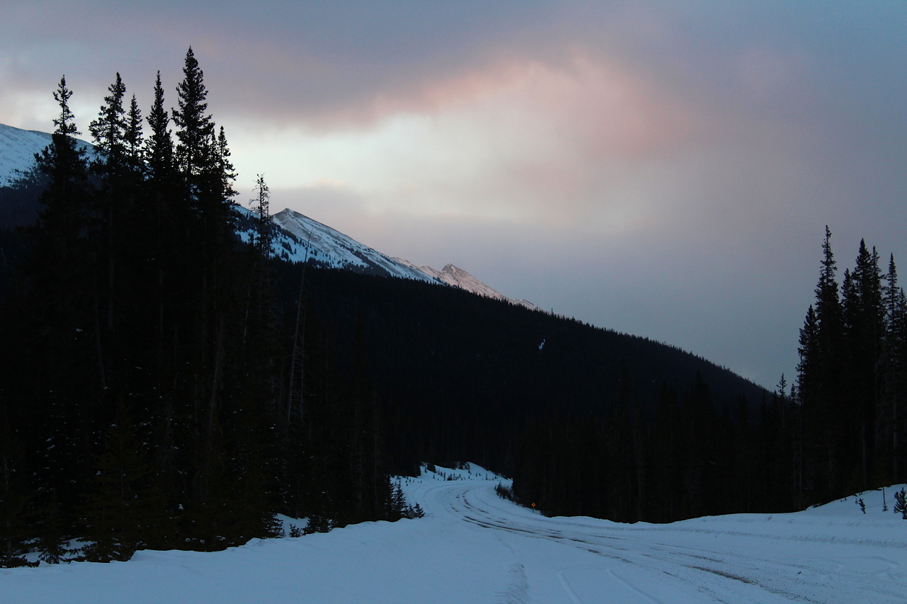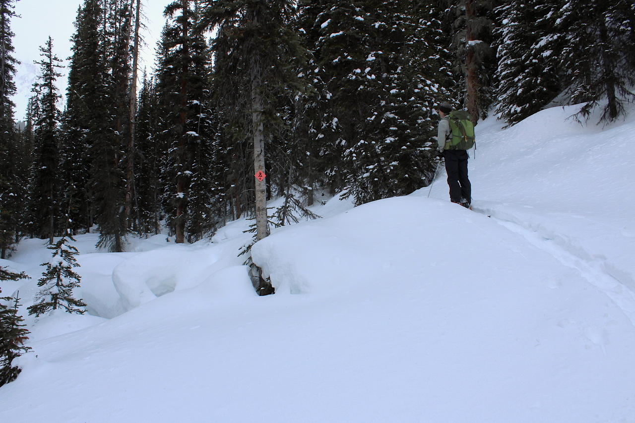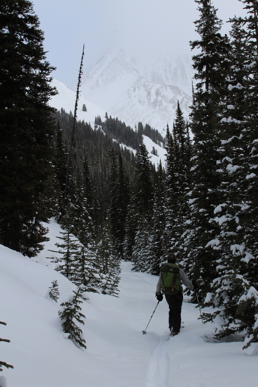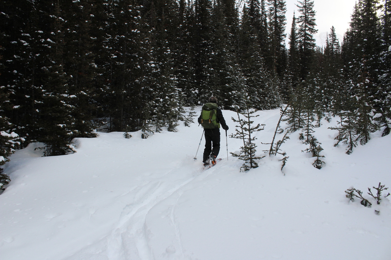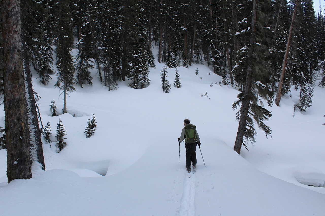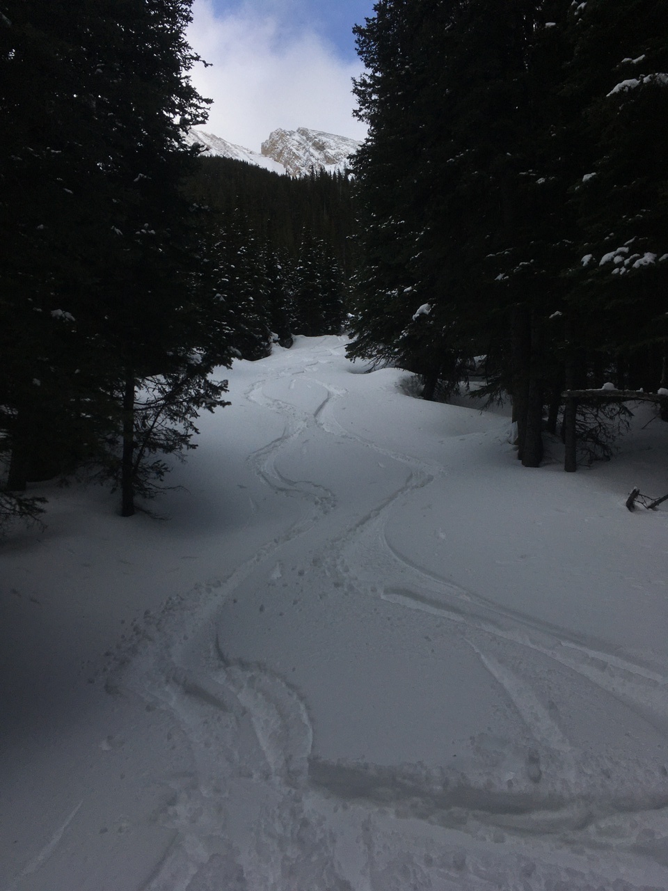 Beautiful lighting as we follow our skin track back down the Snowdrift Trail.
