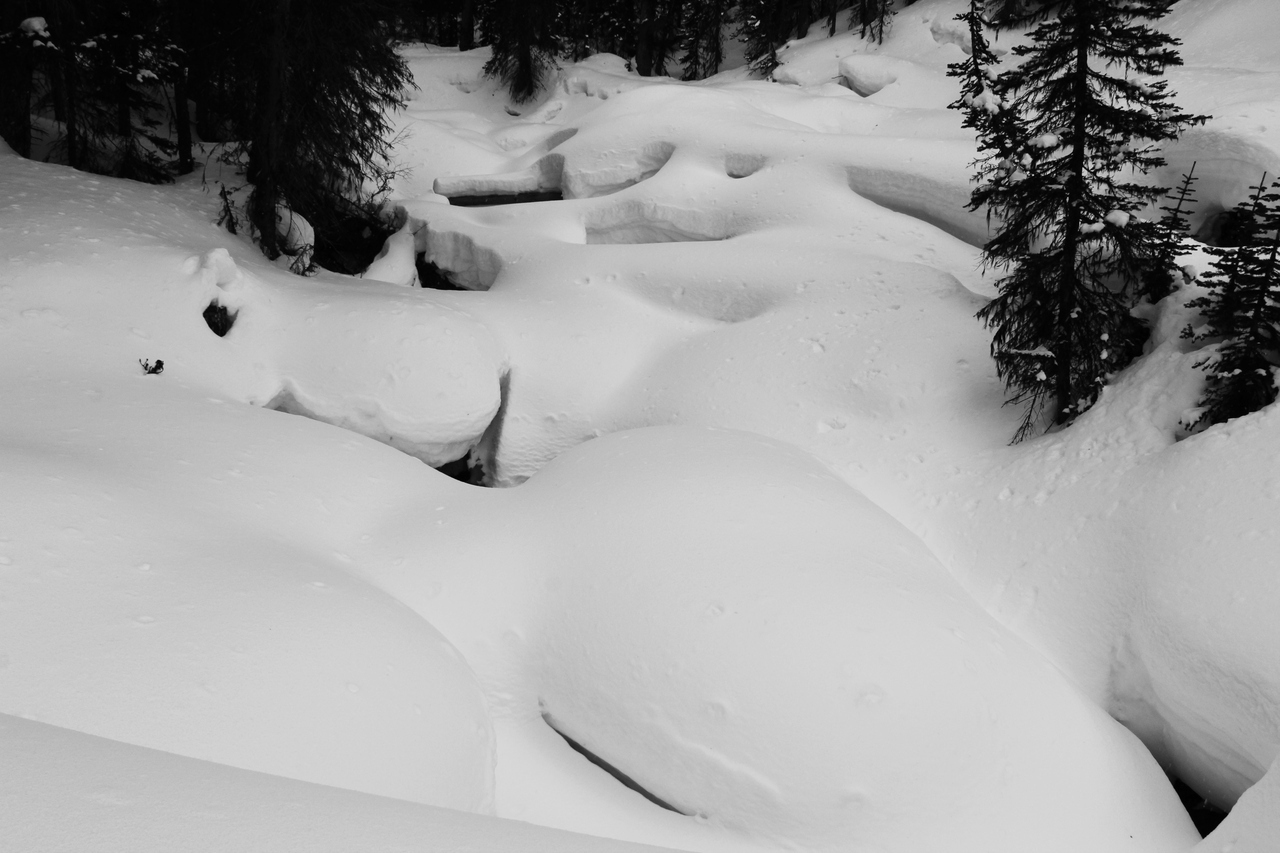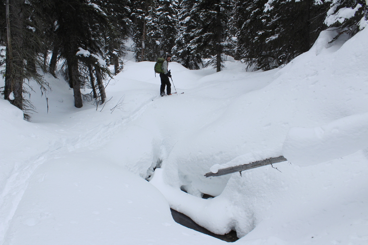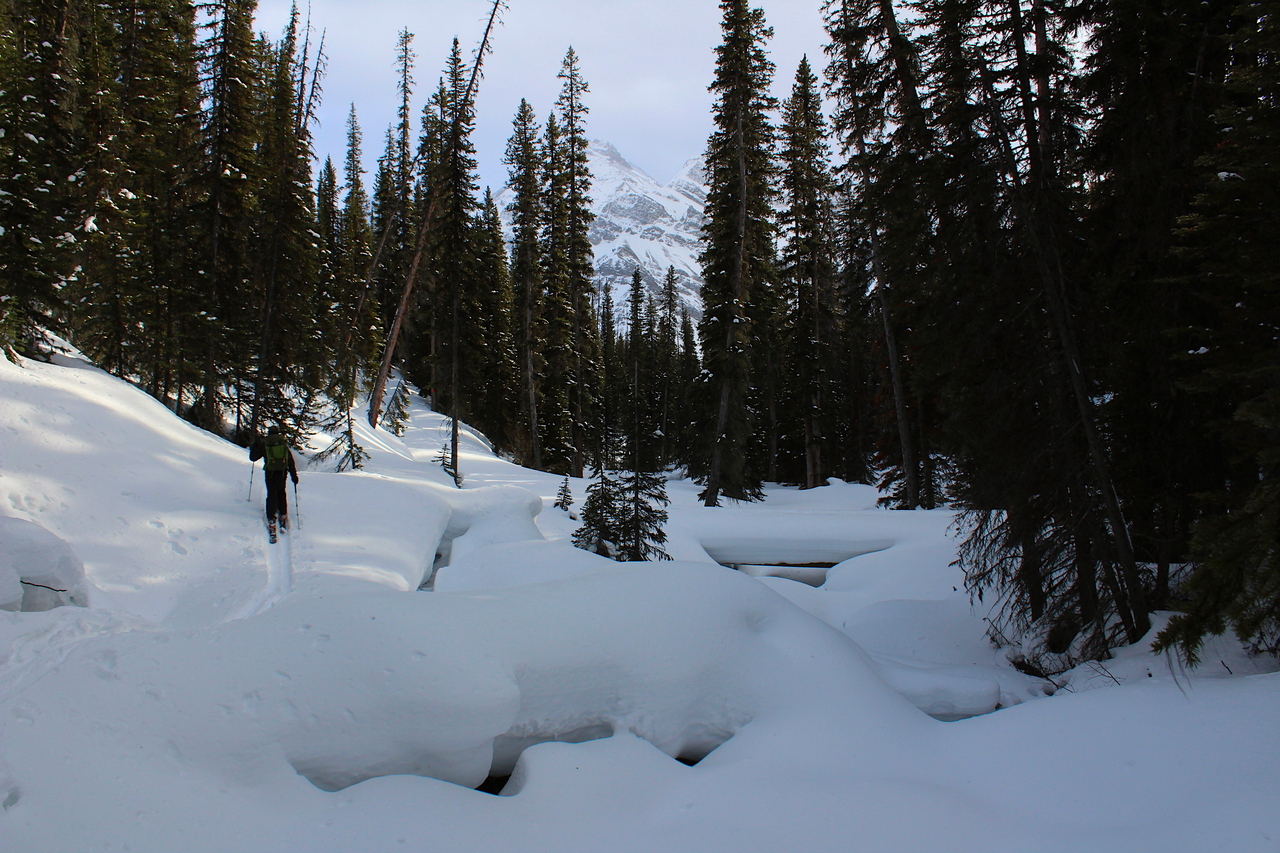 Although the snowshoe trail backtracks slightly to the south, before following up above the east side of the creek, we noticed some "fading" skin tracks following directly along the creek. Enticed by the incredible winter scenery (as well as it being a shortcut ;)), we decided to follow them.