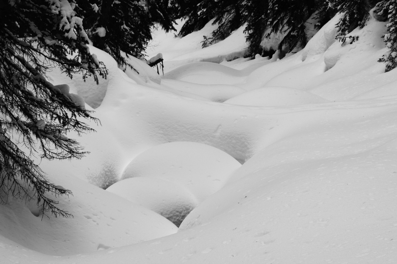 We easily followed the broad snowshoe trail, as it leisurely gained elevation, eventually merging with the Snowdrift Trail (about 1.3km in), continuing towards Headwall Creek.