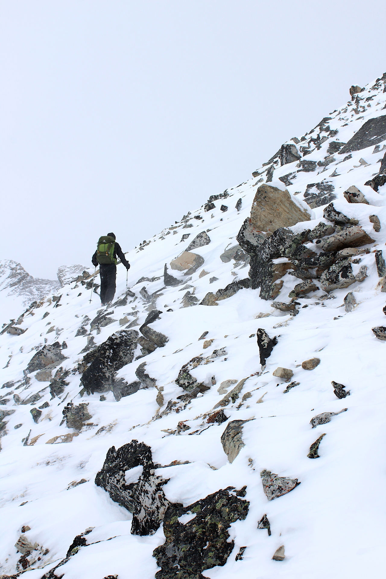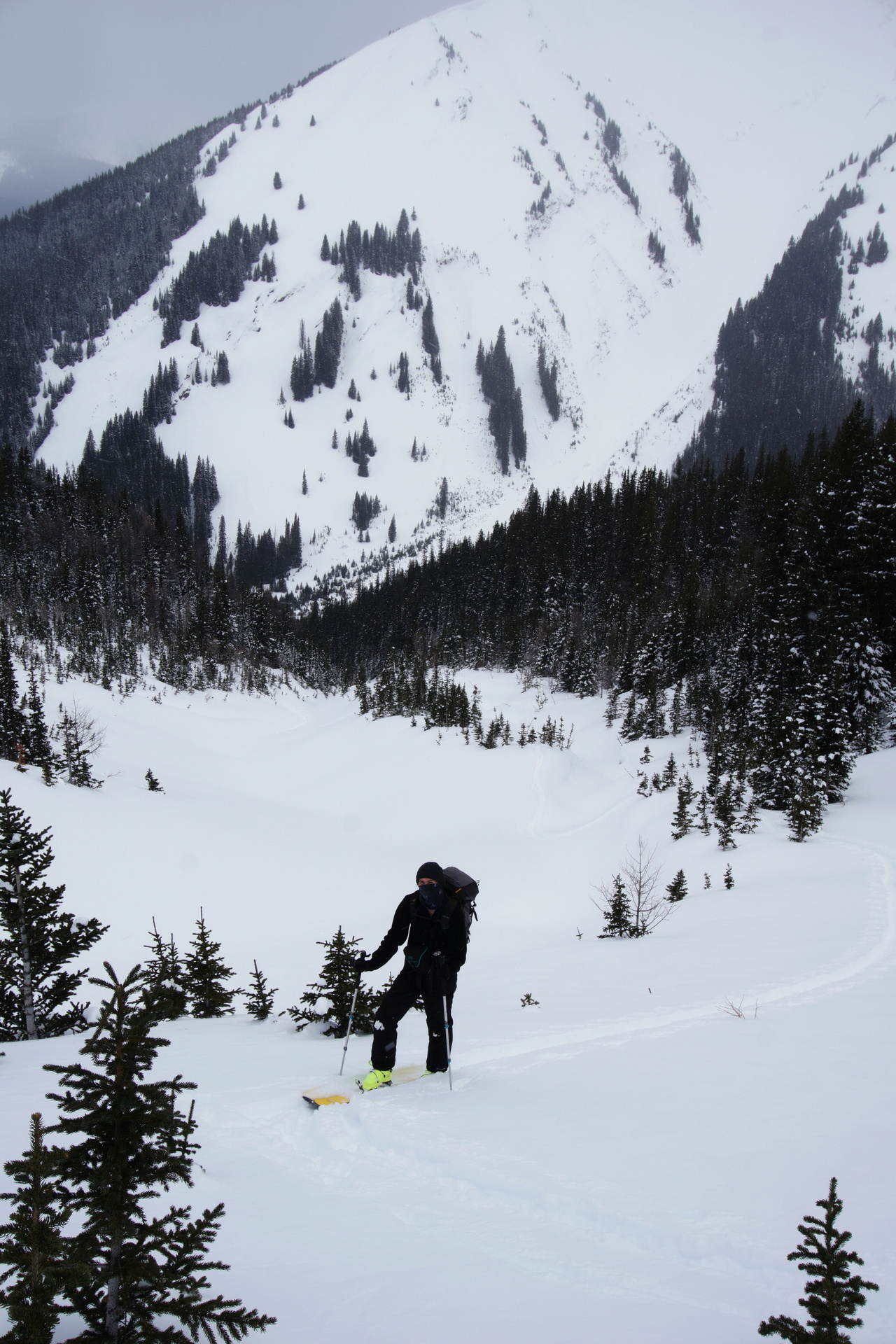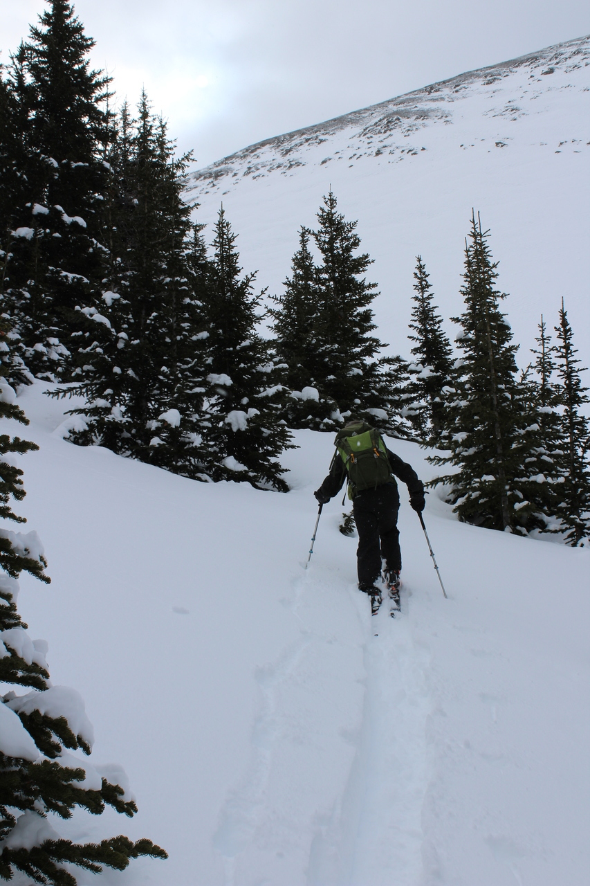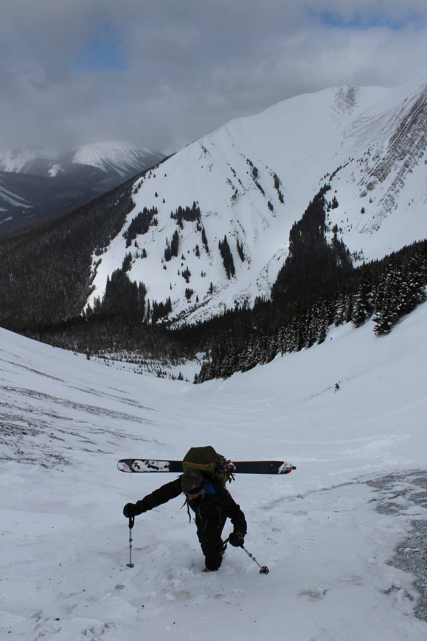 Switch-backing up the drainage, towards the col. Luckily, our brief tree endeavour was just long enough to avoid the bulk of the avalanche terrain. By the time we descended back into the drainage, the slopes to our right were less snow-loaded, and even displayed protruding rocks.