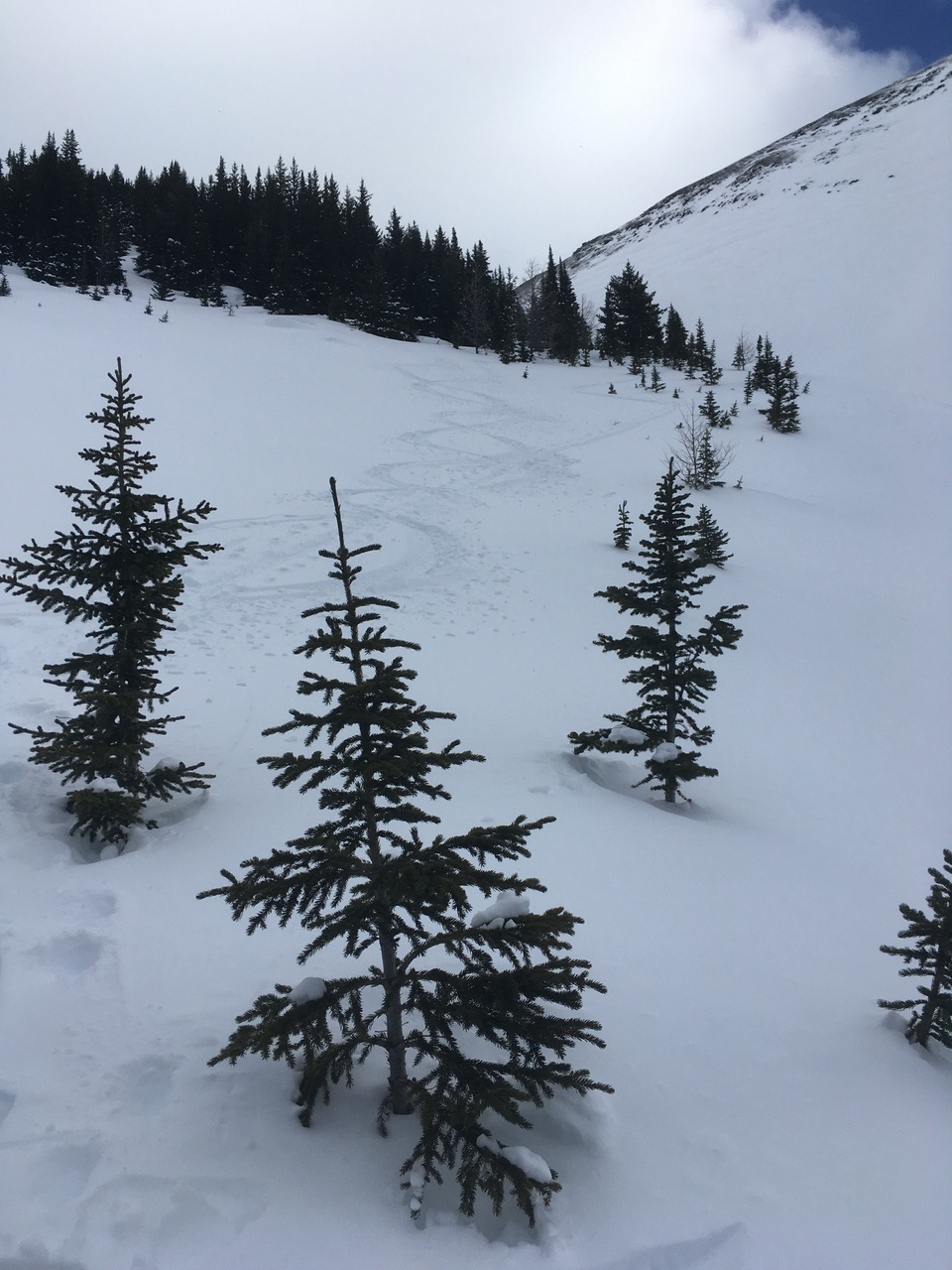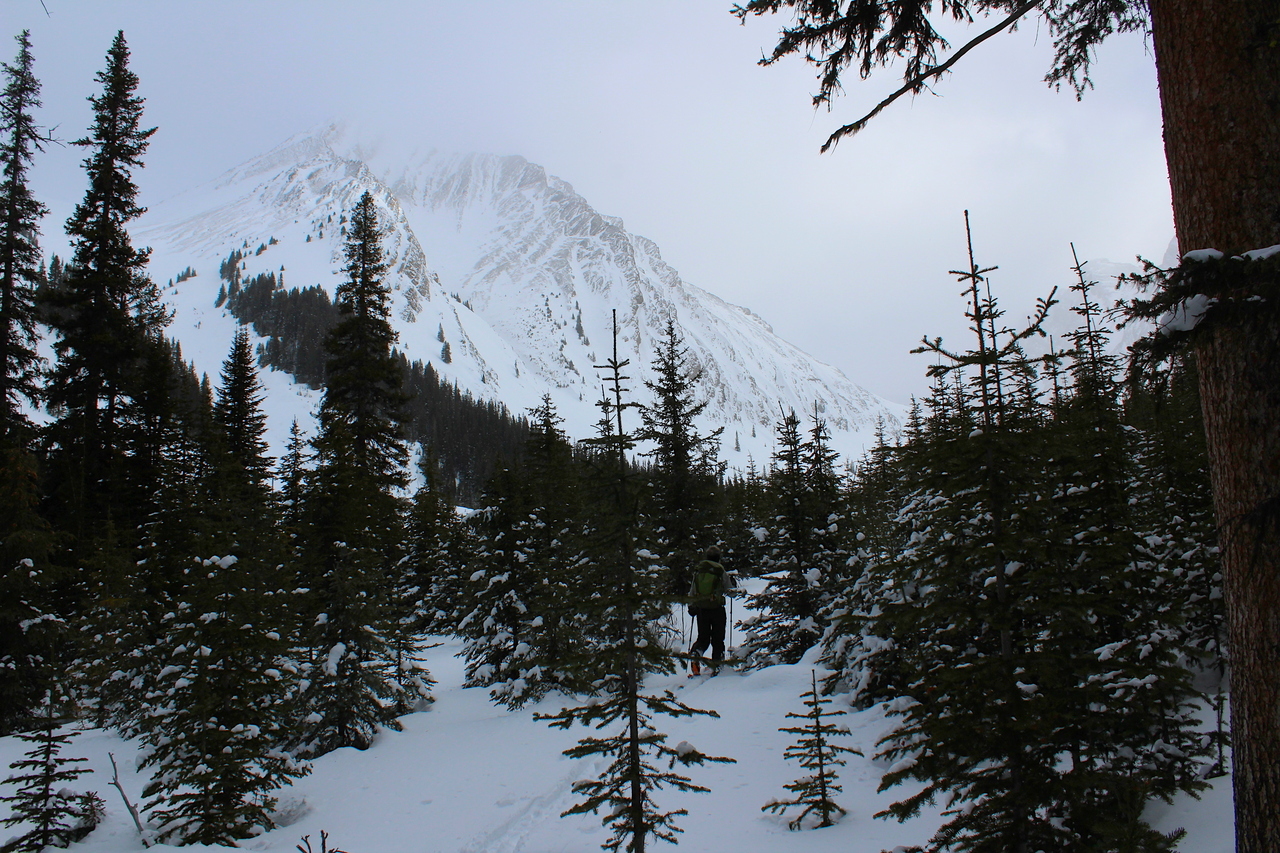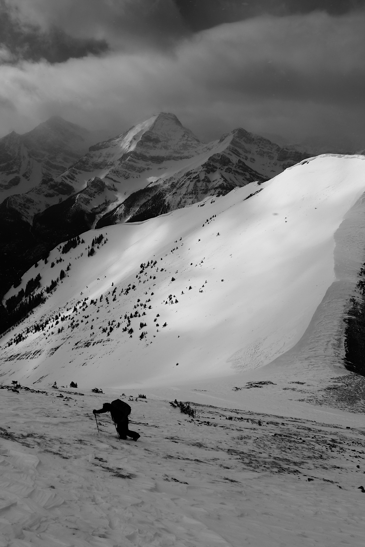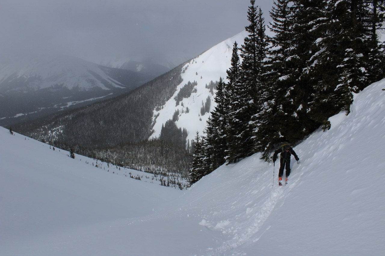 Switch-backing up the drainage, towards the col. Luckily, our brief tree endeavour was just long enough to avoid the bulk of the avalanche terrain. By the time we descended back into the drainage, the slopes to our right were less snow-loaded, and even displayed protruding rocks.