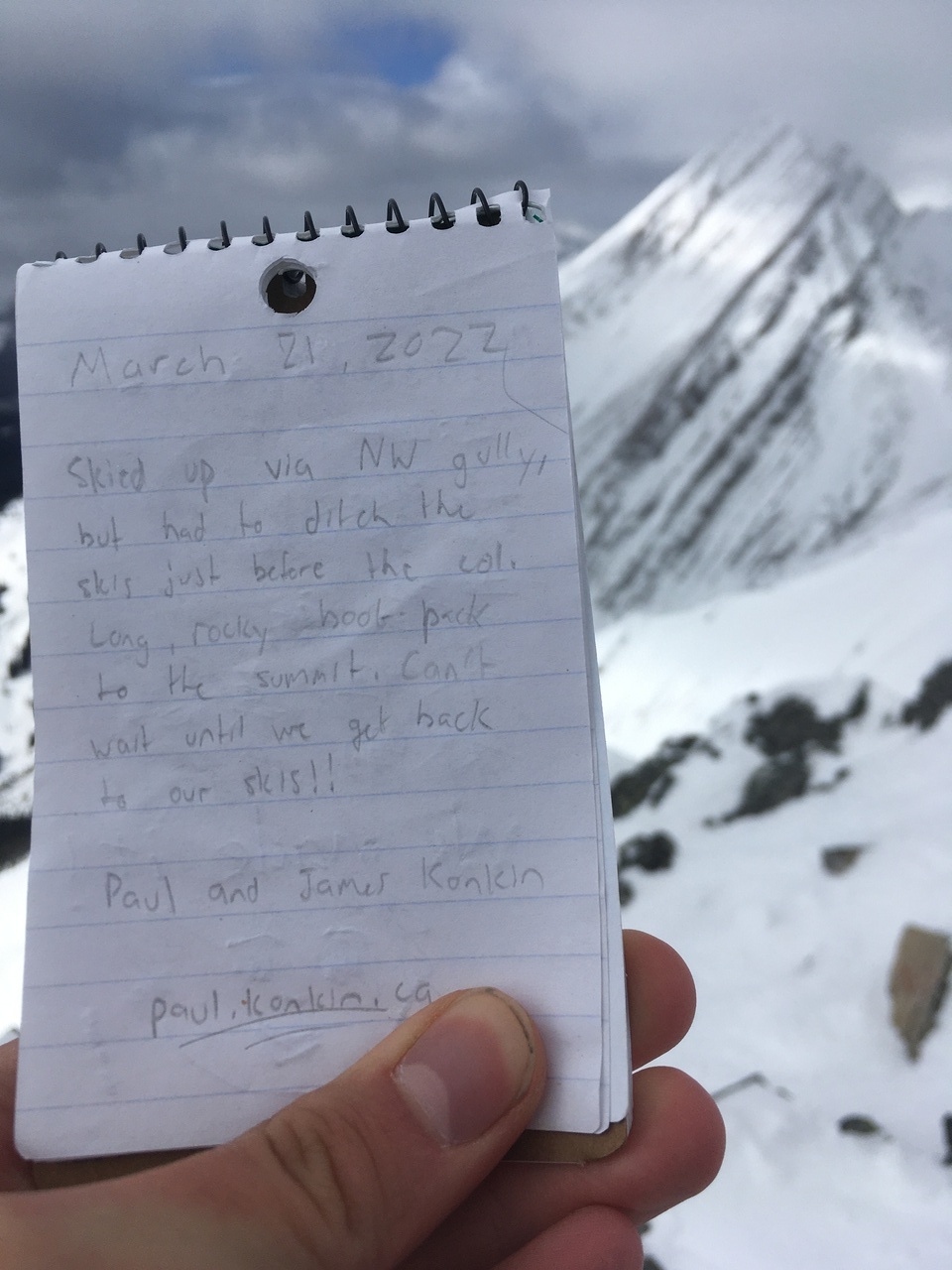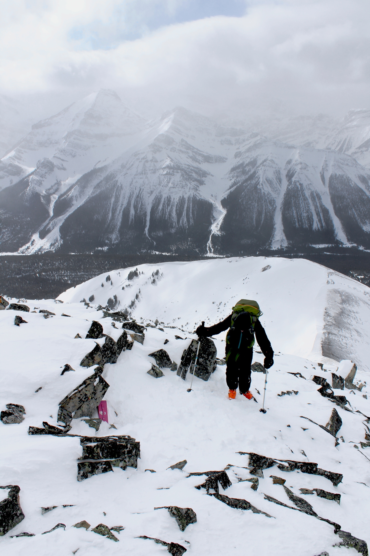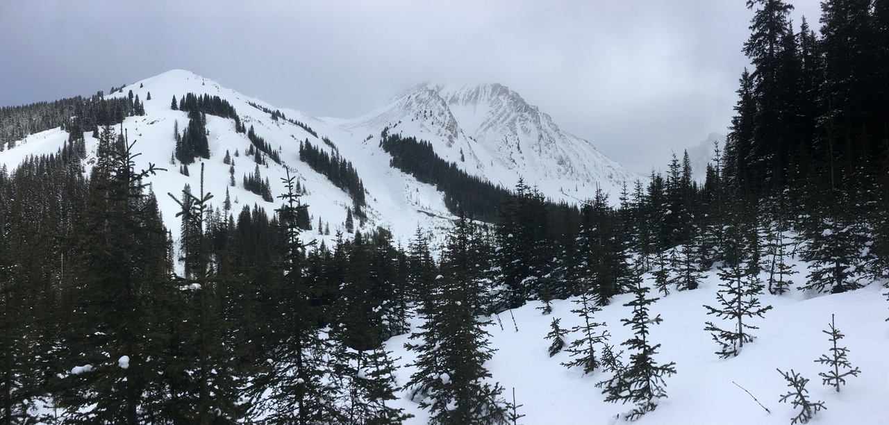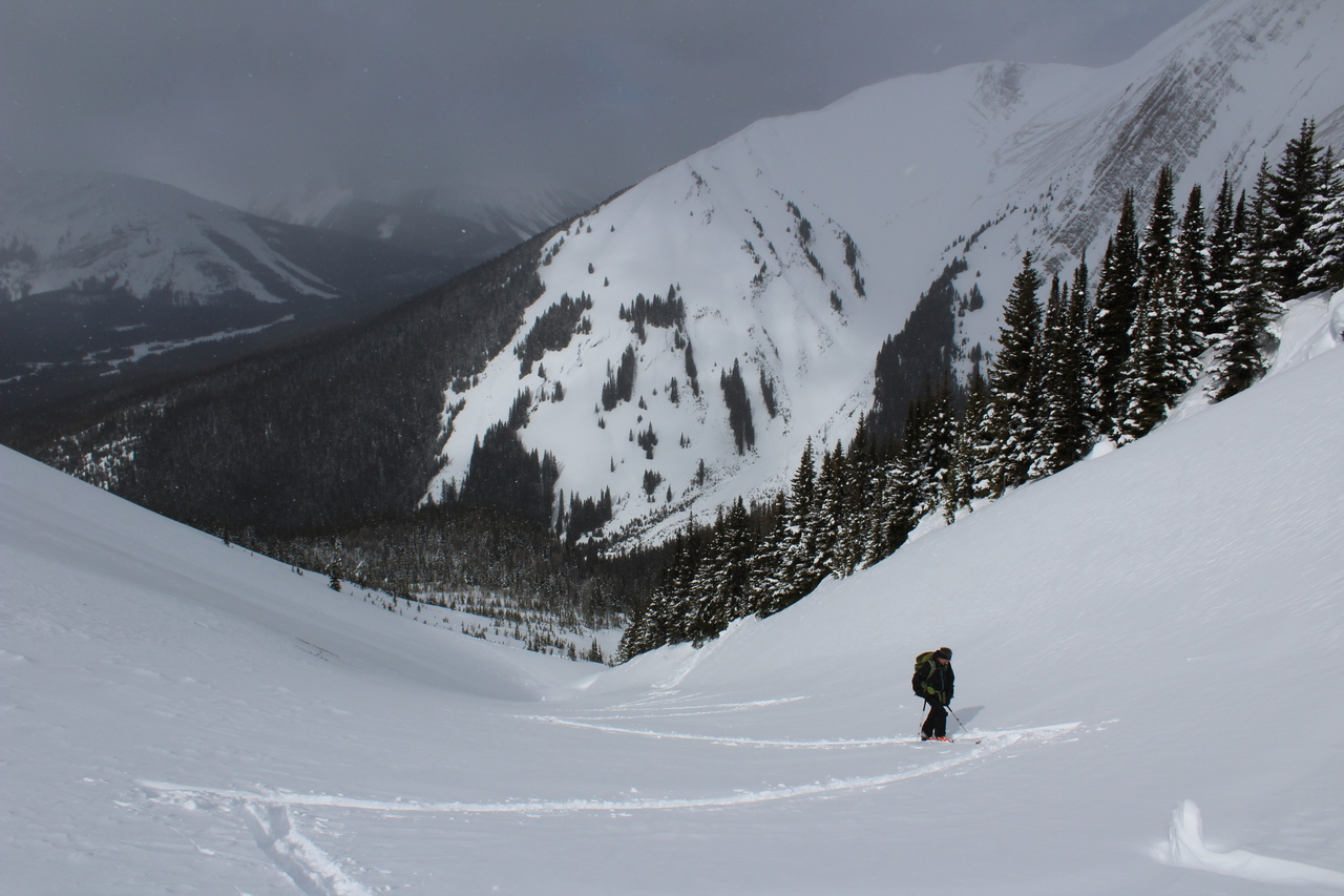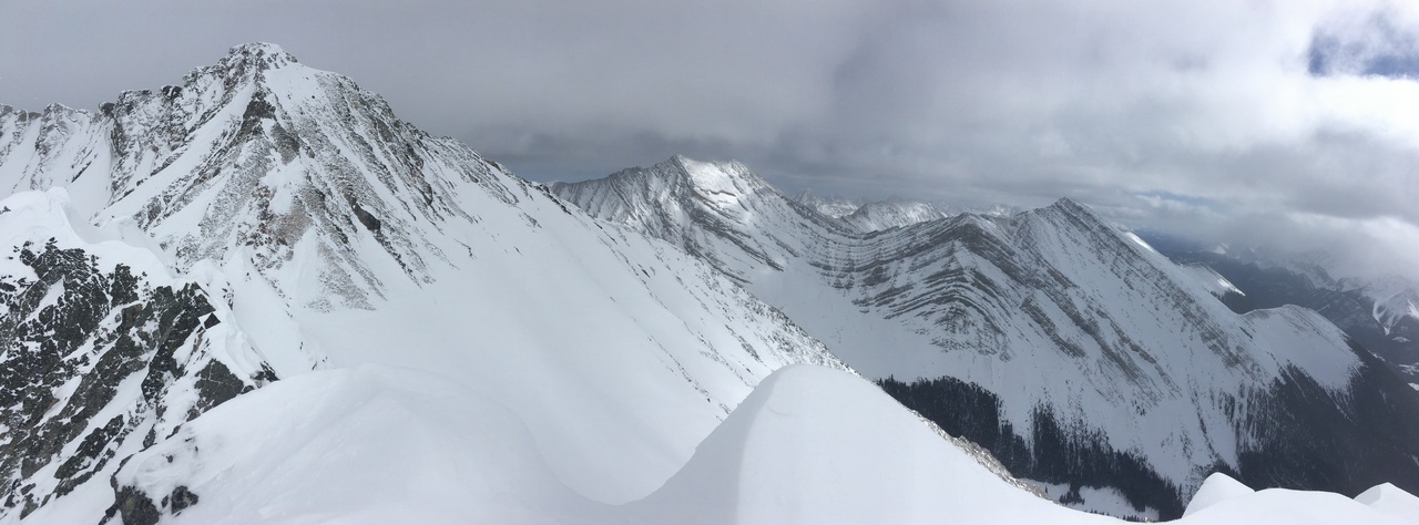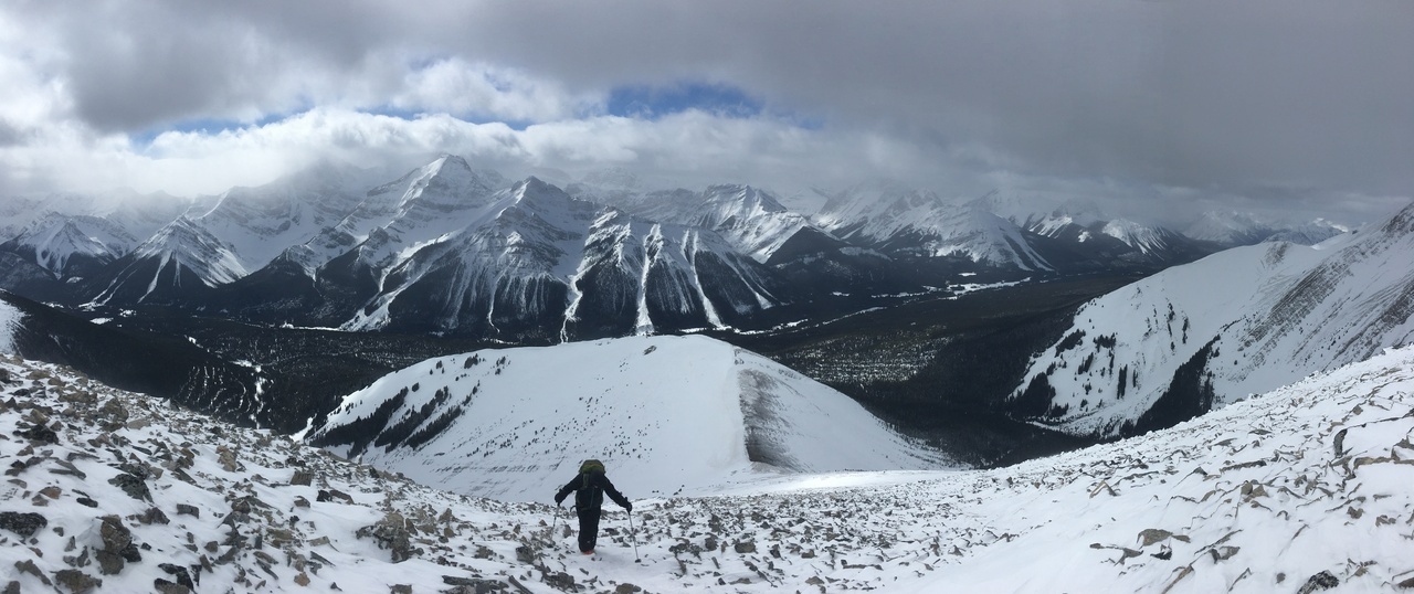 Our last view back to Chesmill, as we reascend on the west side of Headwall Creek, before a mainly downhill skin track back to the highway! Although the drab cloud prevailed for the length of our summit stay, and we weren't granted the spectacular views you'd expect from this viewpoint on a clear day, I greatly enjoyed this trip! The long rocky bootpack is absolutely brutal in the moment, but the combination of a ski approach, a boot pack to make the summit, and finally an enjoyable ride down, made this feel like our first complete ski ascent! It's definitely one I'll remember (and this time in a good way!...unlike Wolverine Ridge.)