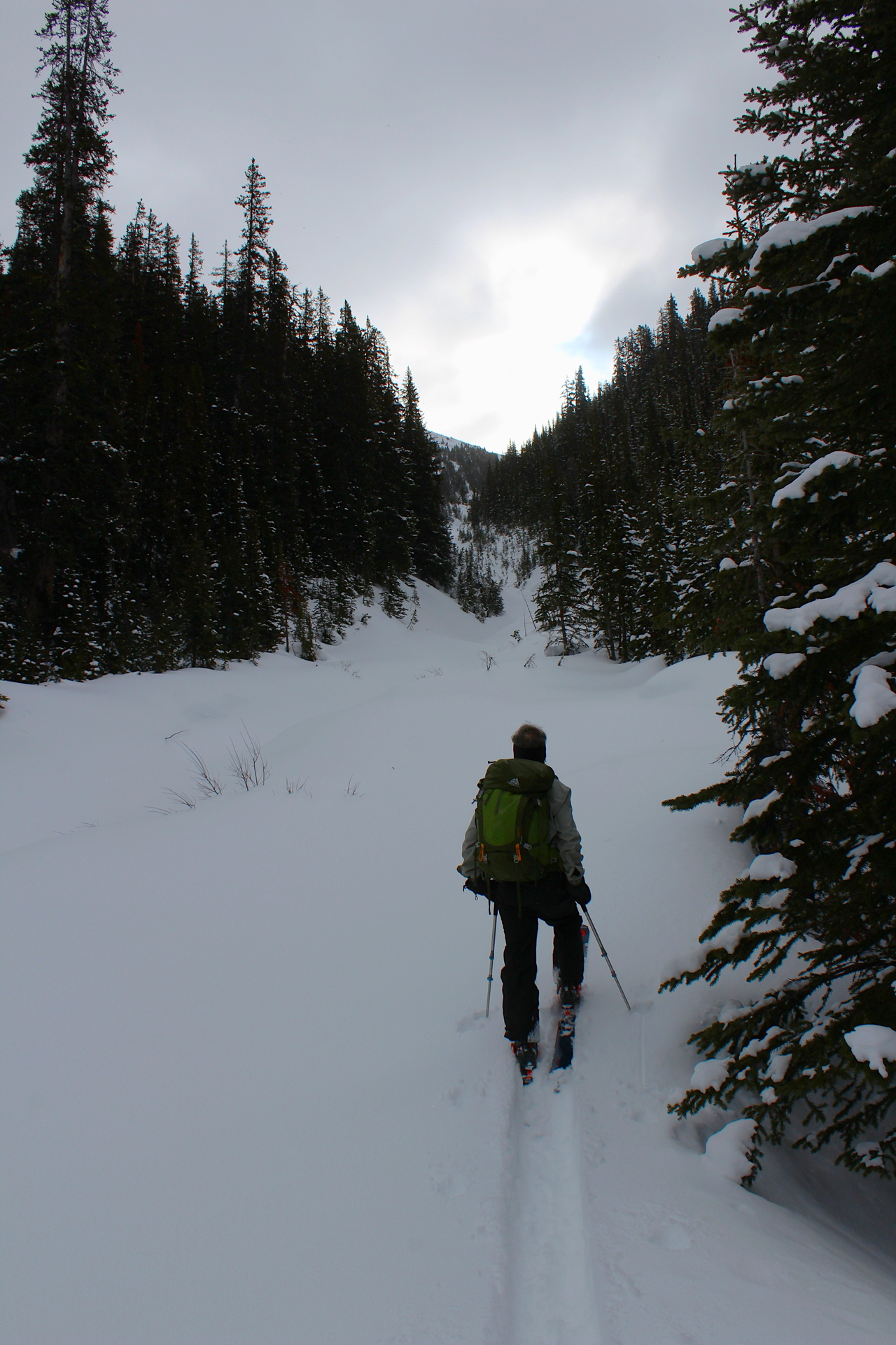 Looking back as we emerge from the narrow drainage. The drainage starts off mellow, but some sections do become quite steep! (emphasized when you can't switch back much due to the even steeper sides!)