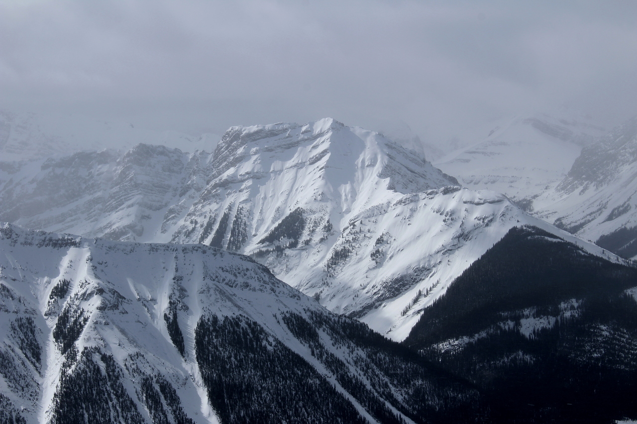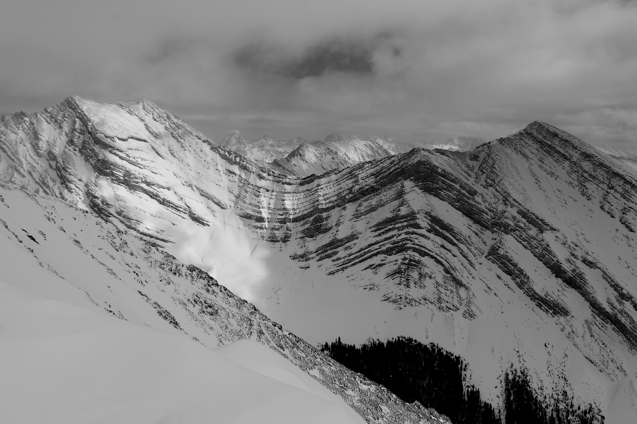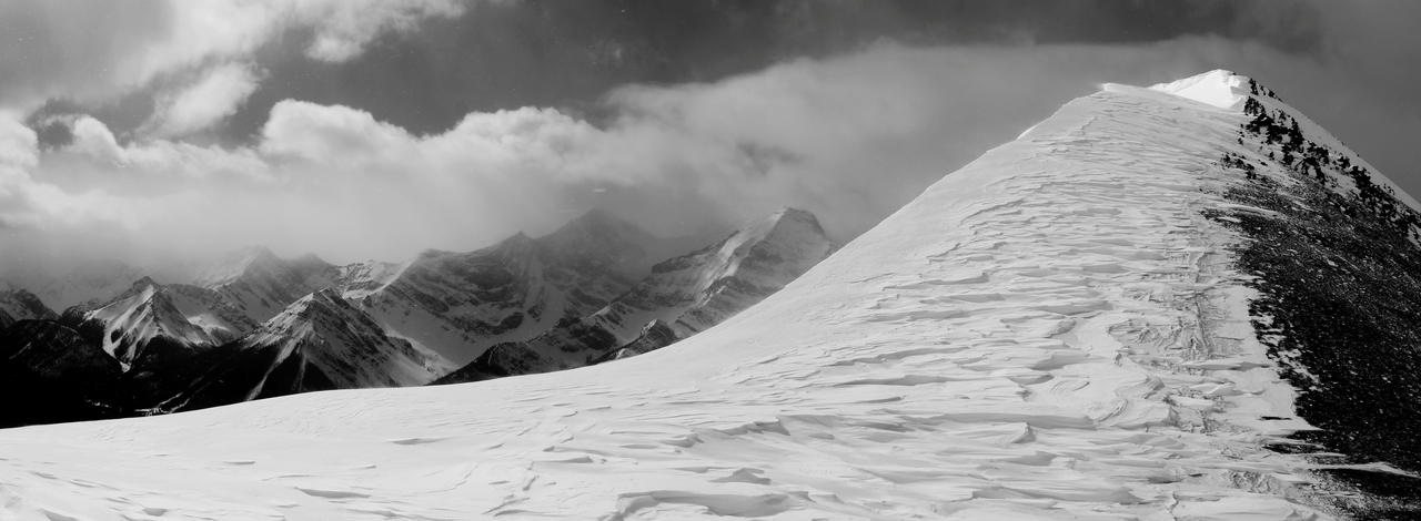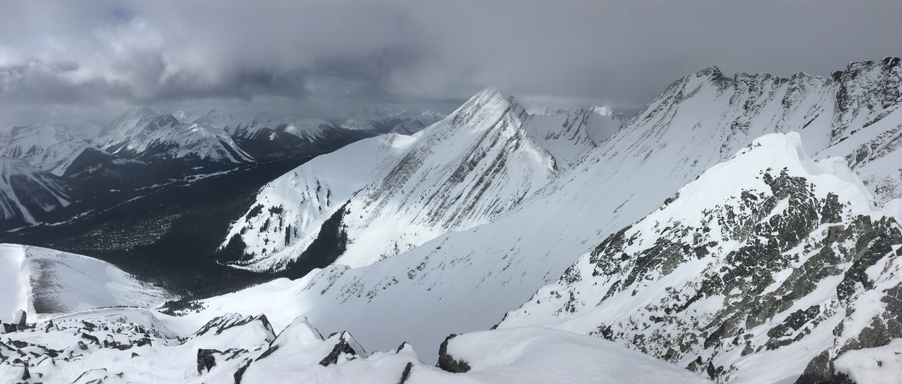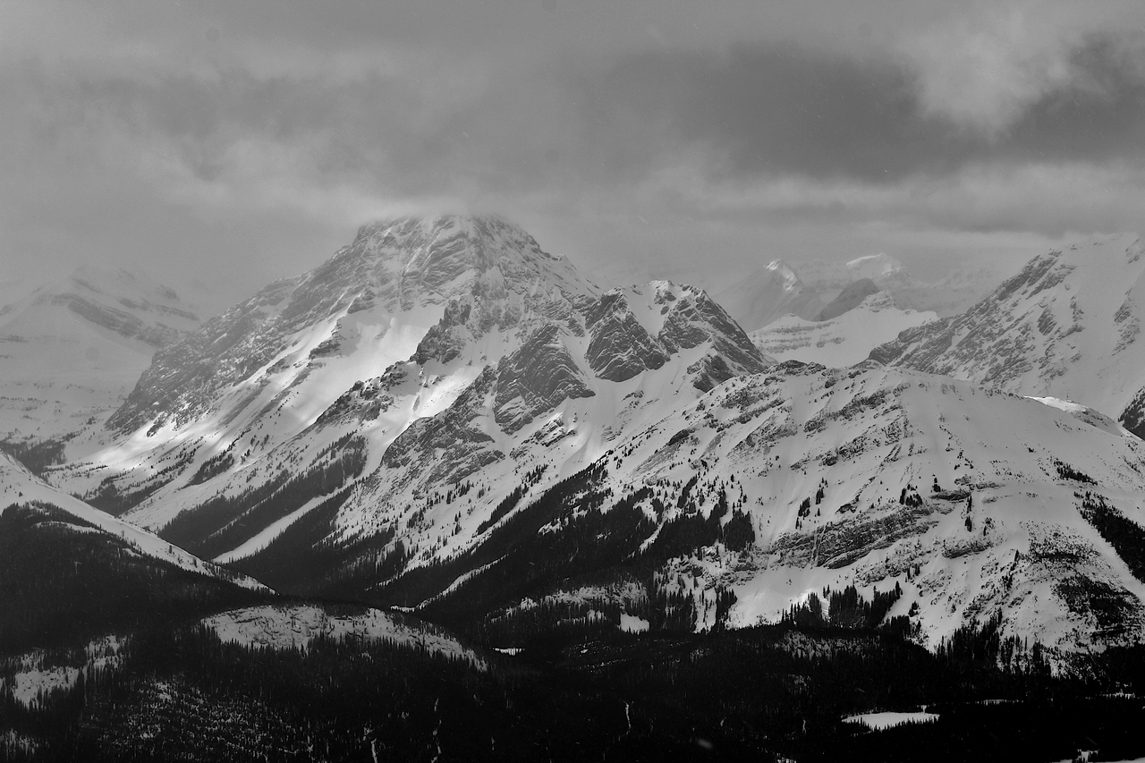 Mount Chester rises impressively in the opposite direction, with well known peaks such as Mount Birdwood, Commonwealth Peak, Mount Smuts, and The Fist, all barely visible in the dark cloud to the left.