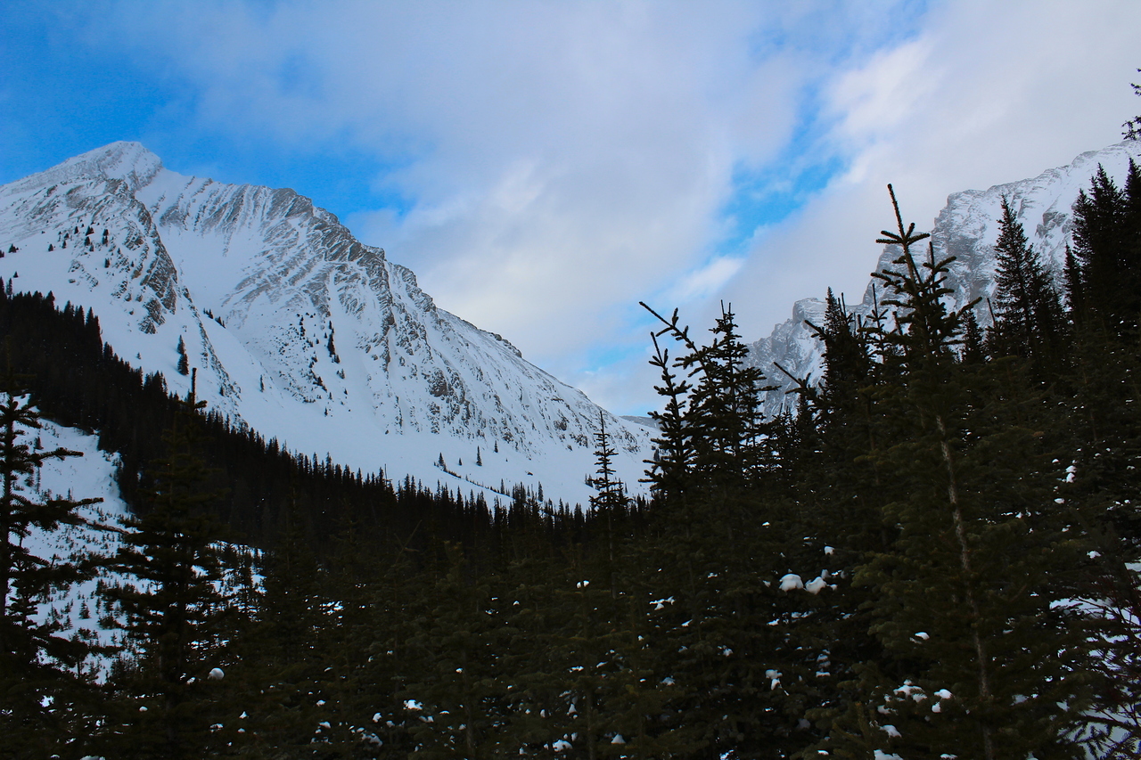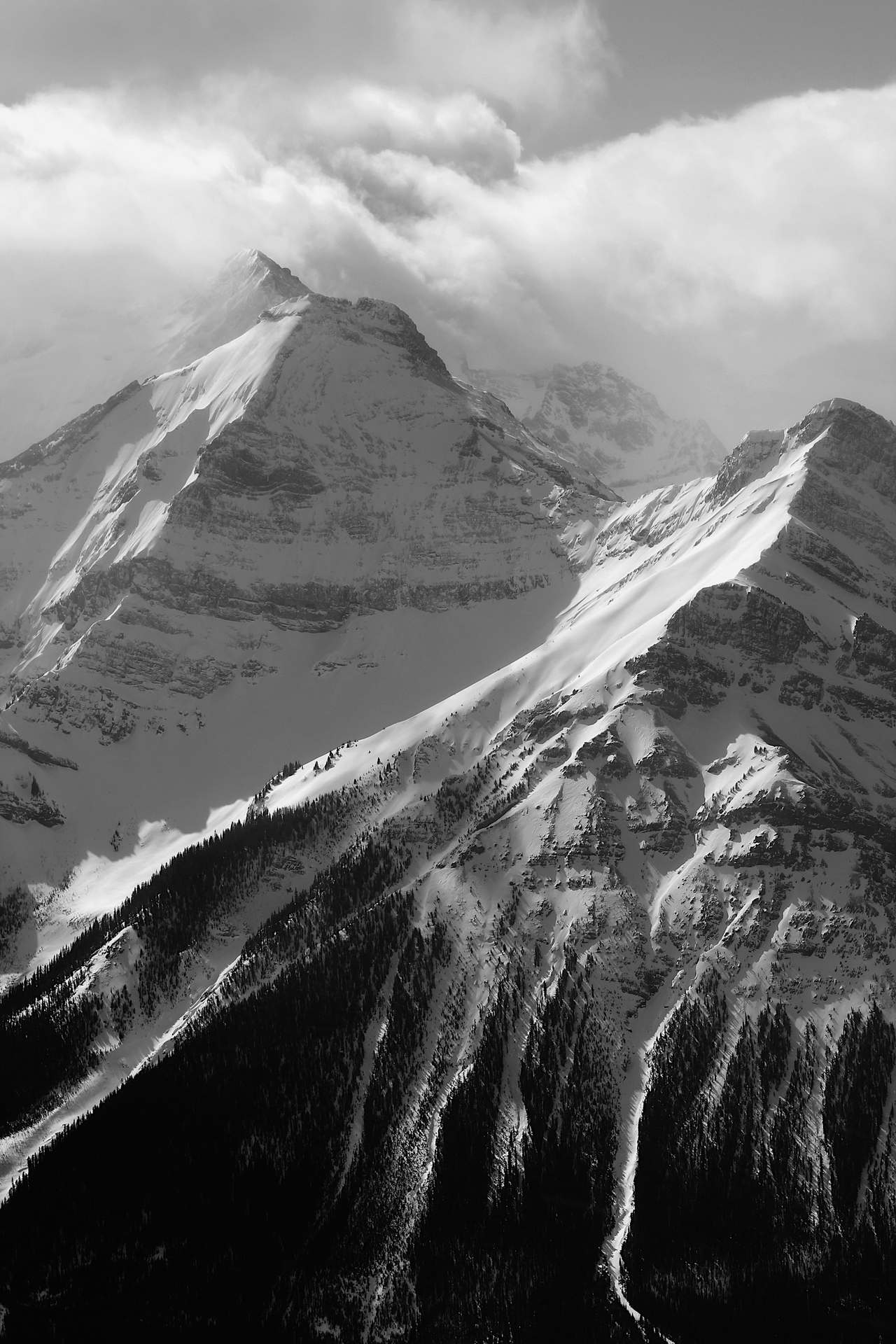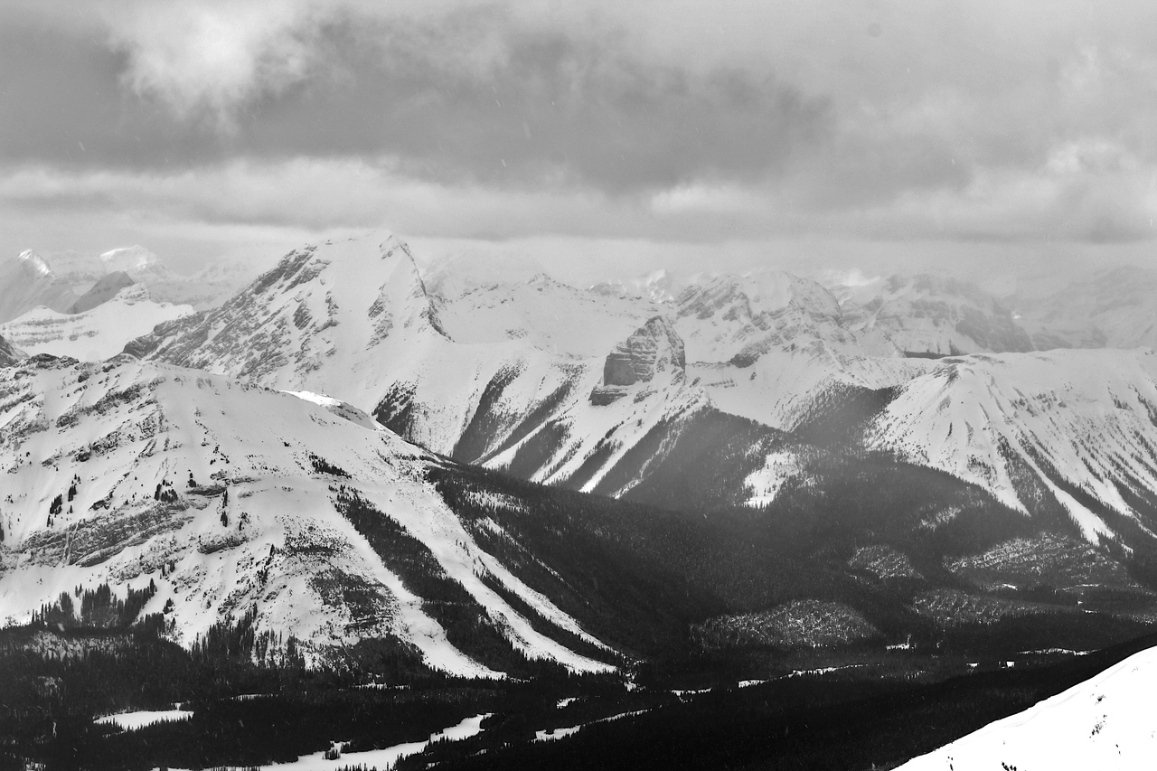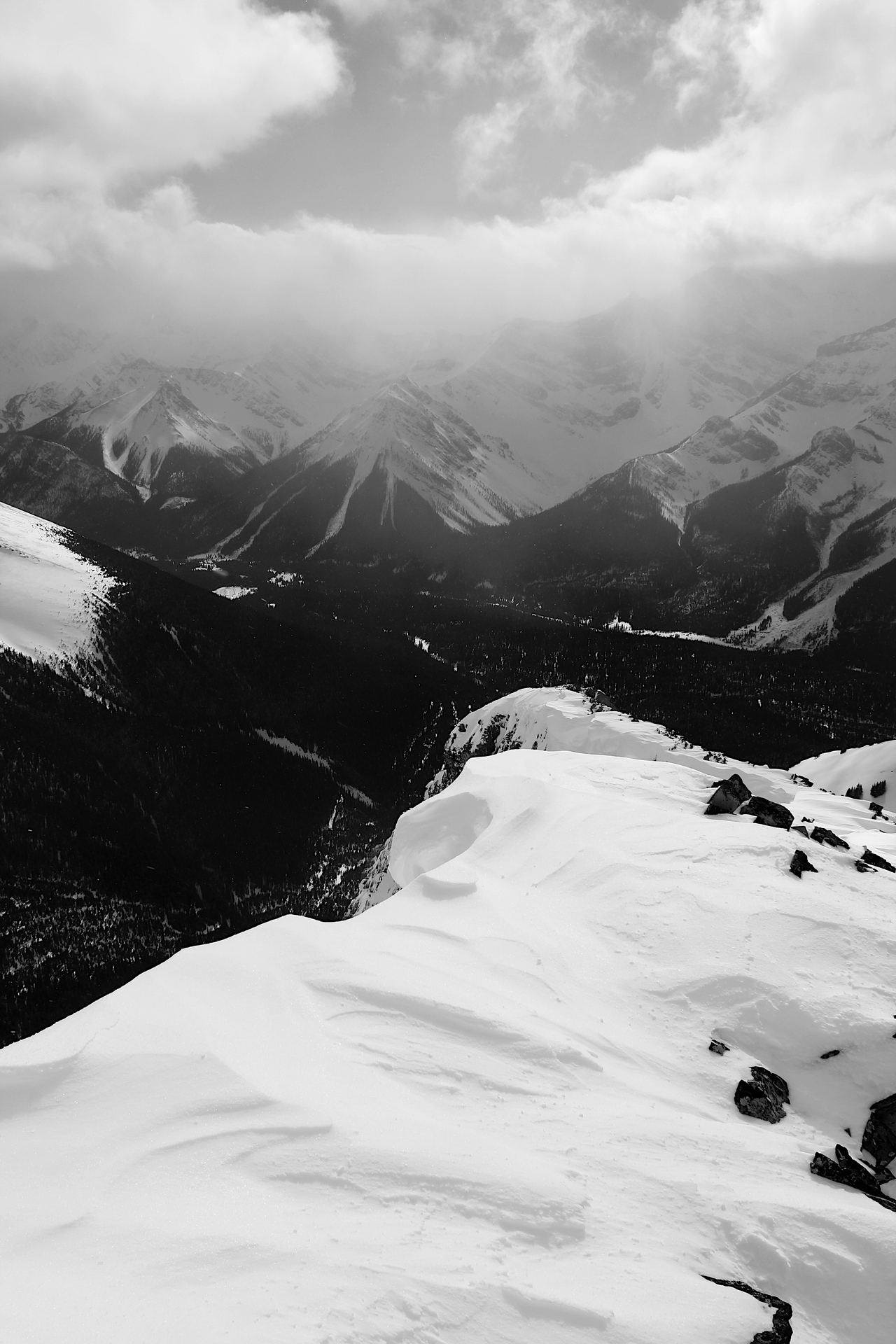 Mount Chester rises impressively in the opposite direction, with well known peaks such as Mount Birdwood, Commonwealth Peak, Mount Smuts, and The Fist, all barely visible in the dark cloud to the left.