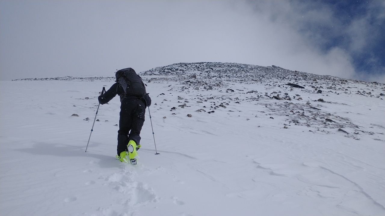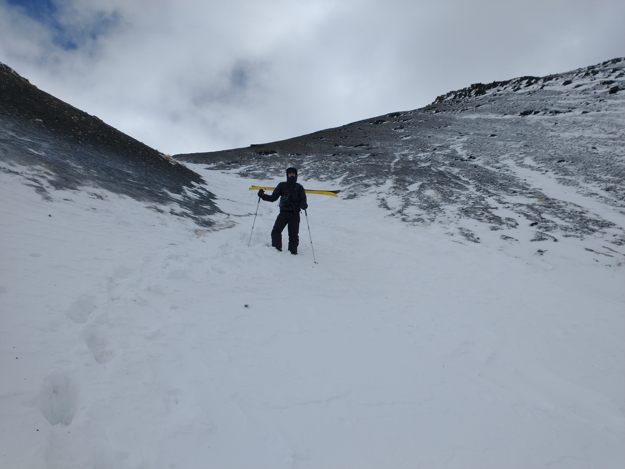 The snow soon became sparse, and we were forced to make the final trudge up to the col in ski boots.