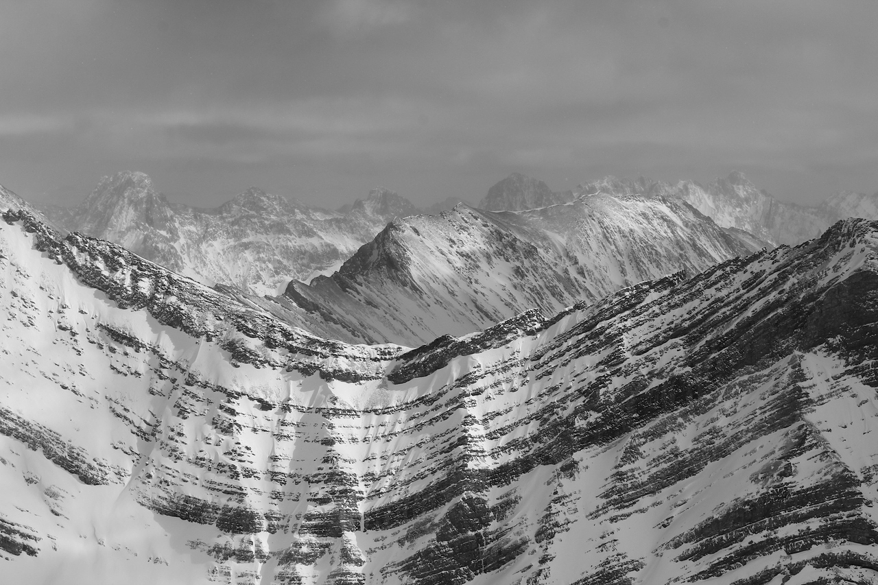 Hero's Knob (which sports the popular "Sweet 16" backcountry ski run), sits below the larger, and largely hidden, impressive peaks beyond.