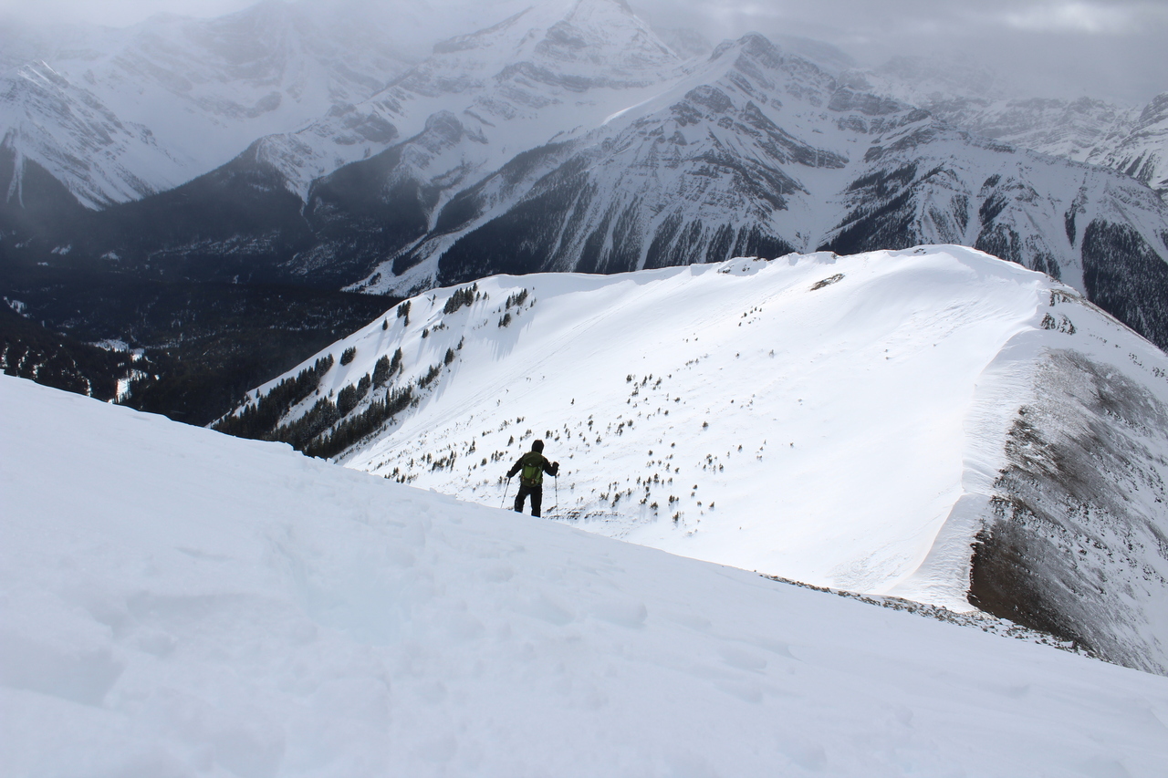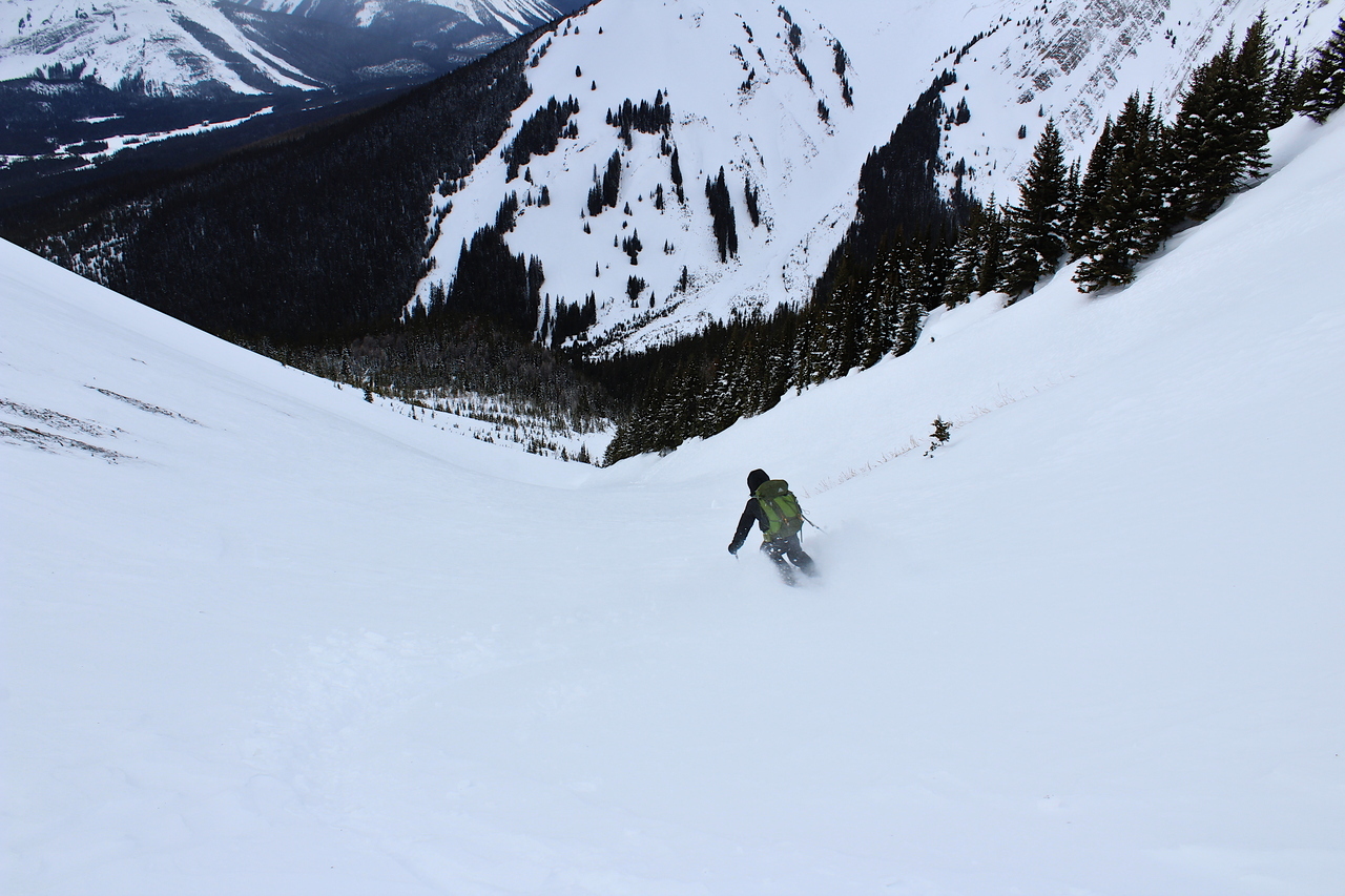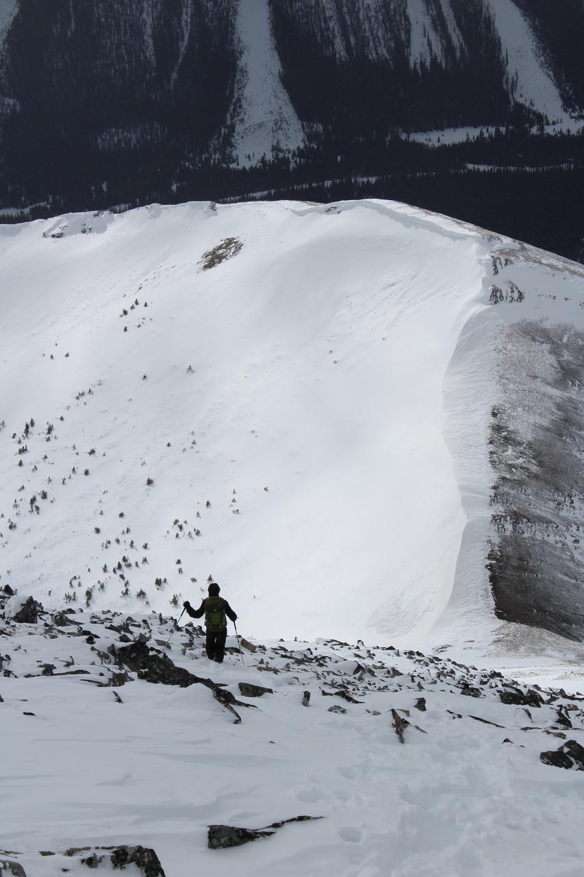 My dad reaches the col, above some failed cornice debris from the sub-peak. Other than some slick slabs, surprising us beneath the snow, as well as being in a constant battle with my bottom buckle (it just didn't want to stay closed!), our strategy worked quite well, and we made it down to the col in a fraction of the time it took on ascent.