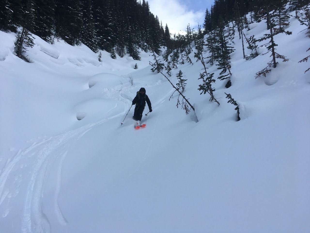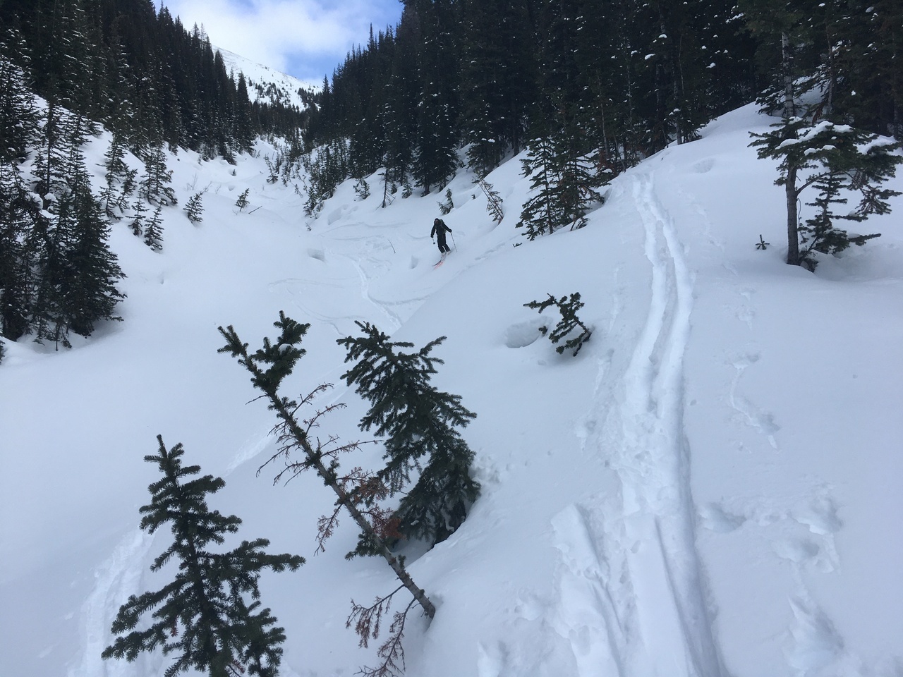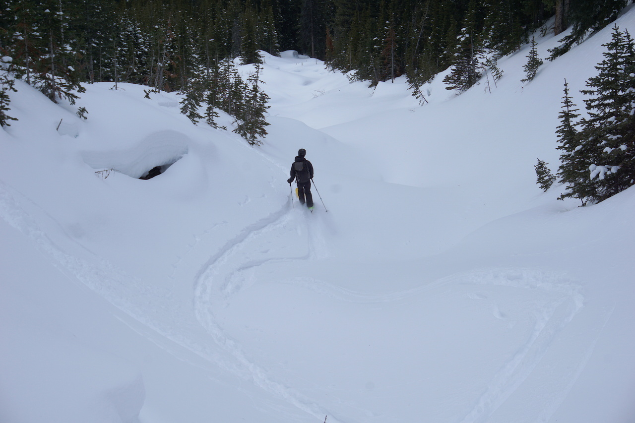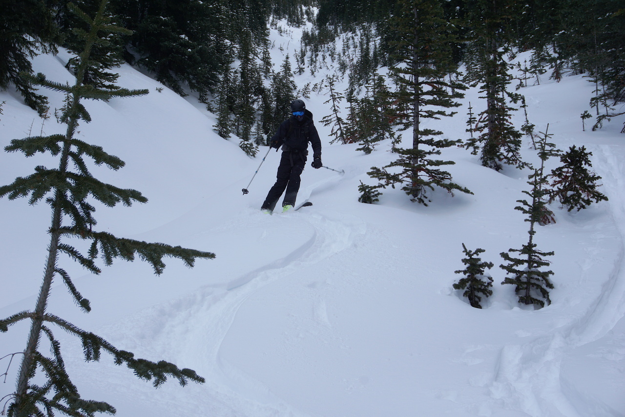 Although an enjoyable run, it's probably not a great place for laps...One skin track up, and a couple ski tracks down, already use up a good chunk of the untouched pow!
