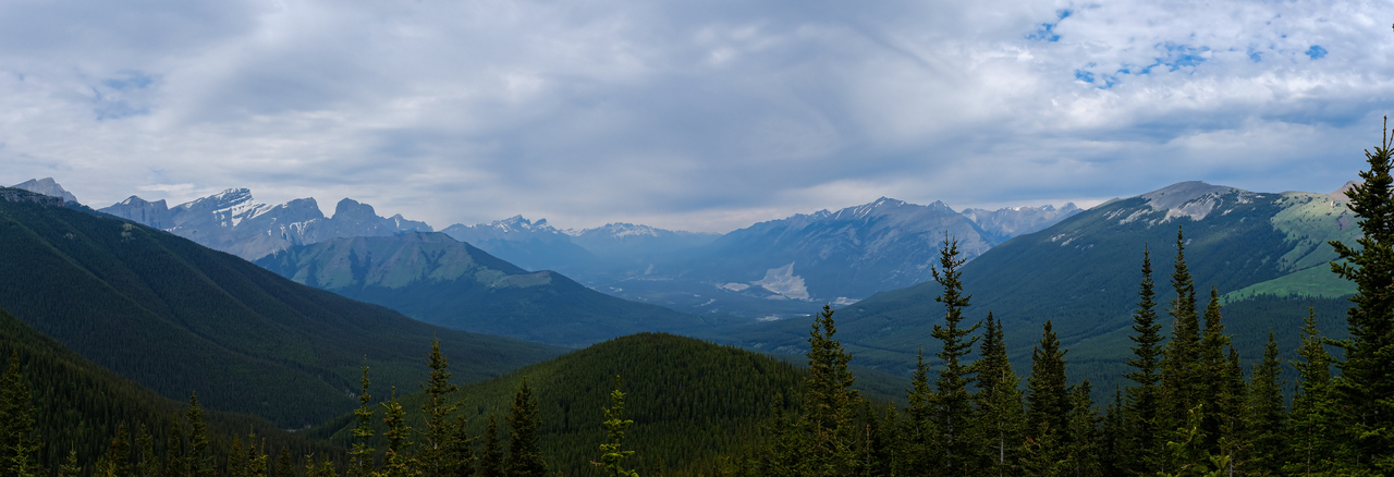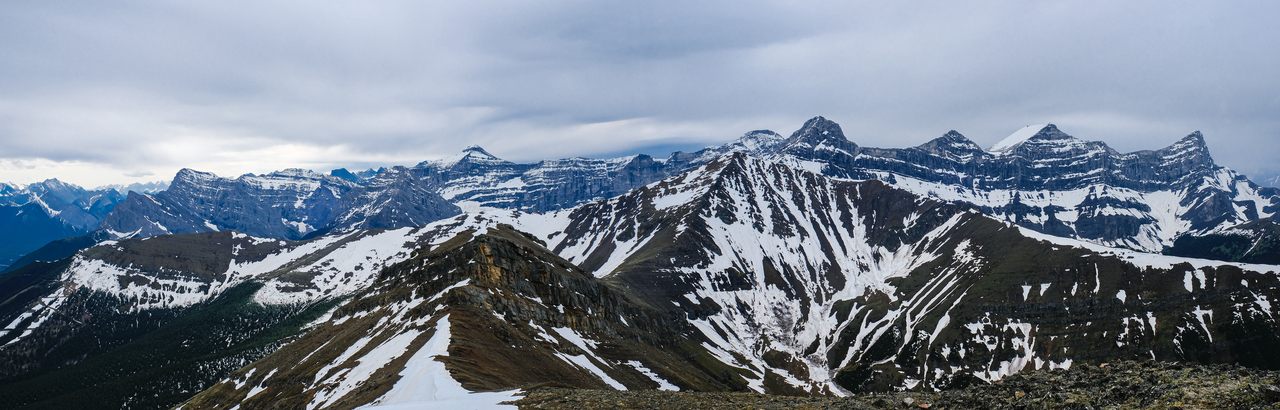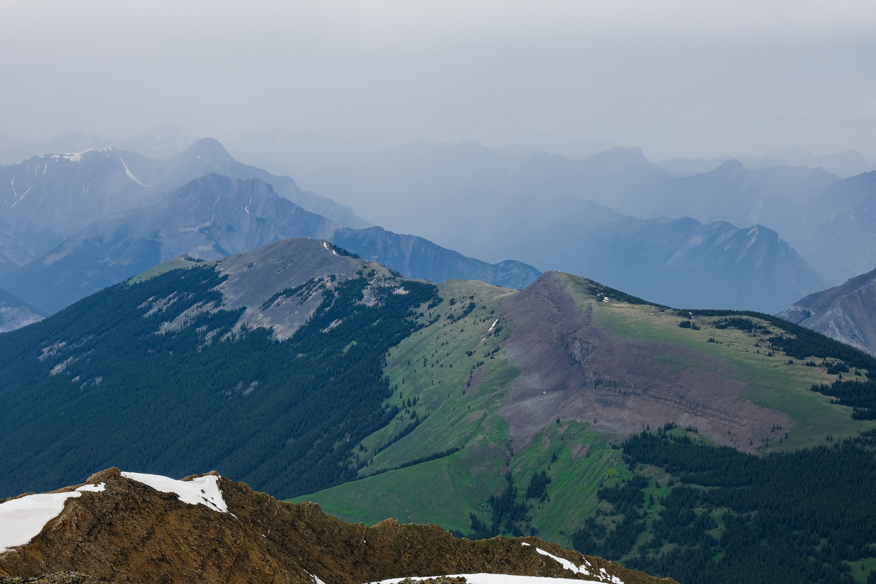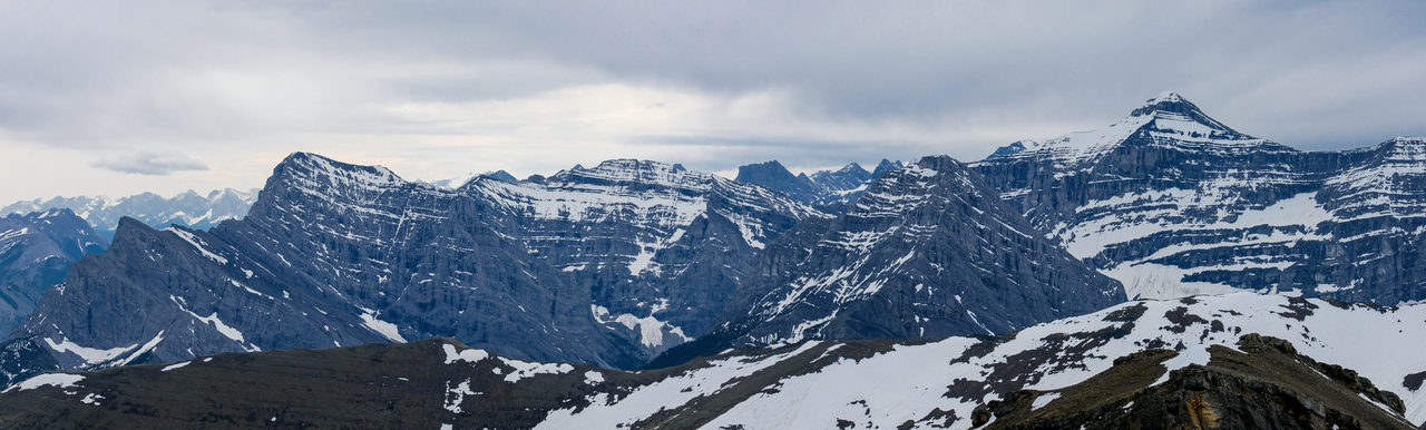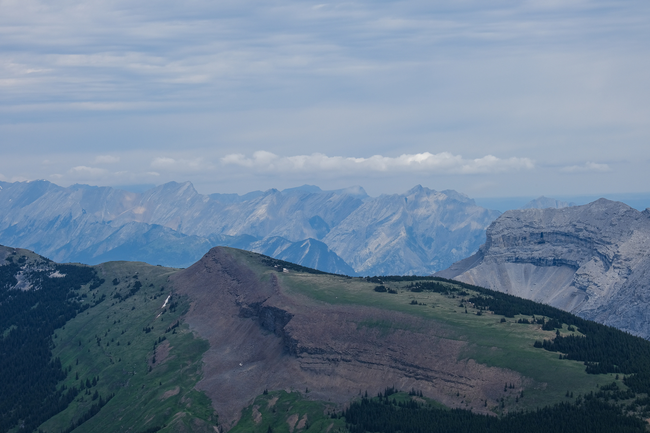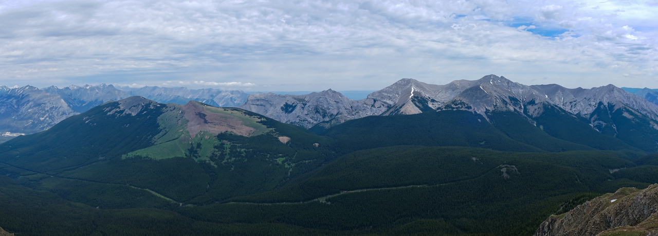 Mount Kidd, Kidd South Peak, Fortress and Chester (distant), Ribbon Peak, and Mount Bogart line up to the south.