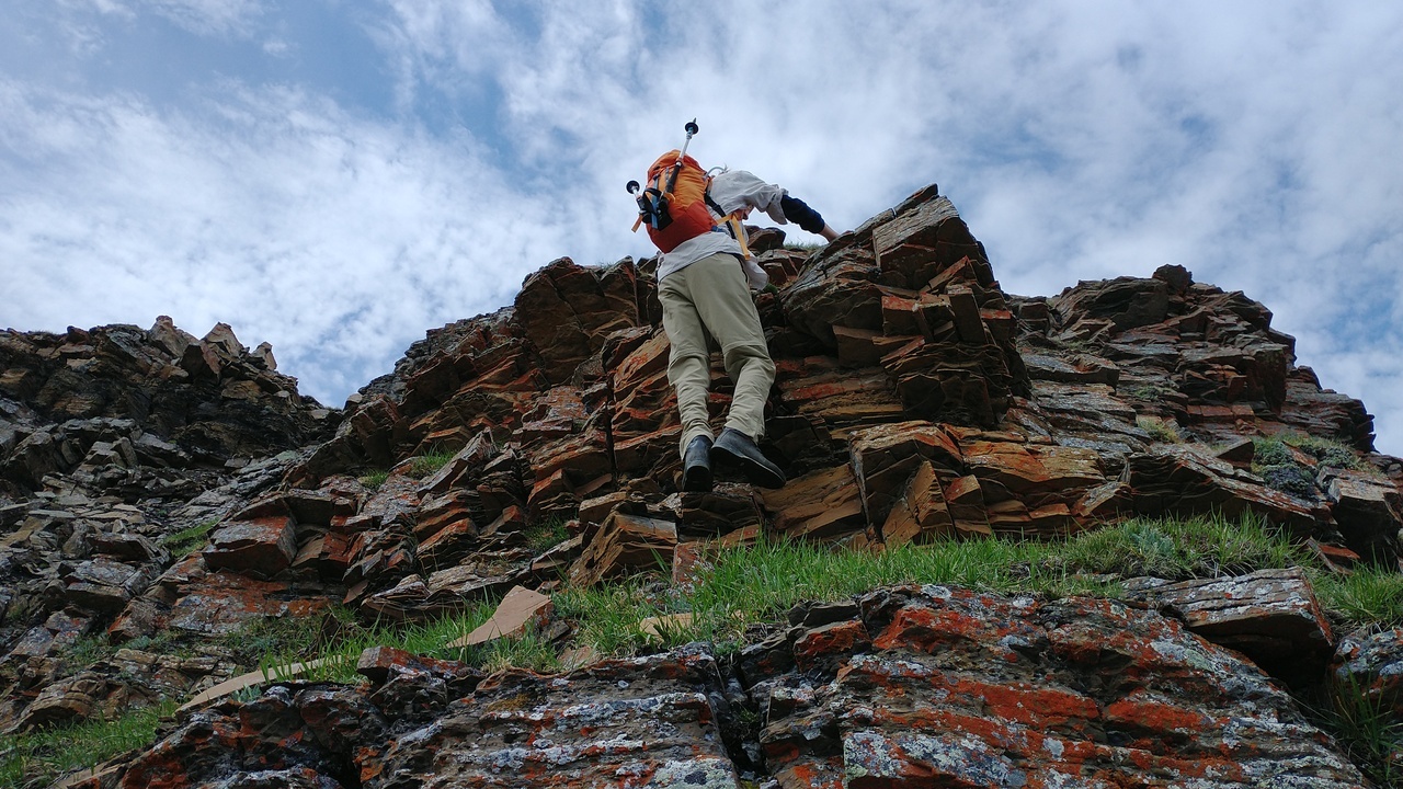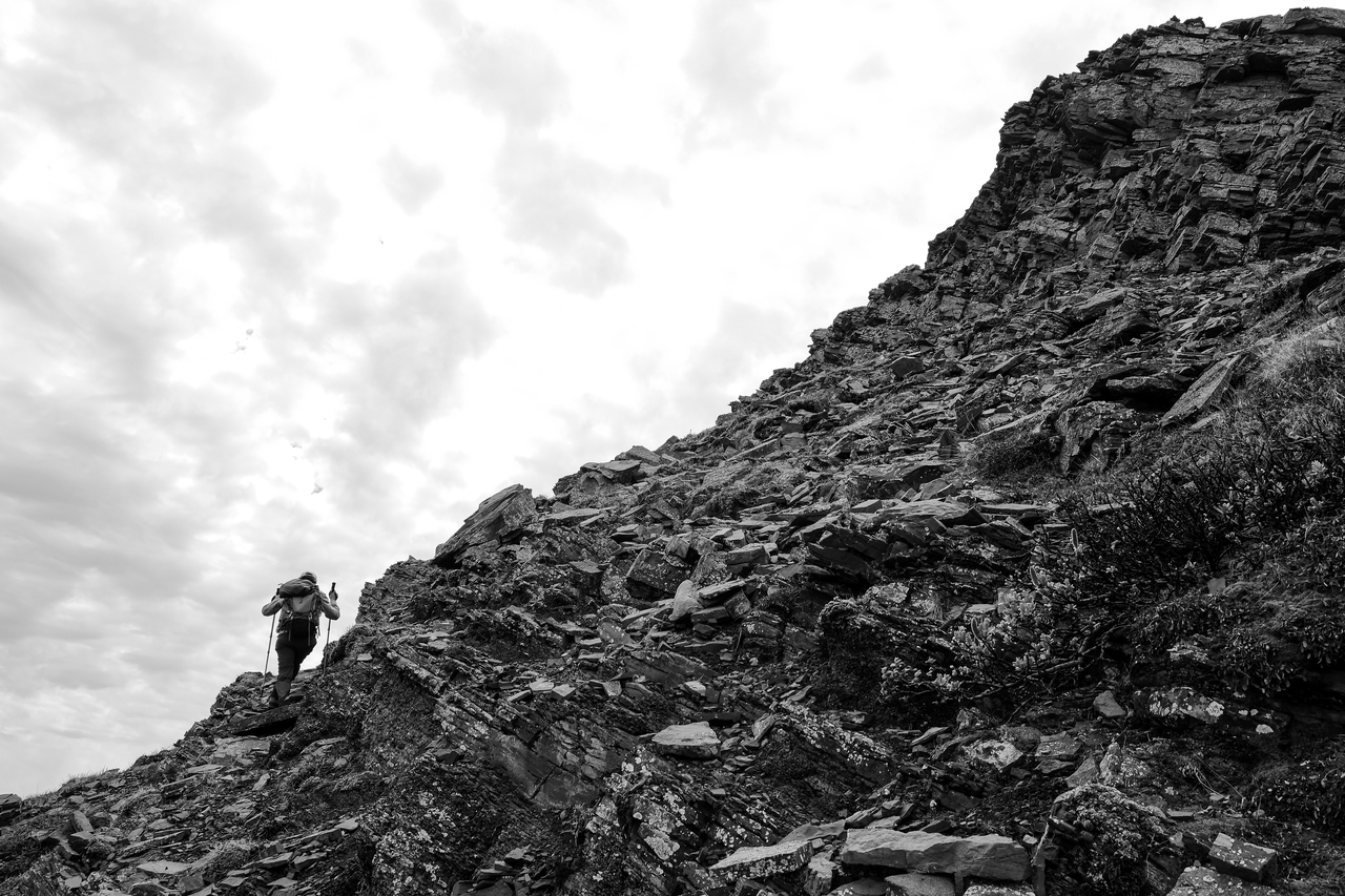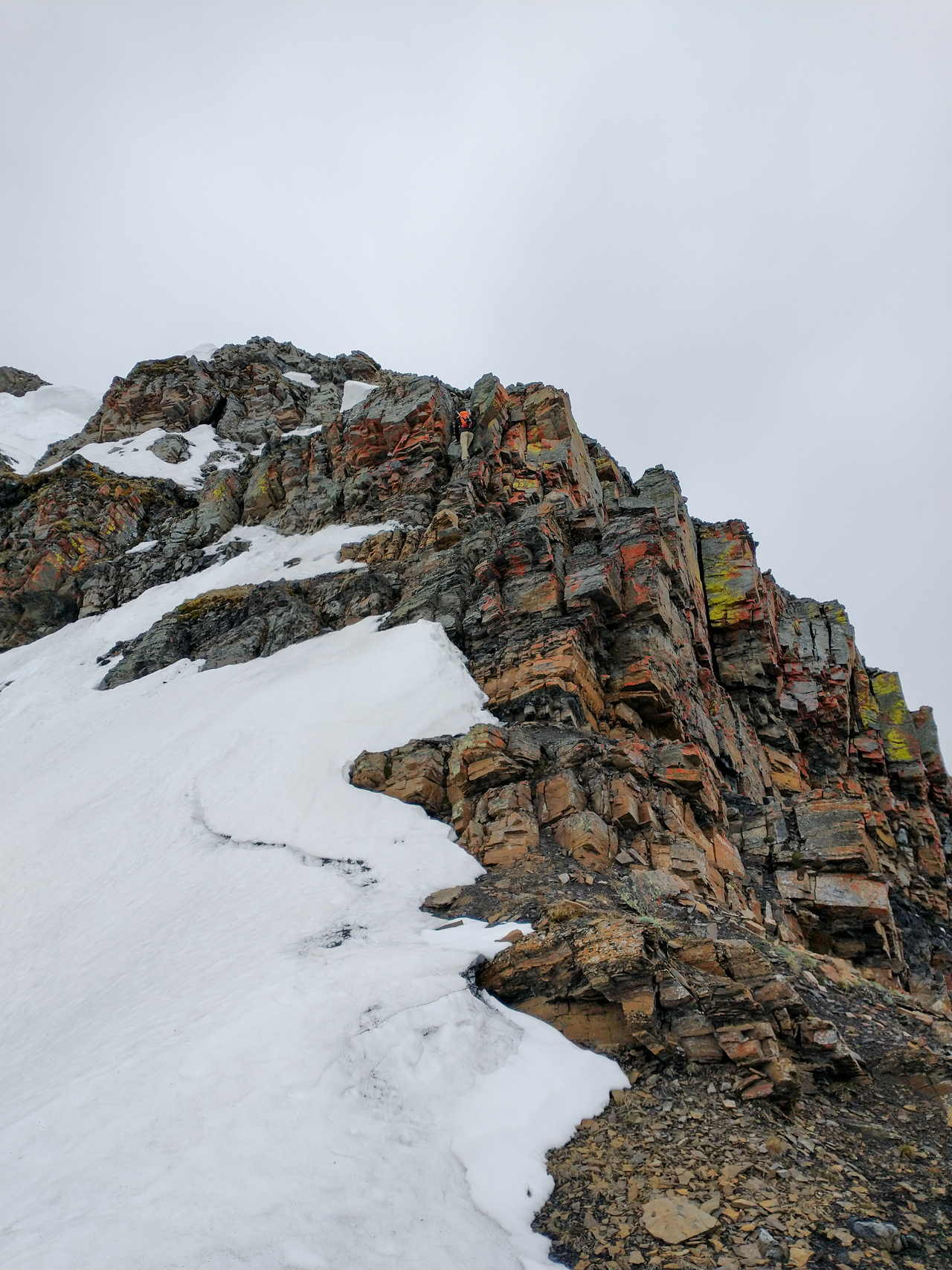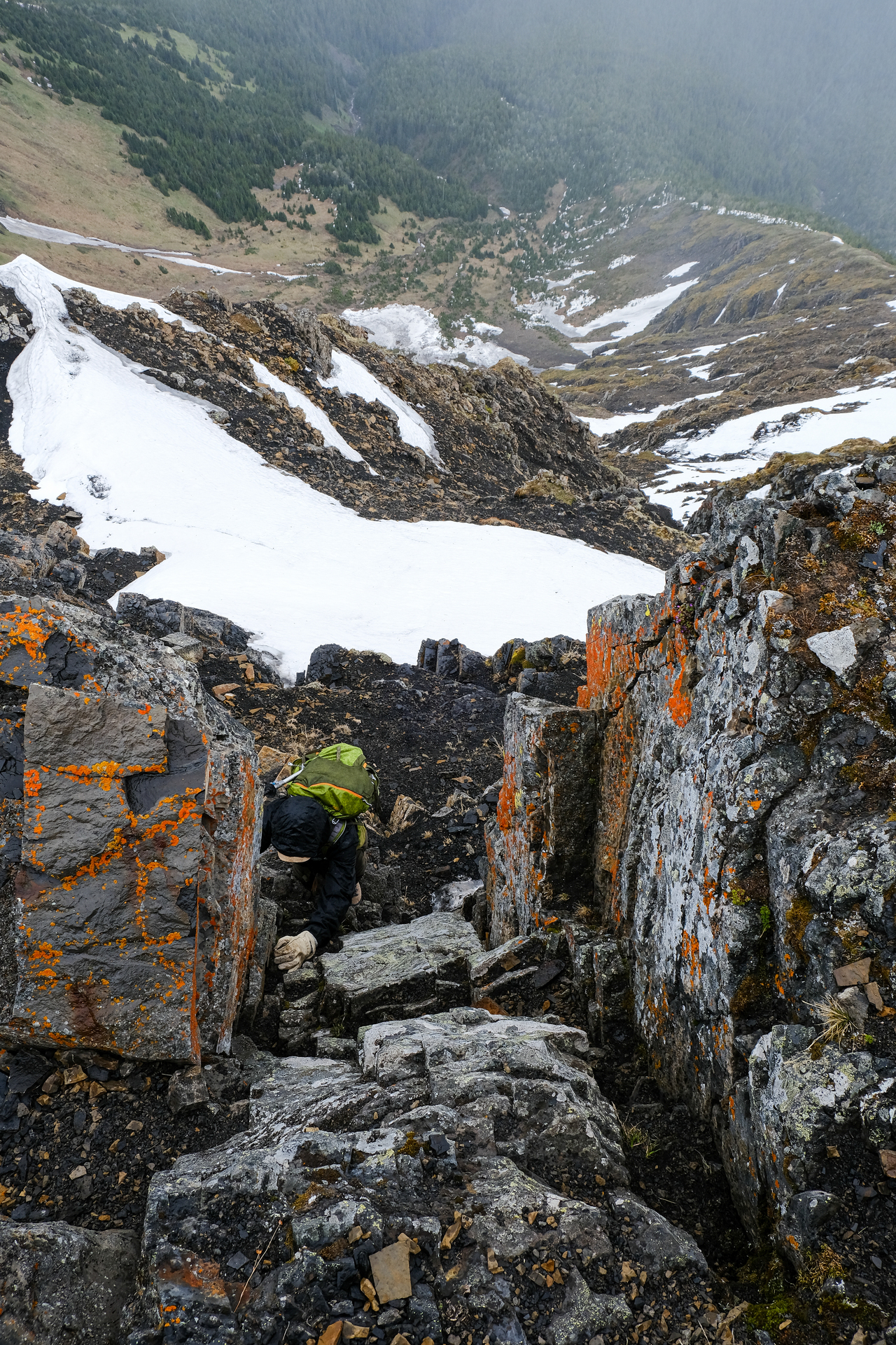 SHOOT! My heart sank as I came up to the ridge, only to discover that the eastern slopes were still loaded with hard, icy snow, exposed to a steep slope below! I stood there for a moment in dismay, but we'd already come all this way, so you better bet I still wasn't about to give up! The storm that had been lingering around all morning finally decided to hit us (perfect timing...😑) and the wind picked up, pelting rain at our faces and making the rock slick! Definitely not ideal conditions for route finding, but despite all this, I was still determined, and went to stick my nose into the blocky cliffs ahead (note my orange backpack, almost at the top of the rock band). Photo credit: Dad