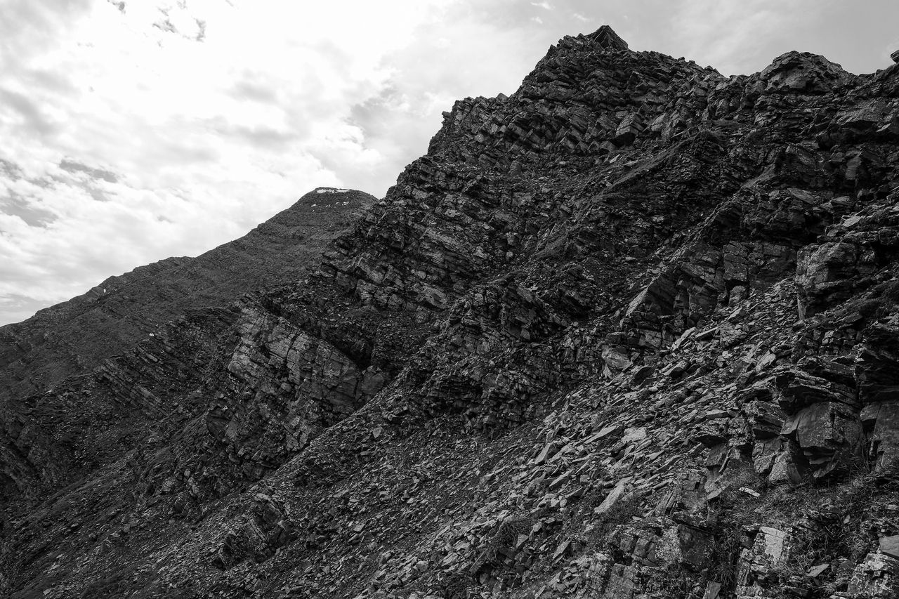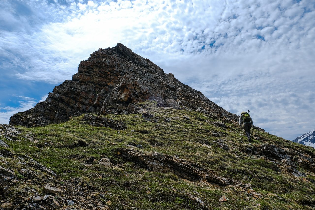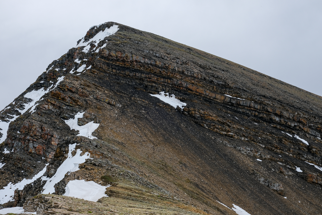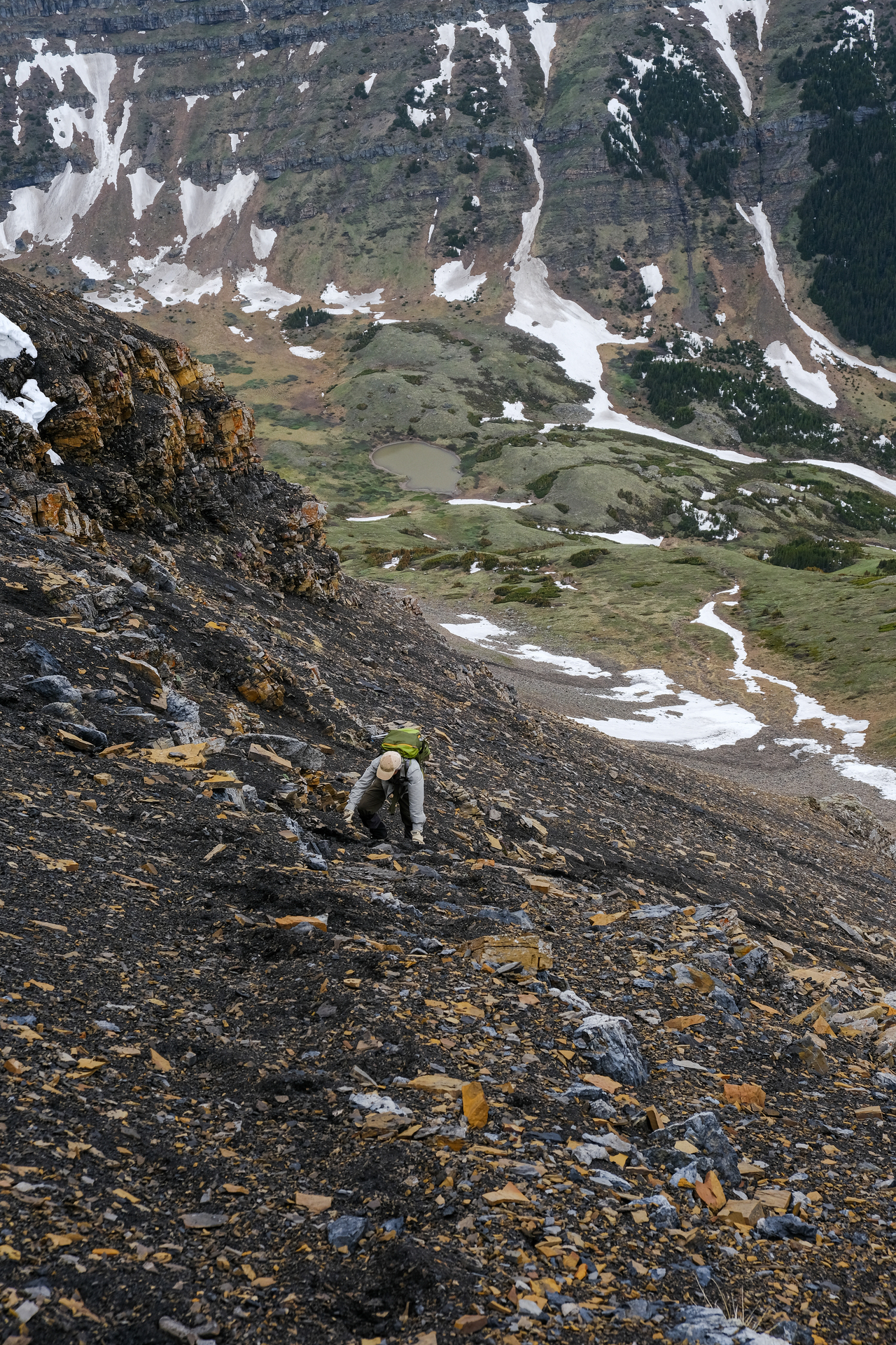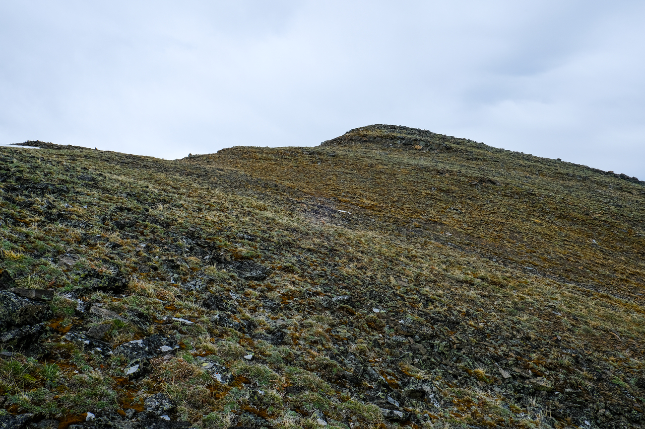 Not about to give up without taking a closer look, we started up the steep, soft scree below the cliffs, aiming for the ridge crest. I desperately hoped that the eastern slopes would present some possibilities...