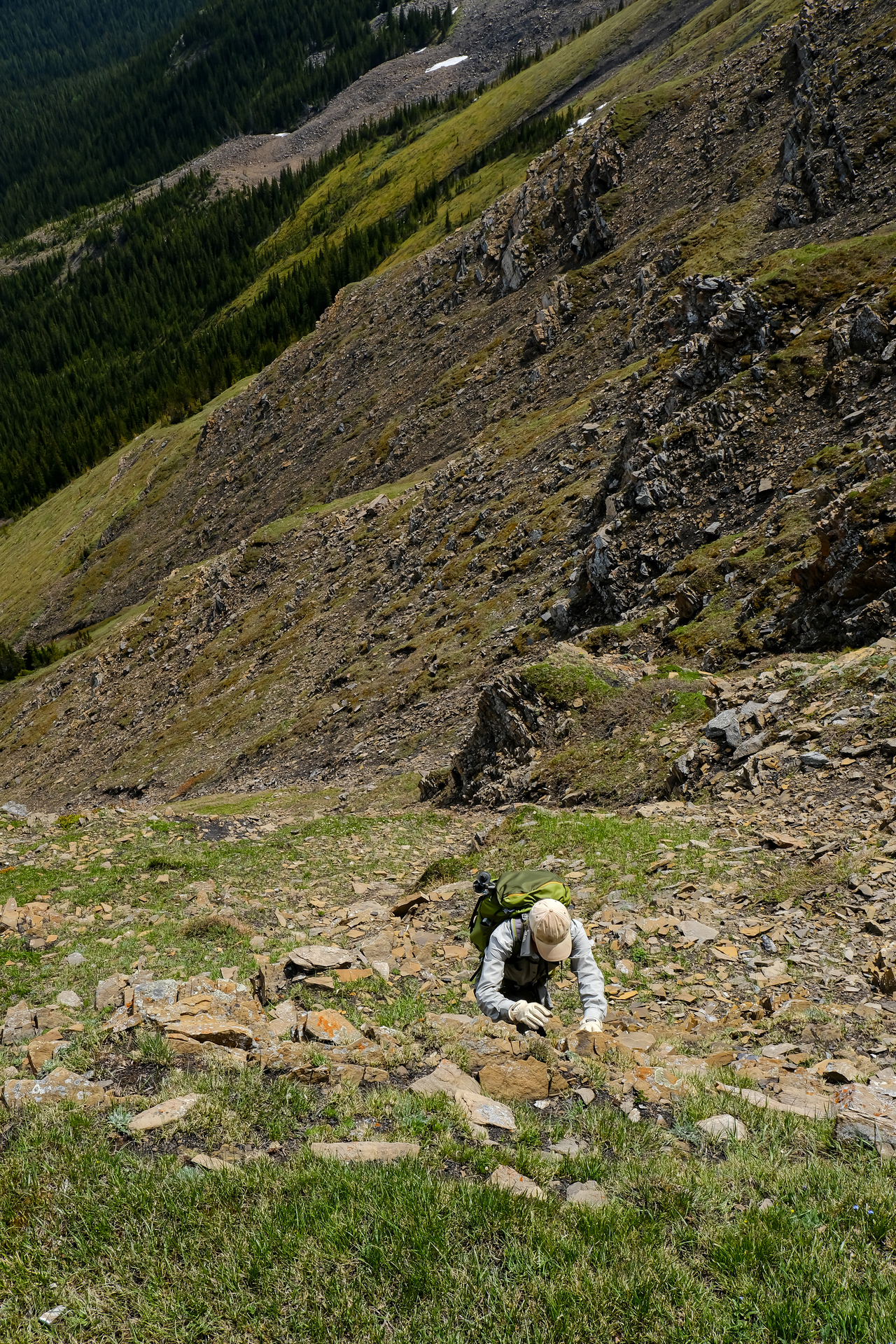 We immediately determined that traversing the eastern slopes was definitely not the way to go, and scrambled up easy to moderate (depending on route) "steps" back up to the ridge. Photo credit: Dad