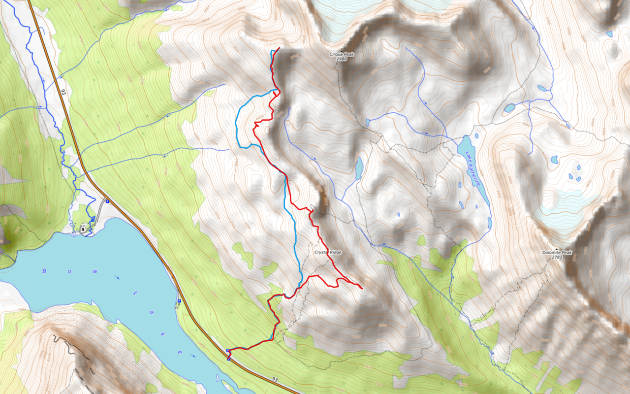 At this point, we found ourselves on climber's right of Crystal Ridge's summit...So why not start by ascending to the southeast summit and then traverse the whole ridge?! Much to my dad's dismay (he really just wanted to sleep) I always seem to find ways to lengthen the day...Sorry dad! This was our approximate route to the southeast summit, followed by our traverse towards the true summit.