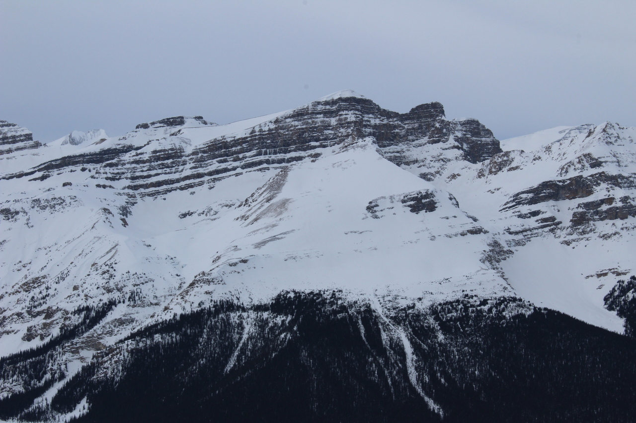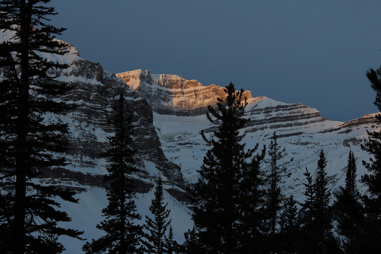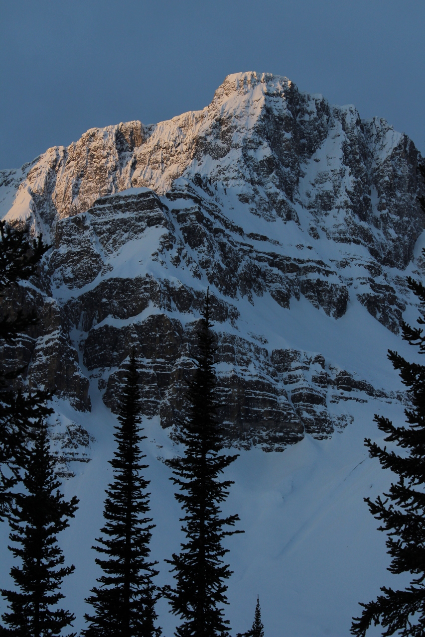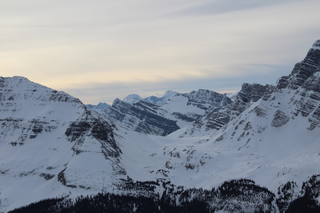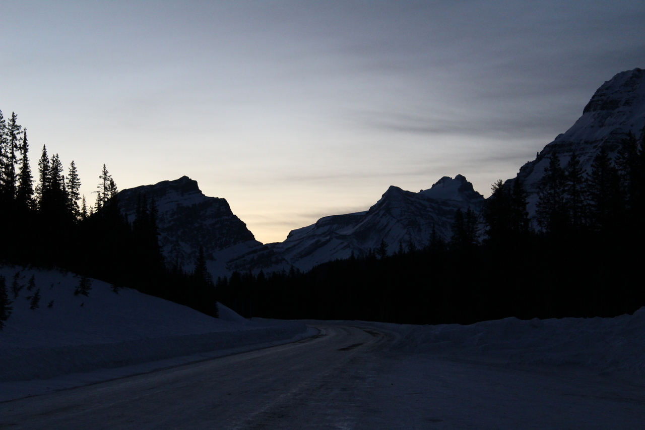 Mount Andromache, Little Hector, and Mount Hector at dawn, from the pull-off (YAY! It's plowed!) across the highway from Helen Lake parking lot.