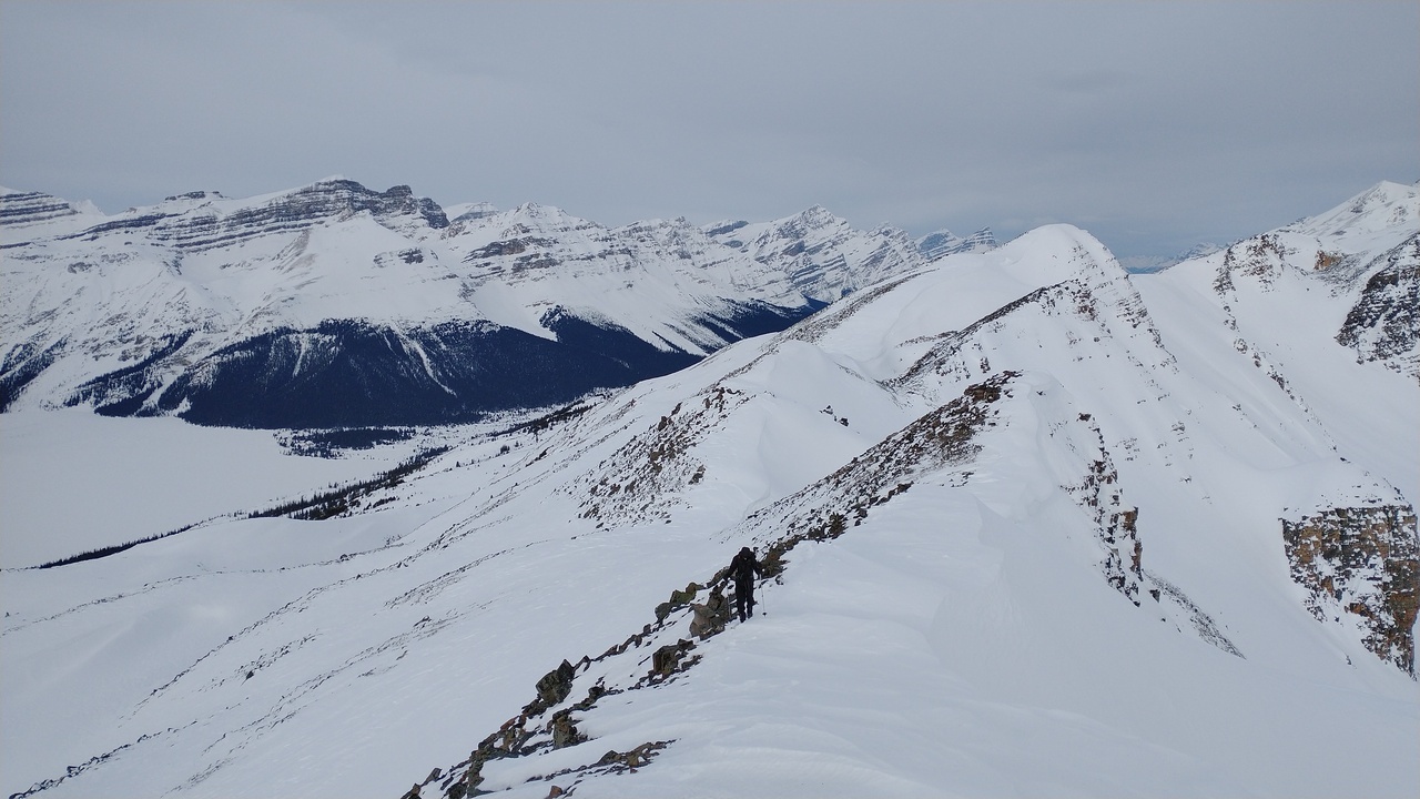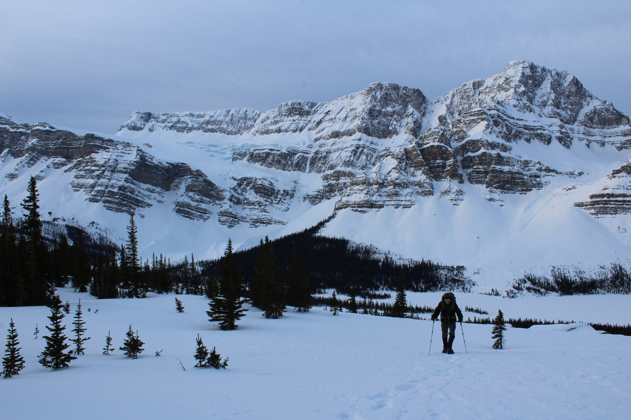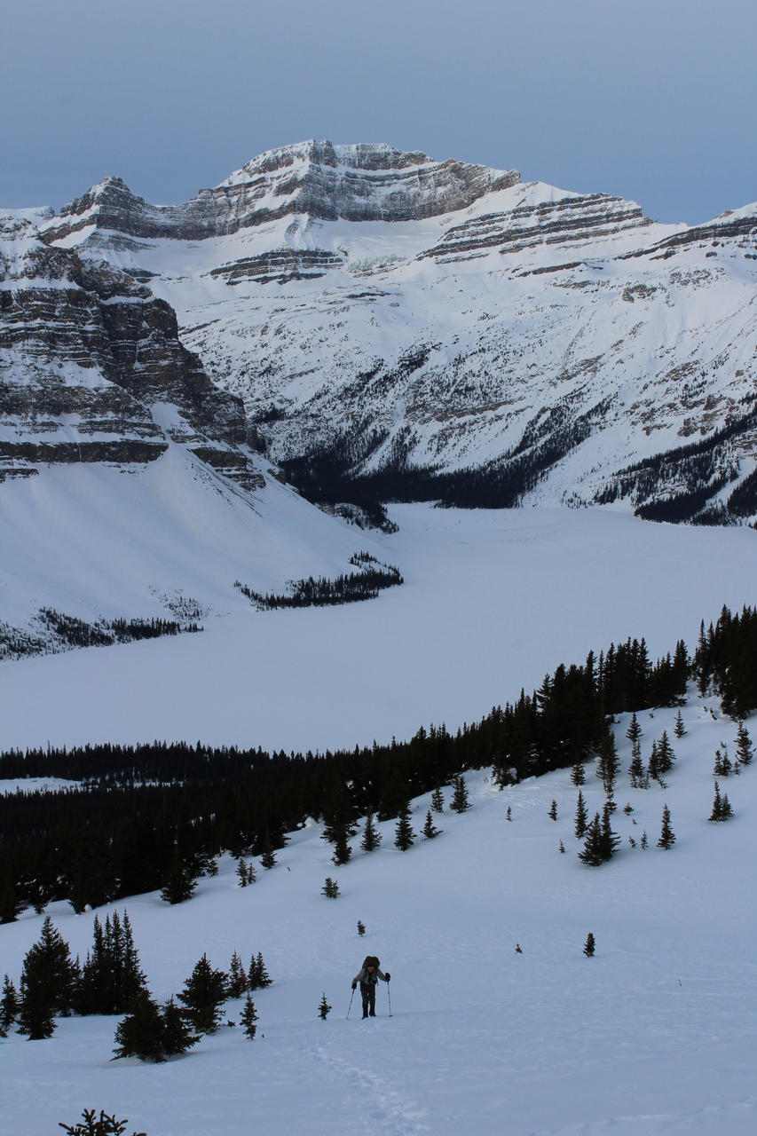 My dad ascends past the treeline, dwarfed by Portal Peak and Mount Thompson, rising above the blank, white canvas of snow-covered Bow Lake!