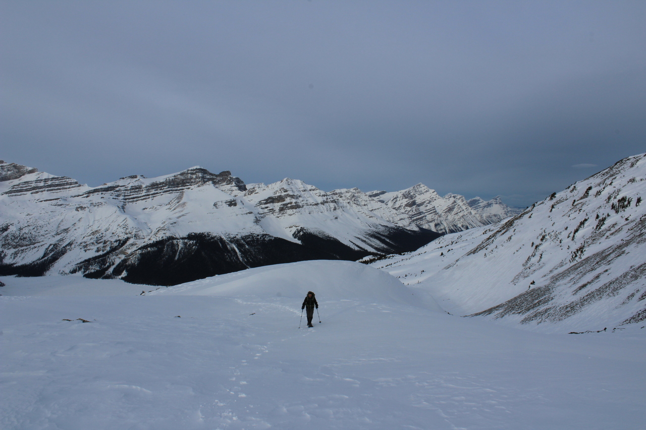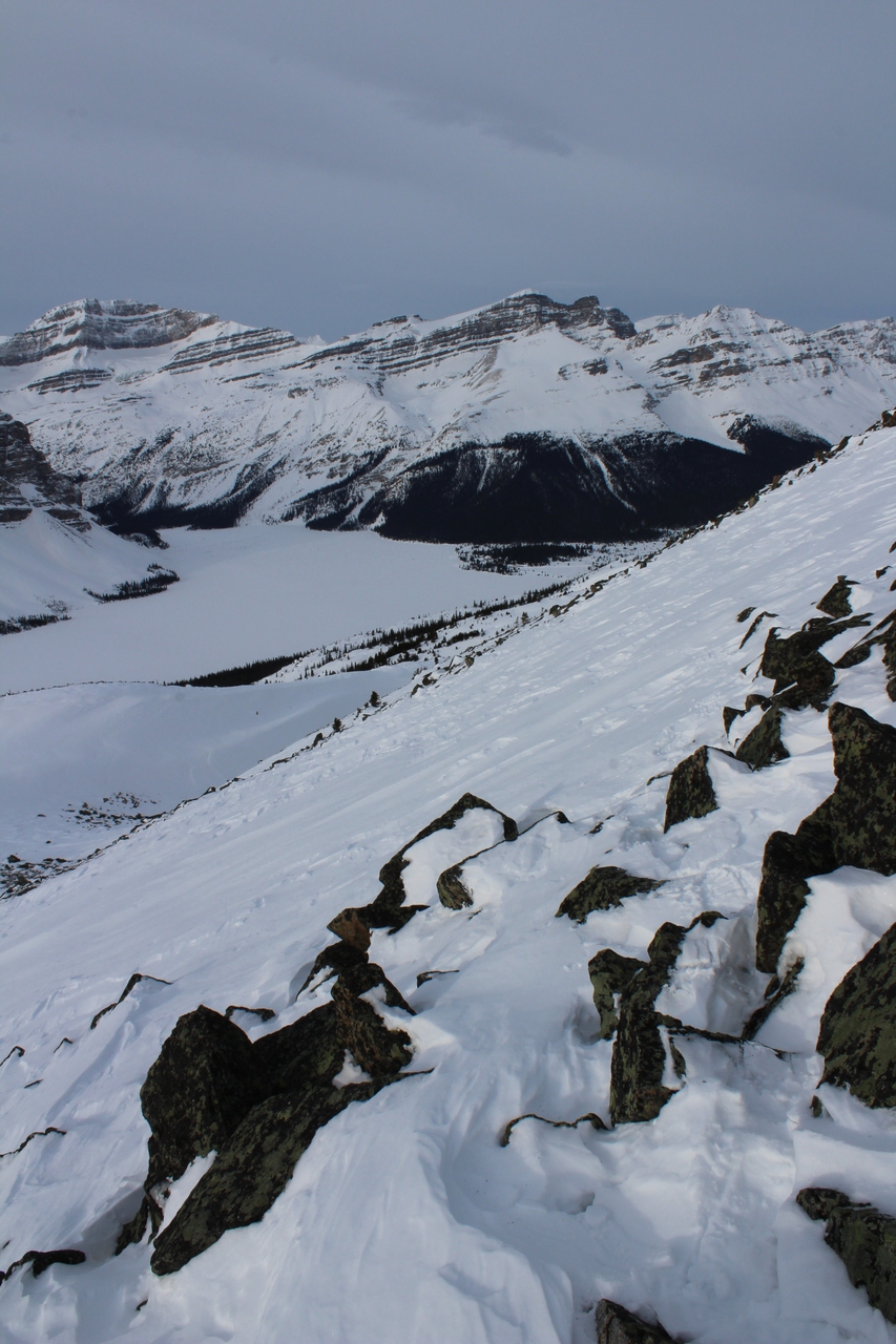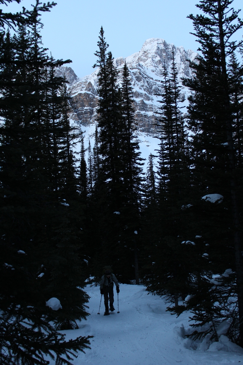 My dad ascends past the treeline, dwarfed by Portal Peak and Mount Thompson, rising above the blank, white canvas of snow-covered Bow Lake!