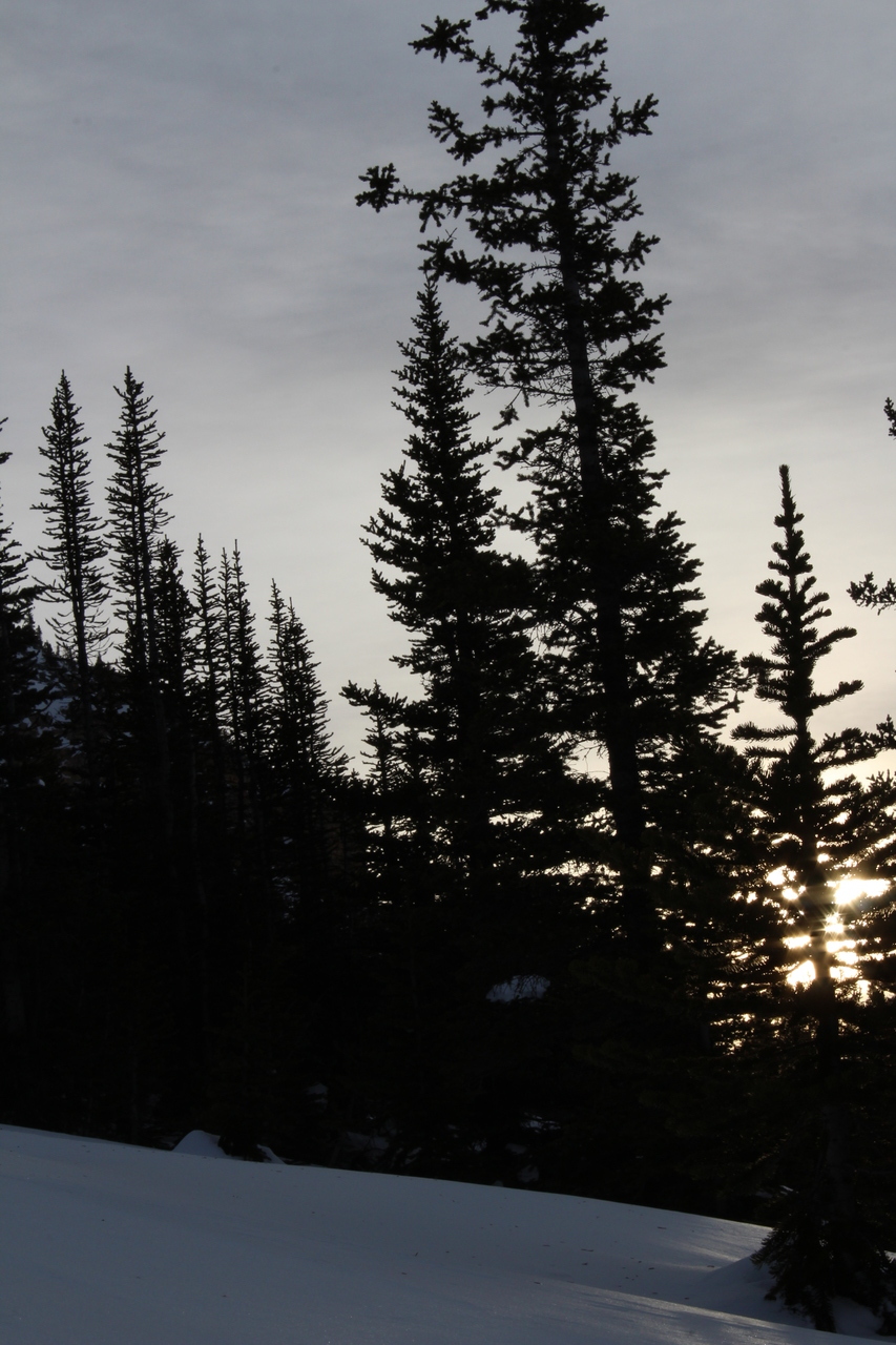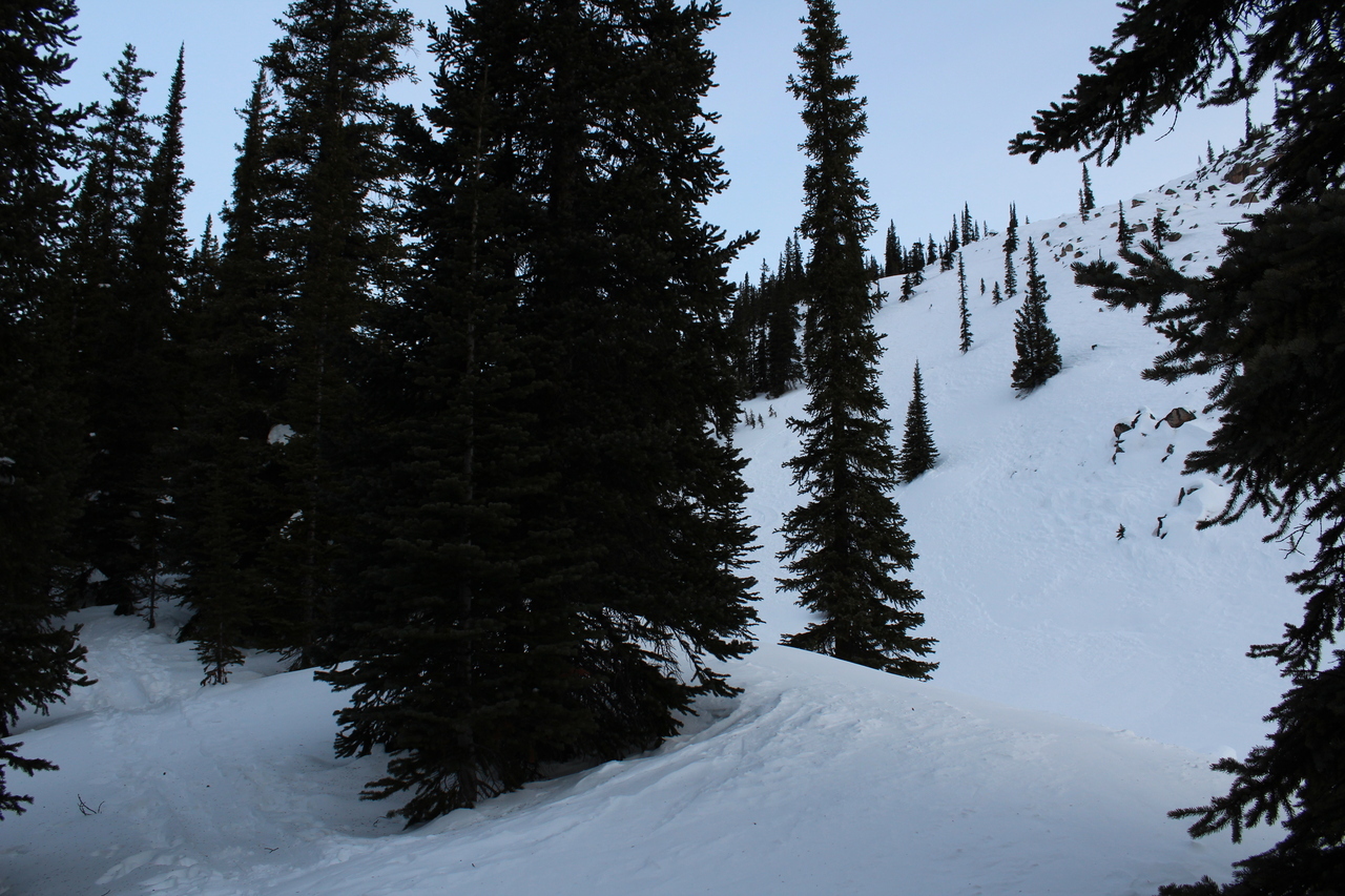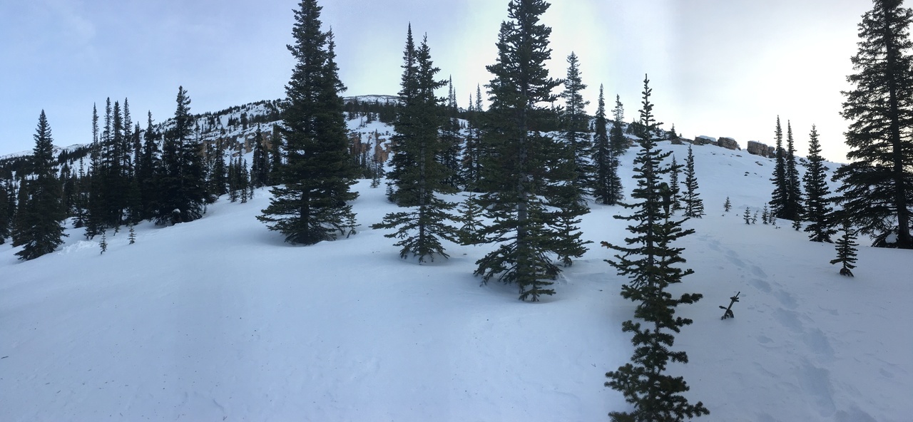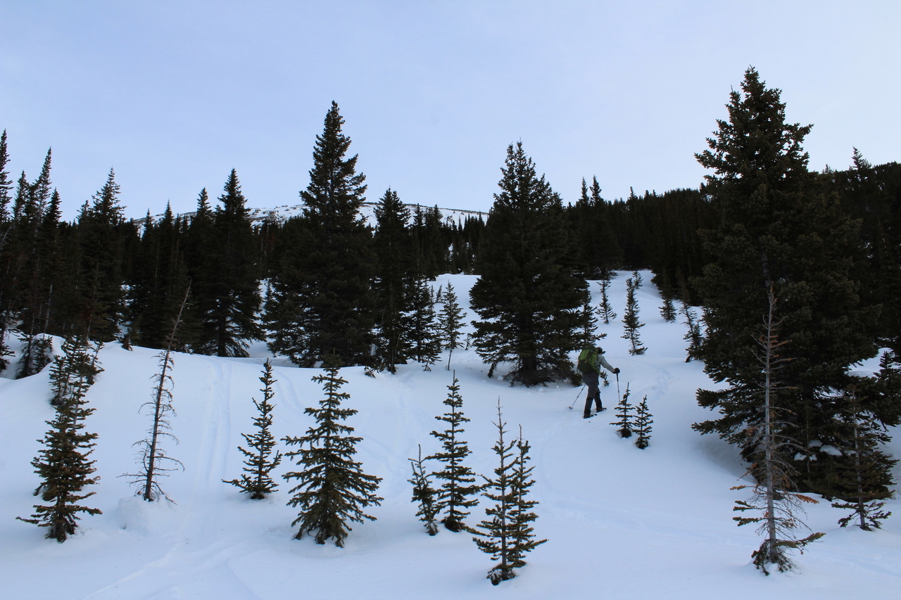 Continuing up gentle treed slopes. Note the various ski tracks coming down (some of which we often chose to follow).