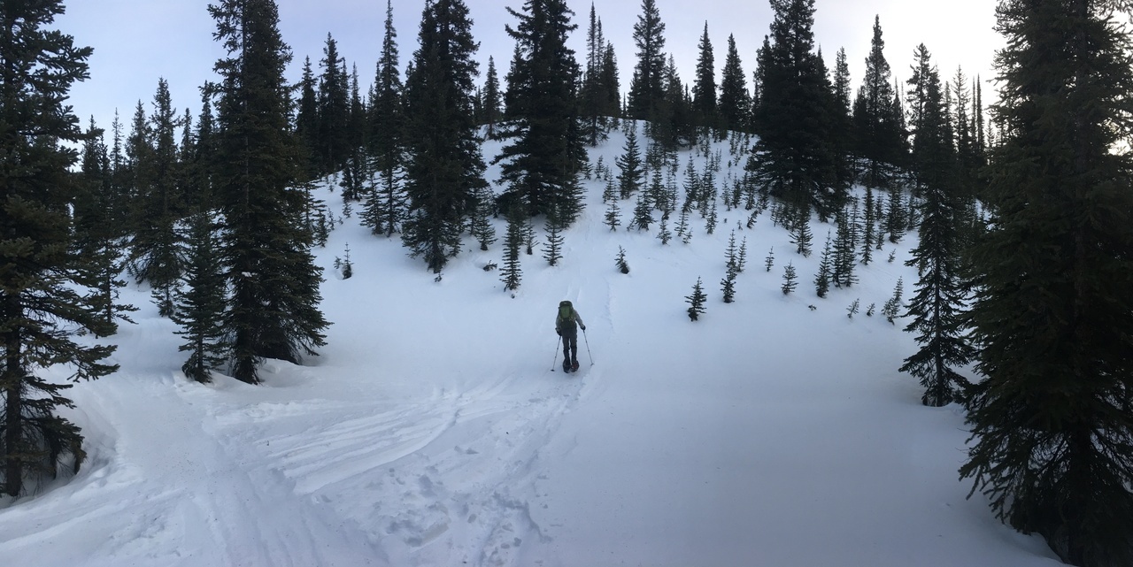 The beginning of our ascent was very straightforward, easily following previous tracks through the light forest. Here, we traversed to climber's left, to avoid the steeper slope above.