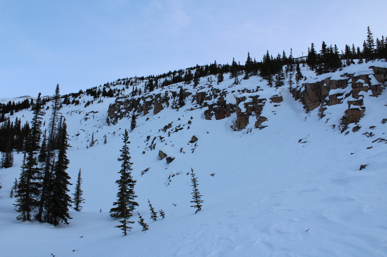 Eventually this short cliff band stands in the way, but can be easily overcome on gentle terrain around the right side.